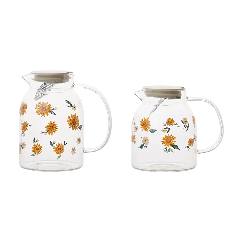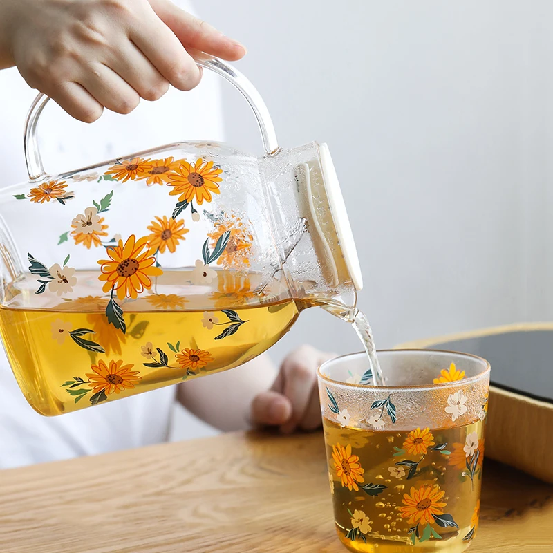 JINYOUJIA-Sunflower Pattern Набор чайников из боросиликатного стекла, термостойкий чайник, чашки для воды, офисный домашний чайник для холодного сока, 1 л