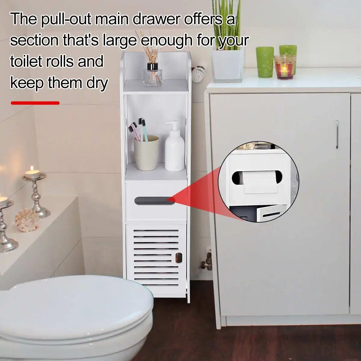 -Выдвижной основной ящик имеет секцию, достаточно большую для рулонов туалетной бумаги и сохраняет их сухими.
