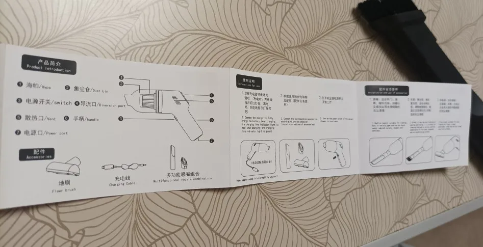 Заказ доставили очень быстро в Магнитогорск за 7 дней. В обычном пакете коробка целая не мятая, о пылесосе могу сказать что очень не хватает кнопки реверса, мощности всасывания хватает на мелкий мусор вполне, инструкция на китайском и английском языке, на рисунках показано что фильтр можно промывать сушить и использовать дальше, но мне кажется желательно купить доп. фильтры, для небольшой уборки в салоне автомобиля мне кажется хватит вполне. В комплекте так же не сколько насадок и шнур для зарядки, будем использовать время покажет.
