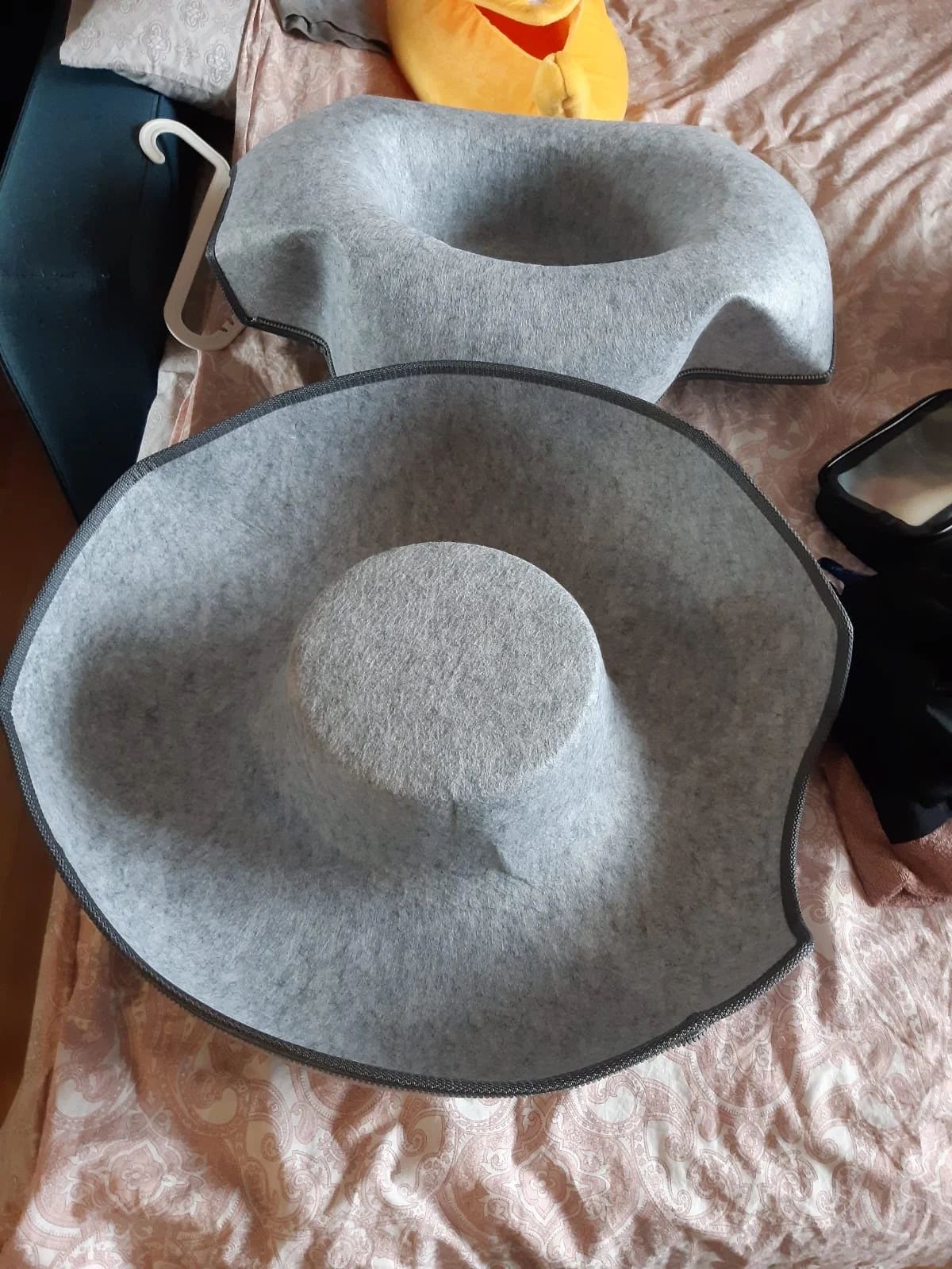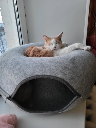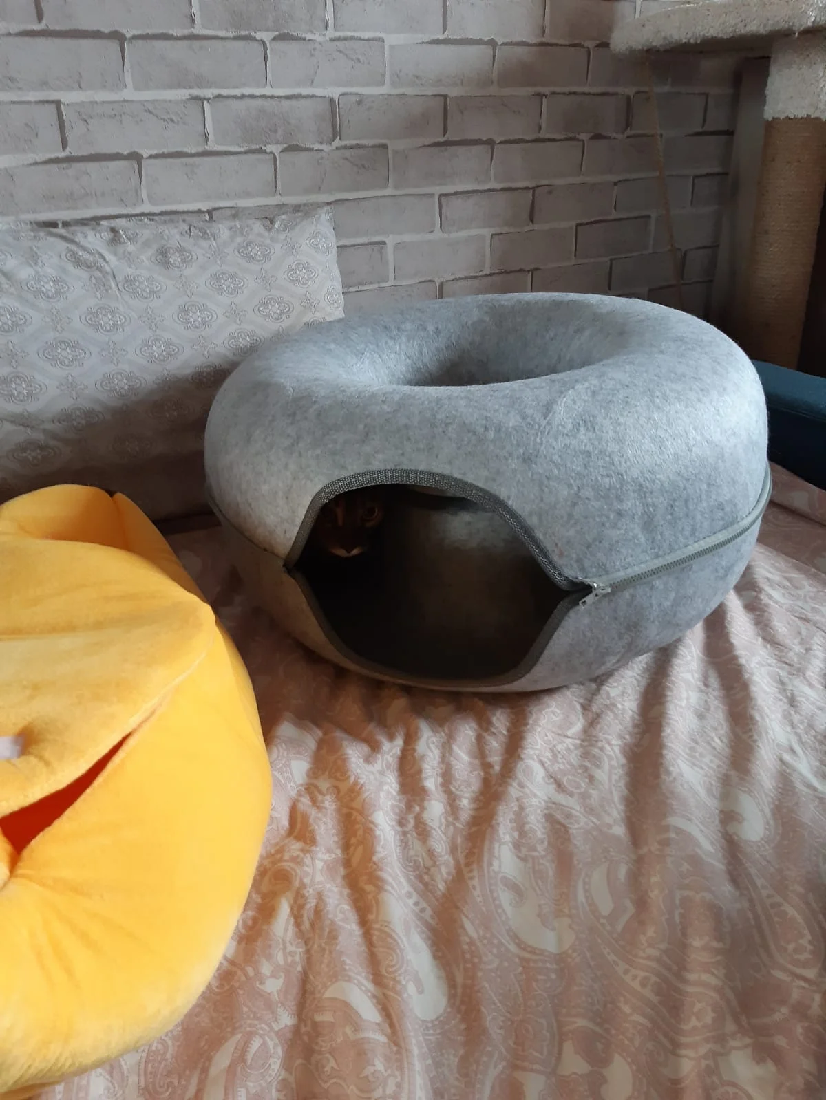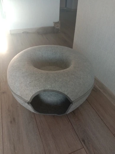 Вещь супер. Очень хорошее качество, все швы прочные. Молния не застревает. Кот счастлив. Он не вылазит из бублика. Закинула ему шарик, часами его гоняет по кругу. Уединяется, прячется, спит в нем. Маломерки. У меня бенгальский кот, 6 кг. Заказала самый большой размер. Остальные были бы тесными. Пришел в смытом состоянии, но выпрямился очень быстро. Очень плотный. Держит форму. Сама на нем лежу. Рекомендую всем. Спасибо большое продавцу за такую игрушку