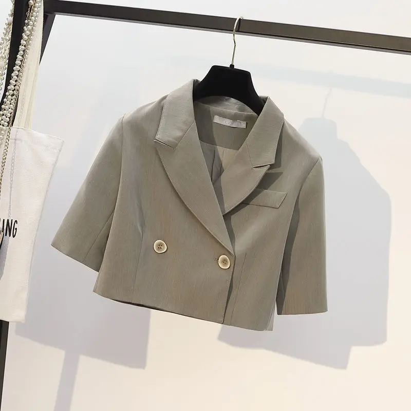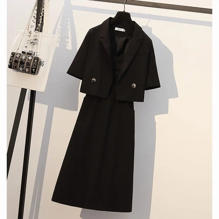 Женский костюм из двух предметов, короткий пиджак на пуговицах с коротким рукавом и воротником-стойкой и платье на бретельках, лето 2024, O47
