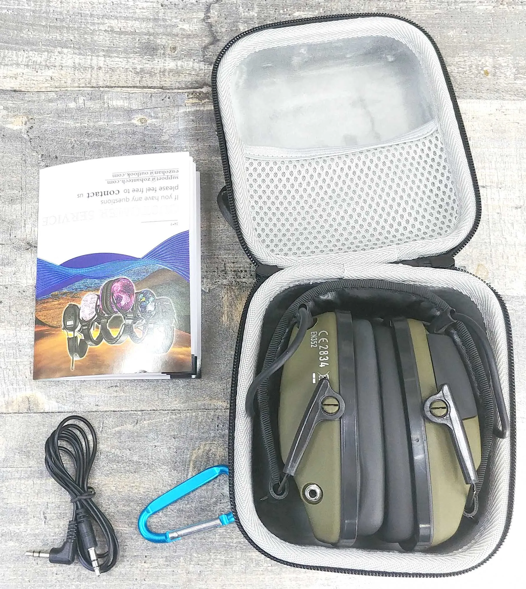 очень быстрая доставка,меньше двух недель, очень хорошая упаковка,очень качественный товар от коробки до наушников, комплект:кейс аux шнур,мануал на англ.,карабин,;наушники очень комфортно сидят на голове и очень компактны, мега мощный и жёсткий футляр прям настоящий защитный кейс,сами наушники работают, насколько на выстрел работают не проверил ещё ,проверю допишу,звук телевизора с соседней комнаты усиливает,регулировка громкости работает плавно,если выключить работают как обычные строительные наушники, все сравню проверю и дополню,продавец общительный быстро отвечает, по доставке даже не пришлось говорить,заказал и очень быстро получил в постамат в 5ке,заказывайте в кейсе ,советую и товар и продавца пять звёзд однозначно