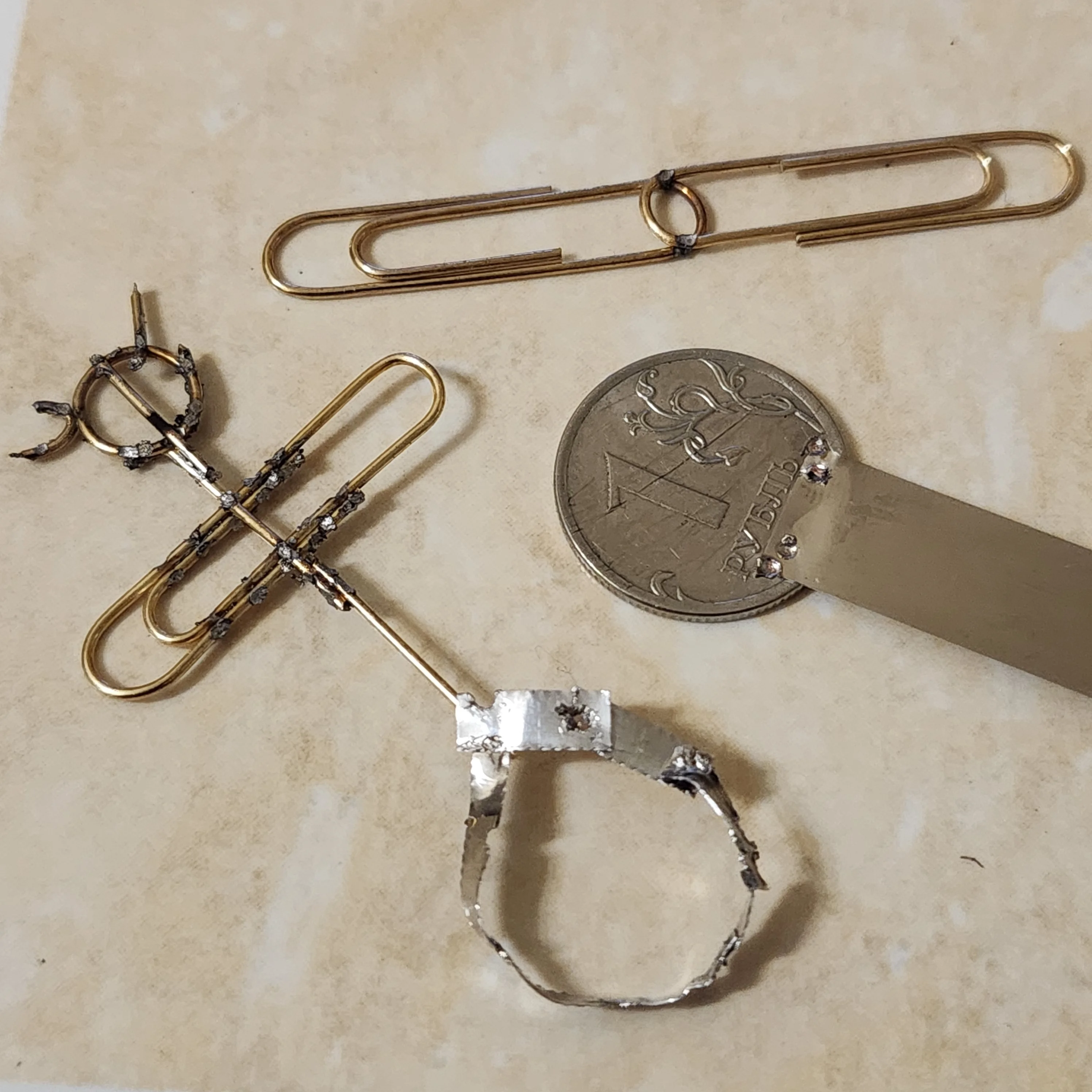 Аппарат приехал быстрее, чем обещано! Всё в целости, сохранности, упаковка , комплект, работоспособность, супер! Сразу попробовал приварить хомут к монете 1 рубль!!!))) Варил тремя прихватками! Получилась модная печатка! Попробовал на разрыв сварного соединения, примерно на 5кг держало, при сгибании раскачивании оторвалось не сразу! Очень понравился девайс! Спасибо!)
