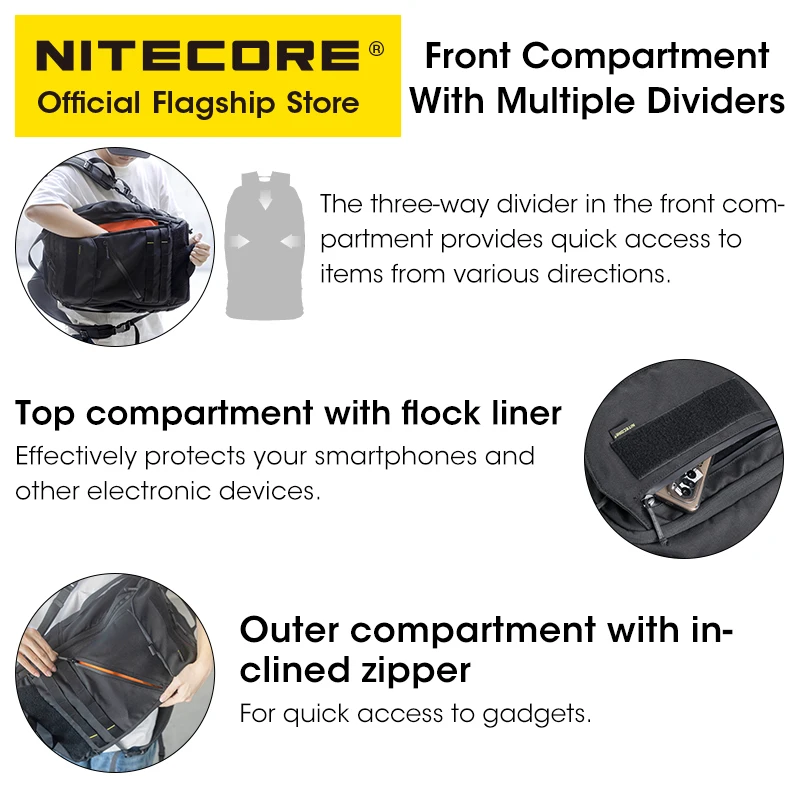 Один из лучших универсальных пакетов от nitecore. Есть много внутренних карманов и карманов на молнии, поэтому вам не нужно иметь сумки-органайзера. И есть 2 основных отделения, которые достаточно просторны для ноутбука и других вещей для нужд EDC.
