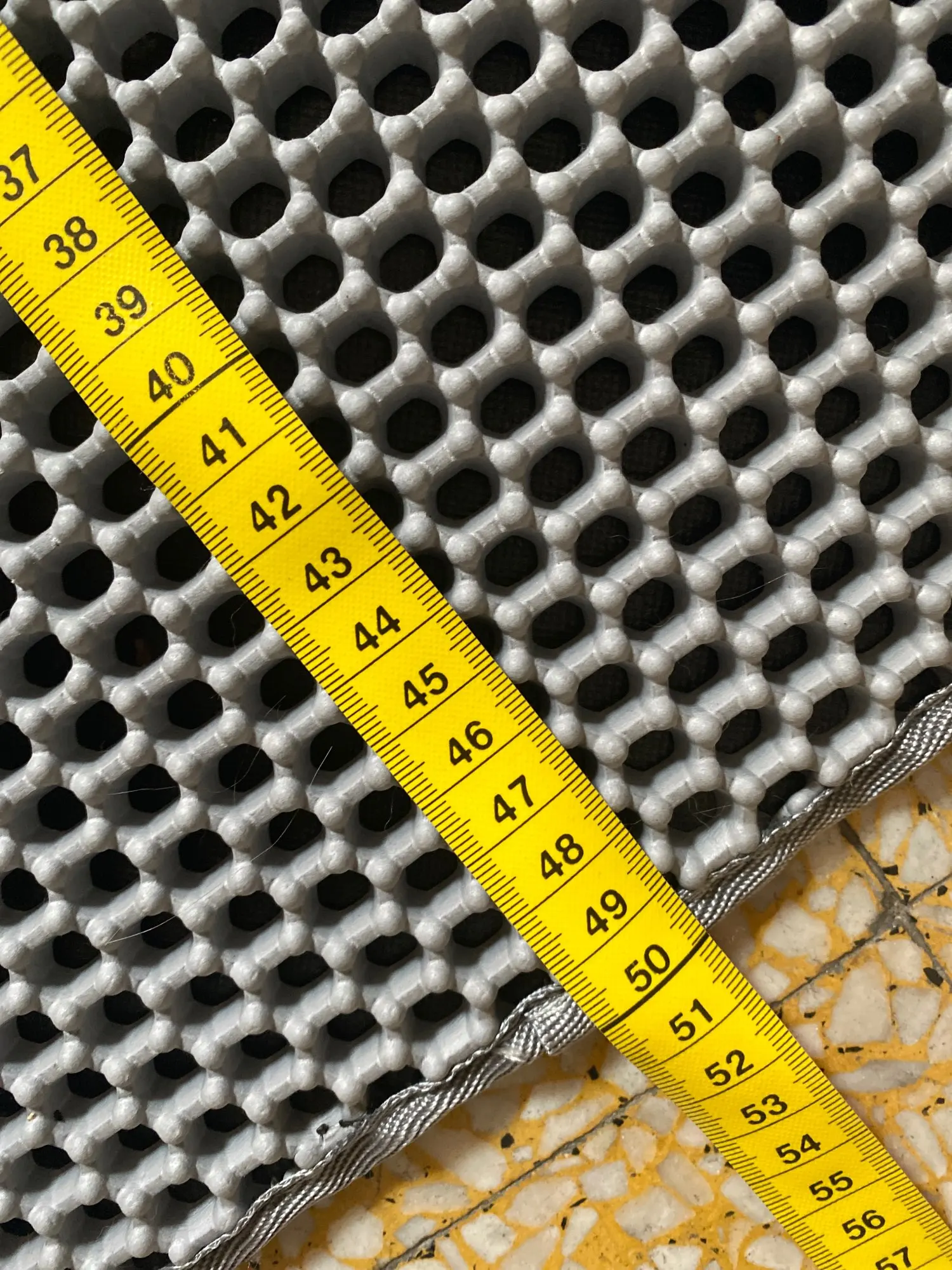 Материал похож на полистирол. Возьмите 40x50 см или больше, потому что он слишком маленький, а шнурок идет по бокам. Это практично, это выглядит красивее, чем иметь судебный процесс везде на земле. Размер соблюдается