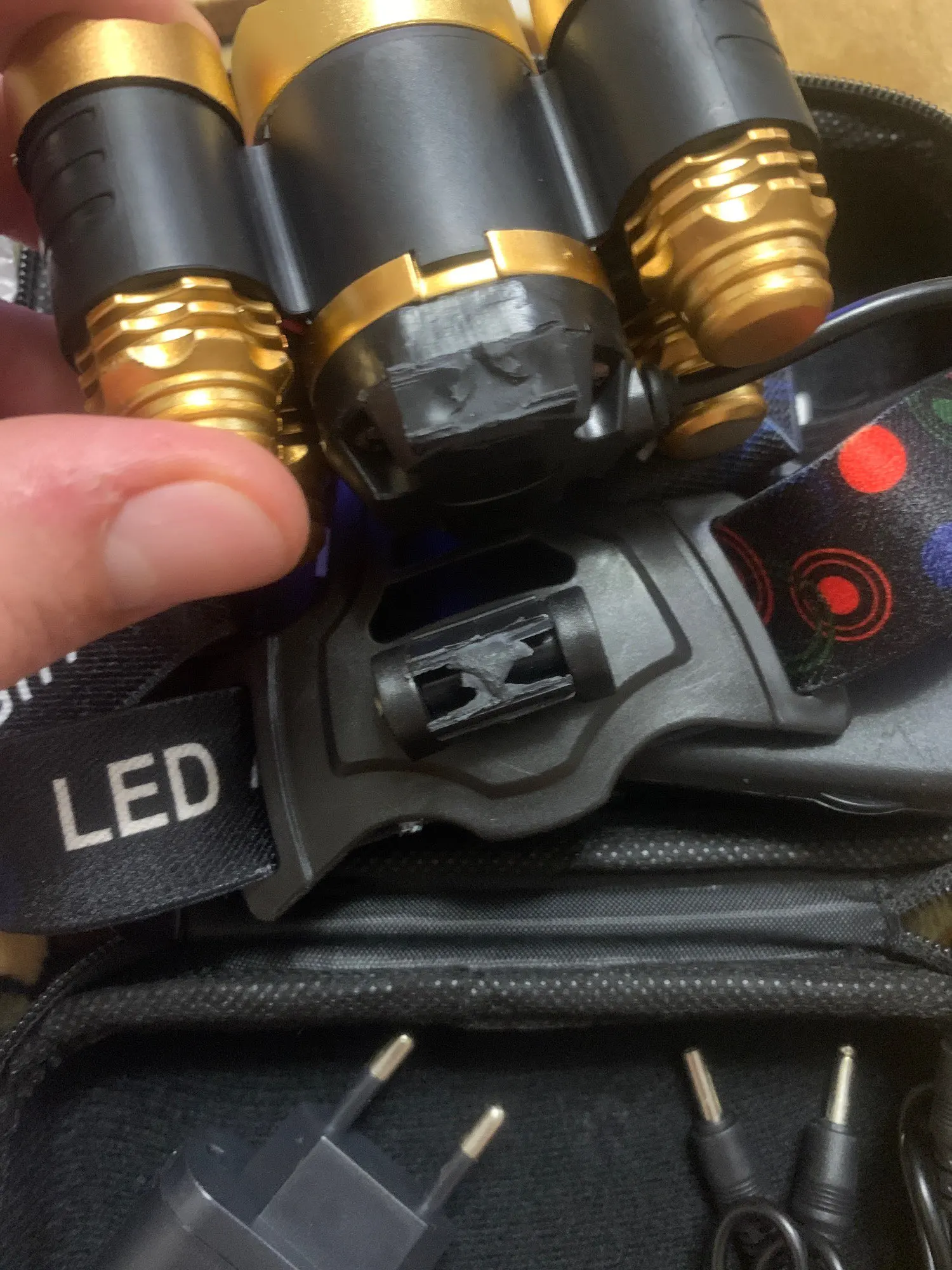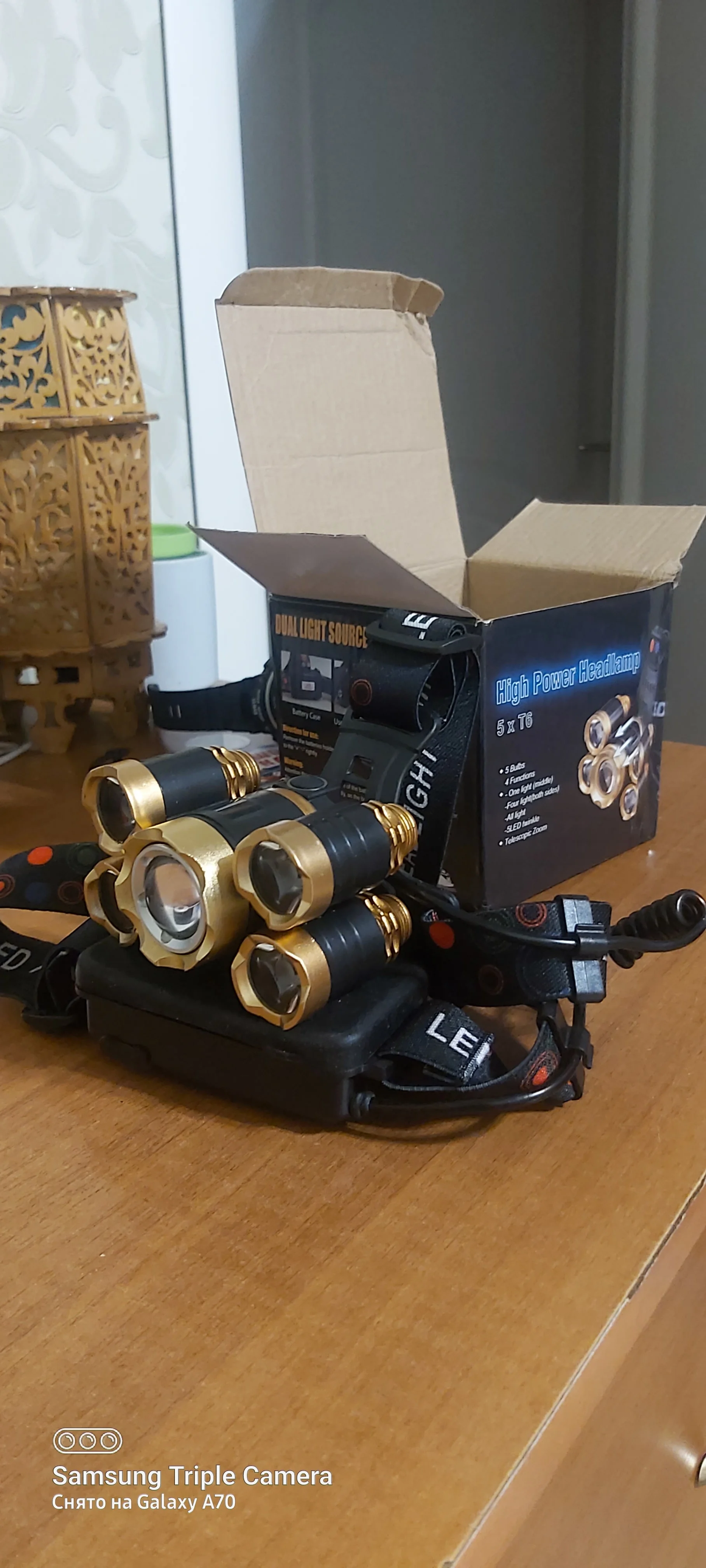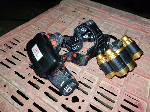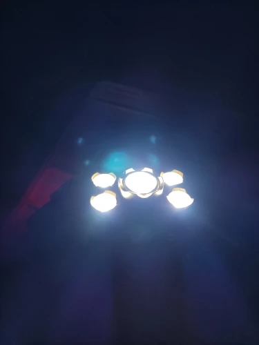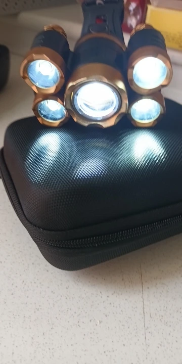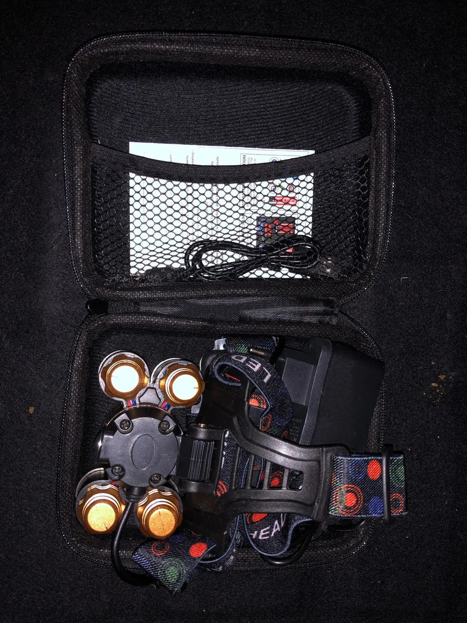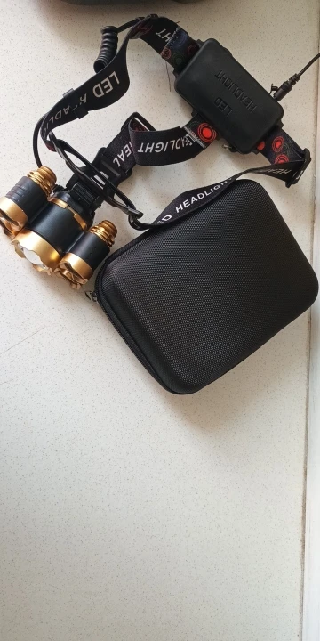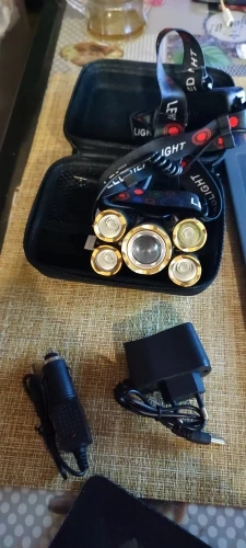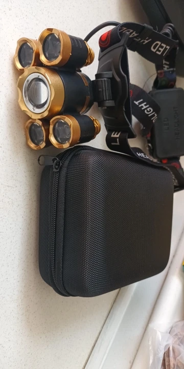 Хороший фонарь. Покупаю всегда именно эту конструкцию. Имеется пять режимов: выключено, горит центральный фонарь, горят четыре маленьких фонаря, горят все пять фонарей, режим стробоскопа (sos). Два аккумулятора расположены в коробке, которая располагается на затылке во время переноски. В этой же коробочке расположен красный светодиод, который светится во время работы. Это вероятно это сделано для безопасности, чтобы находящиеся сзади люди, могли в темноте увидеть наличие фонаря. В комплекте имеется бокс на молнии, блок питания (зарядка), кабель для зарядки, аккумуляторы).