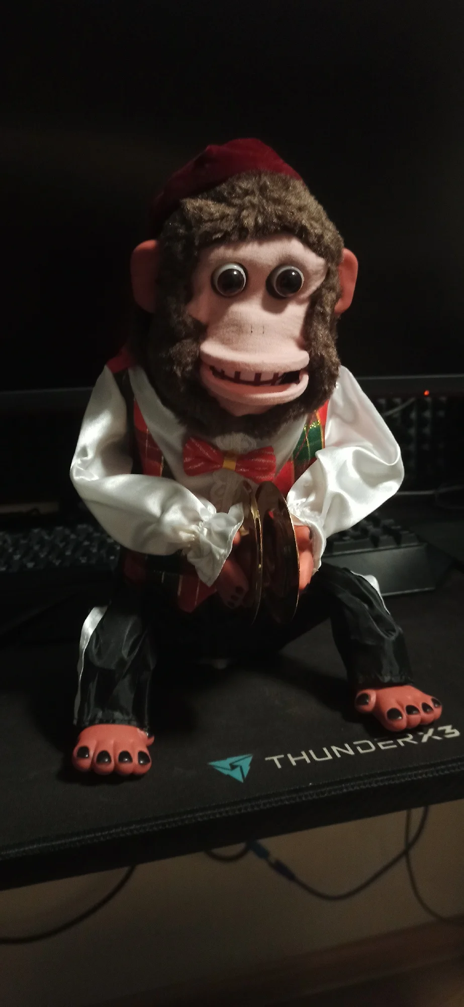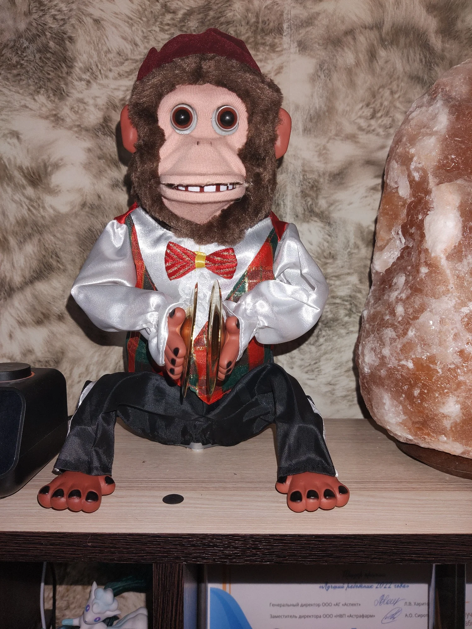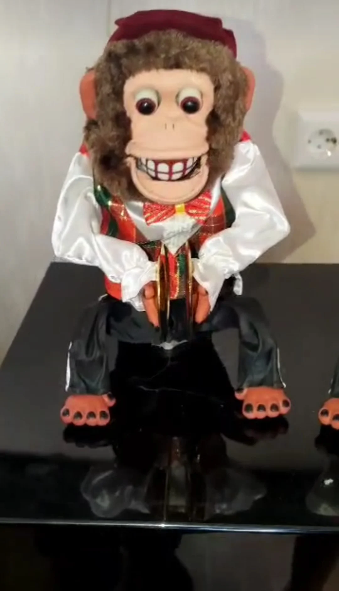 обезьяна отличная! при включении дети кидаются подушками, кошки залезают под диван и вибрируют вместе с ним. Звук тарелок пробирает до костей, а визг вызывает искреннюю ненависть к этому созданию! короче это именно то, ради чего заказывал! в восторге!