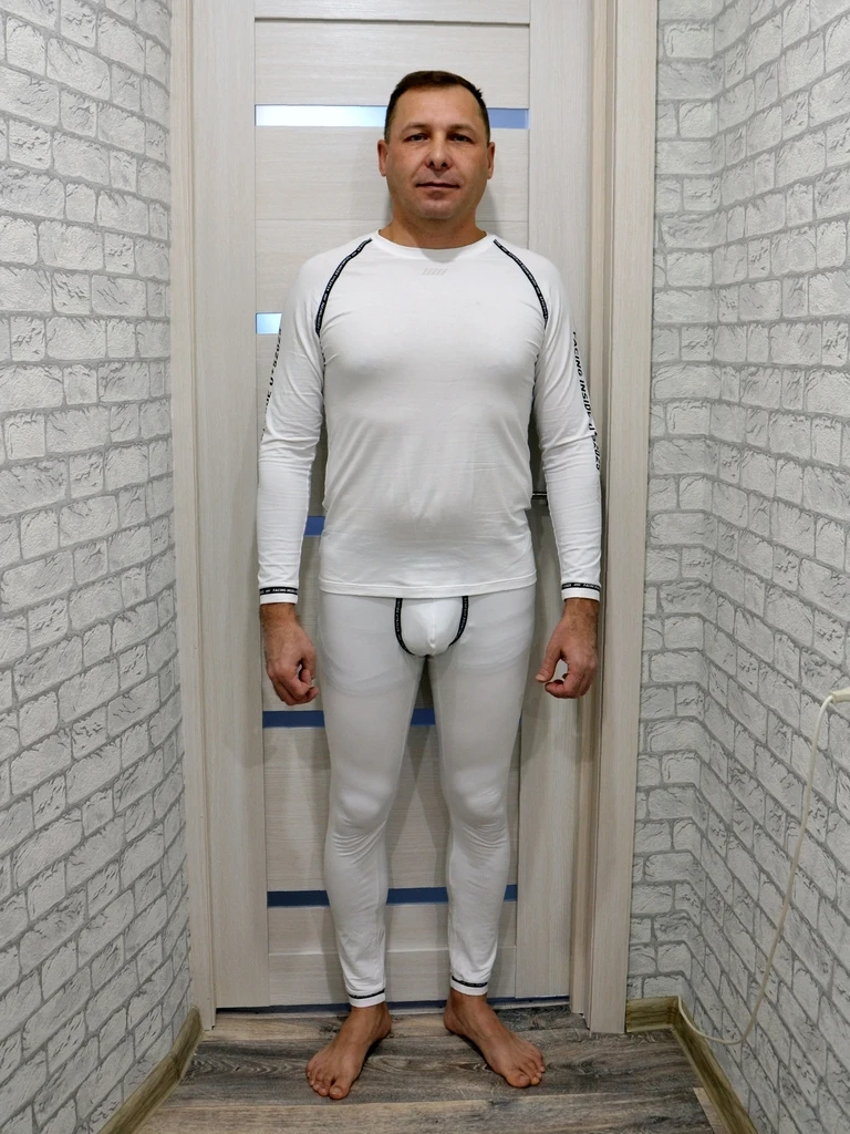 Мой рост 171 см., вес 80 кг., размер 52, заказал размер XL Рост угадал, а размер не угадал, надо было на 1-2 размера больше брать. Верх на 1 размер больше, а низ на 2. Кстати обратите внимание не только на мои фотки, но и на фото других покупателей. У них тоже верх висит, а низ в обтяжку. Но я все равно пробовал несколько дней носить это термобелье. В принципе футболка мне пойдет, хоть у нее и образуются складки на груди и подмышках, что говорит о маленьком размере, но дискомфорта никакого нет, можно носить. А вот трико сильно в обтягивает, неприятно, раздражает, уже через некоторое время хочется его снять. Если на ноге образуется складка, то сама она не разгладится. Надо спускать брюки и вручную разравнивать складку. В итоге через неделю отдал термобелье отцу, он на размер меньше меня. Теперь о самом термобелье. Приходит оно в пластиковом пакете на зип-лок молнии. Цвет белоснежный, ткань тонкая, некоторые футболки толще бывают. Ткань сильно тянется, но не растягивается, после снятия принимает исходную форму, коленки не отвисают. Но конечно не знаю, что будет со временем и после стирки. Посмотрел по интернету, что за состав ткани. Ткань как раз для термобелья: модал для отвода пота, хлопок для тепла и спандекс для эластичности. Ткань очень приятная и нежная на ощупь, прям хочется носить. Термобелье очень тонкое, на мороз не пойдет, так, на небольшой минус. Но я его брал для физической работы при температуре -5+15 градусов, а в первую очередь, чтобы оно пот отводило. Для такой температуры я думаю оно в самый раз. Хотя прод рекомендует его на +5+15. Пошив качественный, нитки не торчат, все швы оверлок. Очень качественно все сделано. Зачем-то только гульфик сделали двухслойным, там же и так трусы будут. Из-за этого гульфик сильно торчит вперед. Прикольно конечно, когда я в одном термобелье, все ржут от этого. В одетых поверх термобелья брюках ничего не выпирает. Итого. Белье красивое, качественное, приятное на ощупь, из правильных материалов, очень тонкое, только на плюсовую температуру. Верх с низом не совпадают на 1-2 размера, футболка висит, трико в обтяжку. При выборе размера по таблице продавца рекомендую не ориентироваться на рост, а только на свой вес. Возможно я еще раз куплю это термобелье, только большего размера.