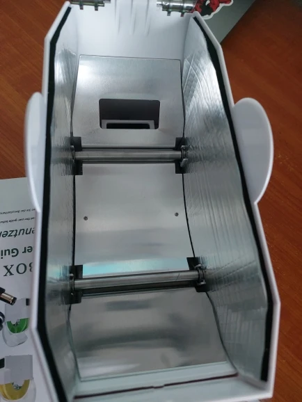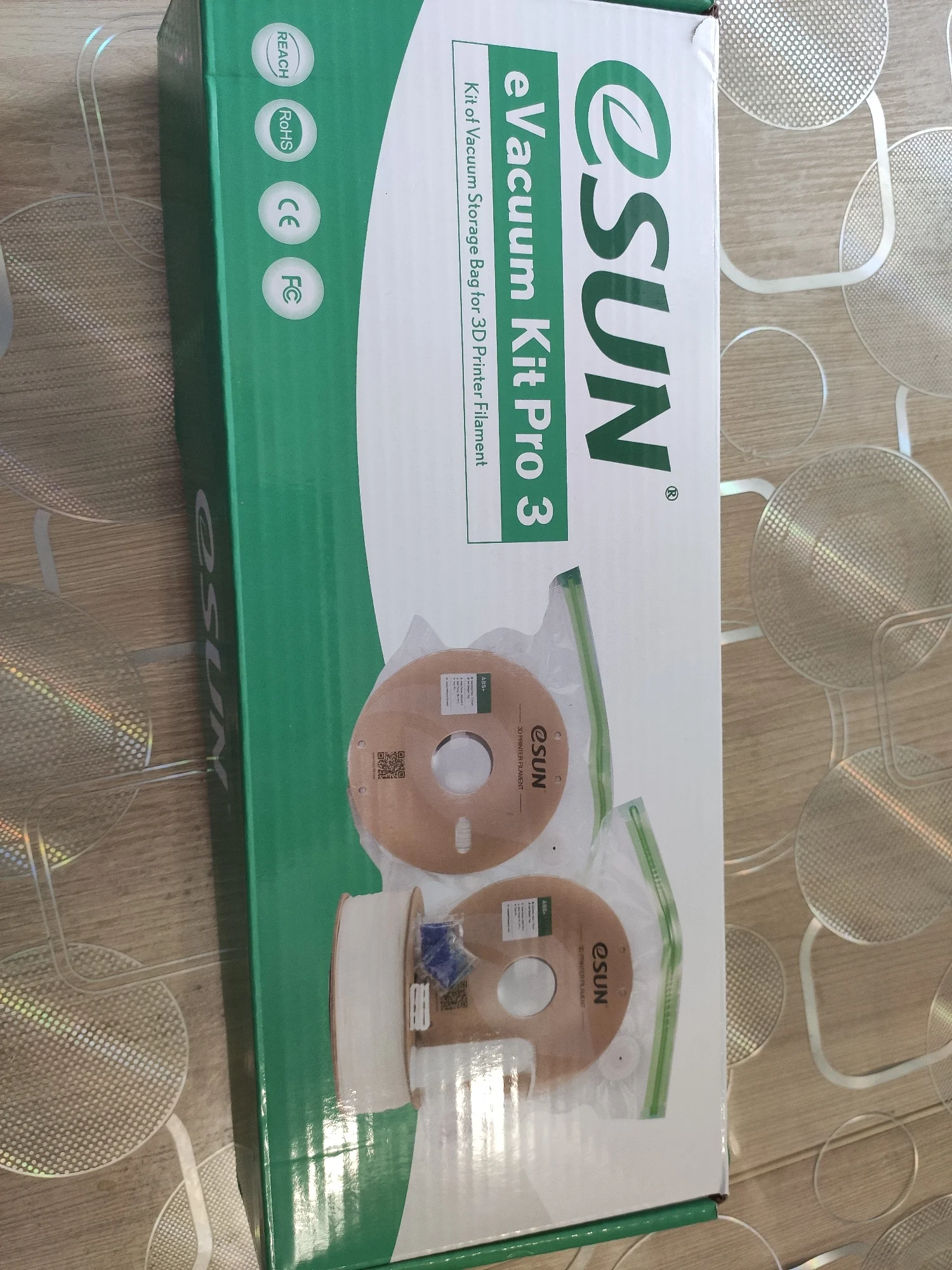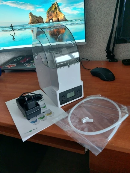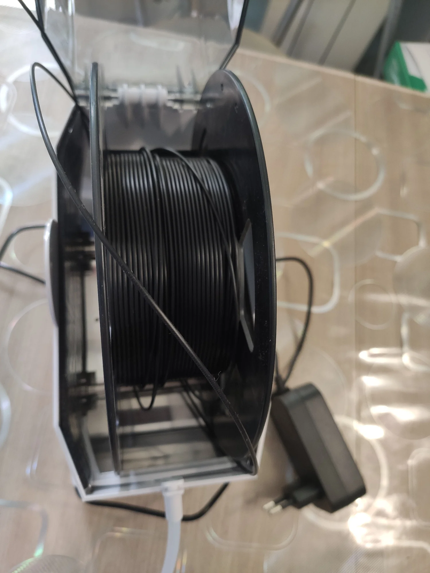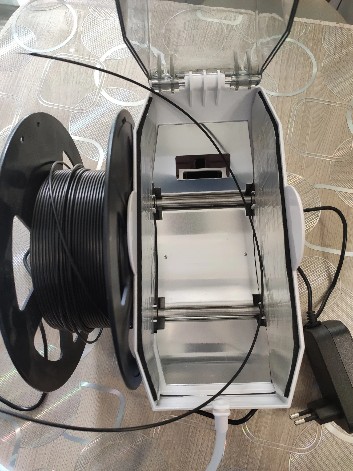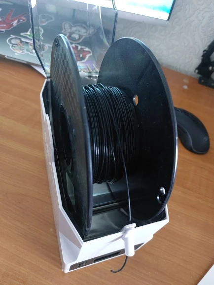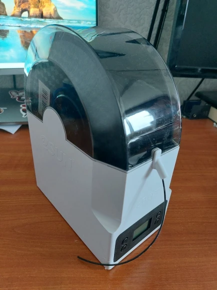Коробка была нормально так помята, благо сушилка была очень хорошо упакована и не повредилась. материал вполне качественный. Стандартная катушка заходит без проблем. Правда сама крышка плотно закрывается только с установленным направляющим носиком. Температуру и влажность самому задать нельзя. Только выбрать из 3 готовых режимов (для pla/petg/abs). есть ещё режим работы по таймеру. При работе достаточно сильно жужжит, так что на ночь в комнате не оставить. Греет хорошо. Пластины внутри прям горячие