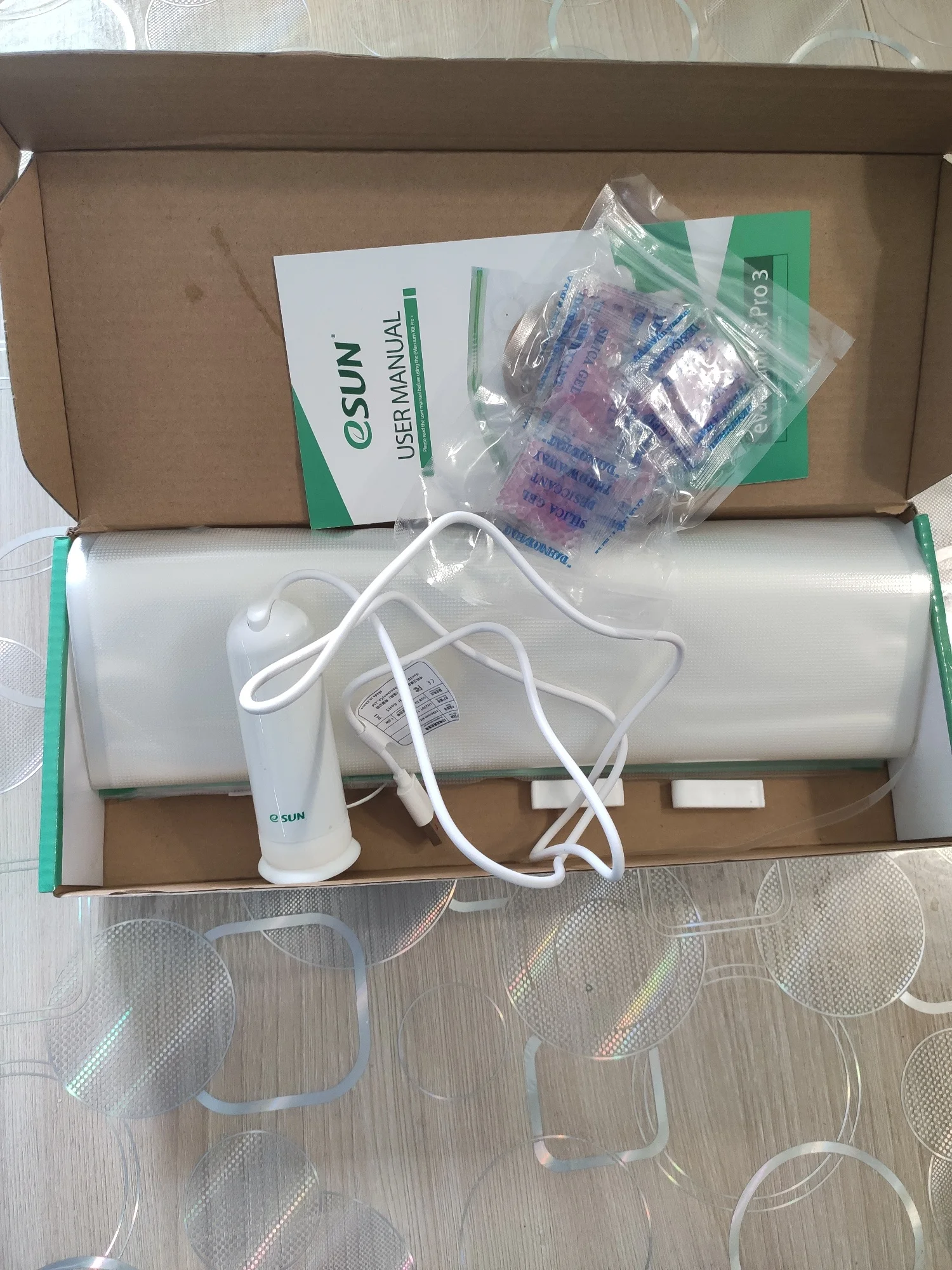доставка быстрая, упаковка отличная, пришло все целое и рабочее. запродавец молодец, большое ему спасибо! заказывал набор просто с пакетами, а он отправил набор с насосом, пакетами и пакетики с силикагелем от влаги. сушилка понравилась, печатать после просушки пластика стало намного лучше. инструкция на английском, но разобраться легко, все понятно. насос работает не от любого блока зарядки, воздух отсасывает хорошо. в общем все понравилось, рекомендую брать набор целиком.
