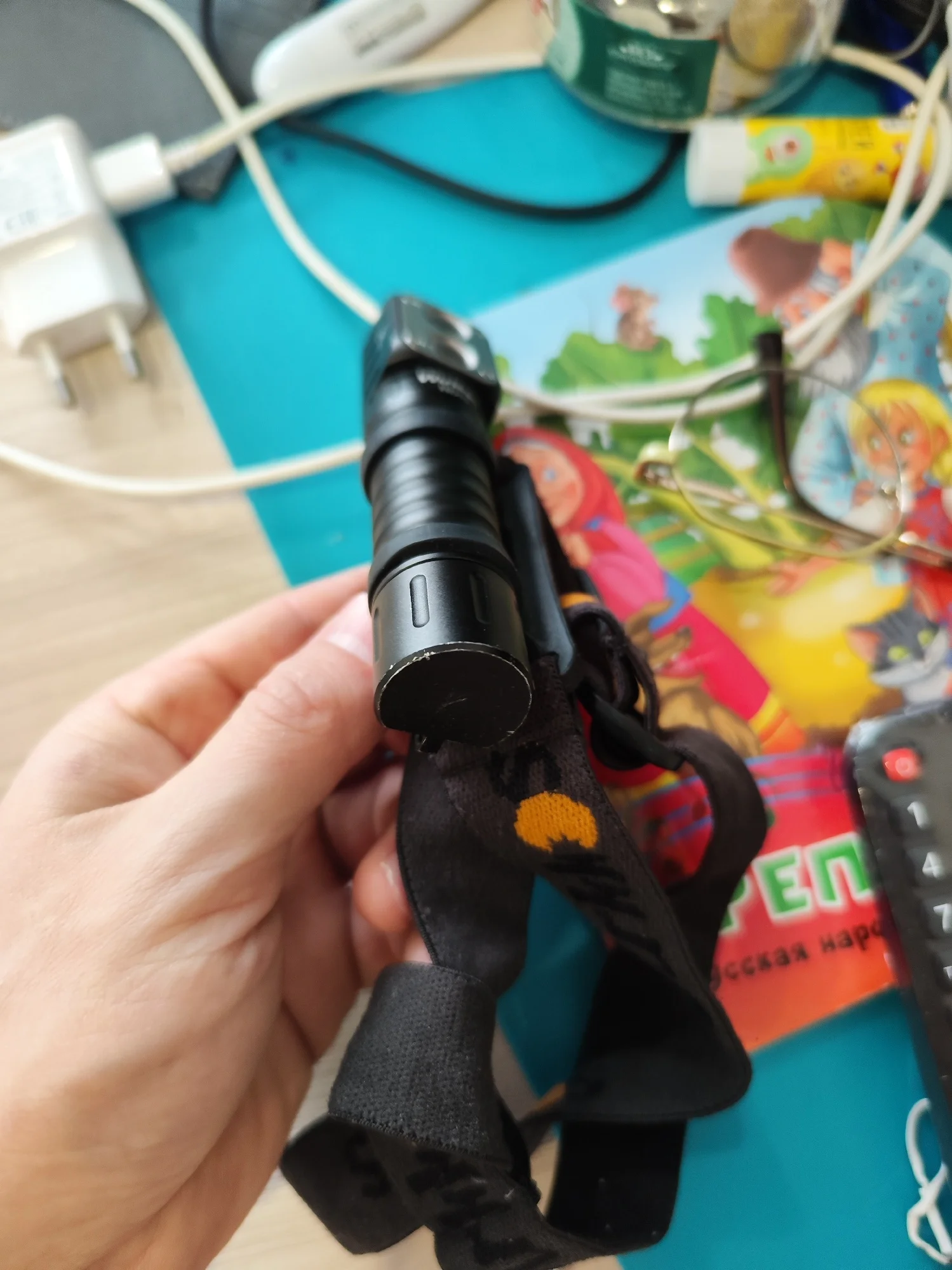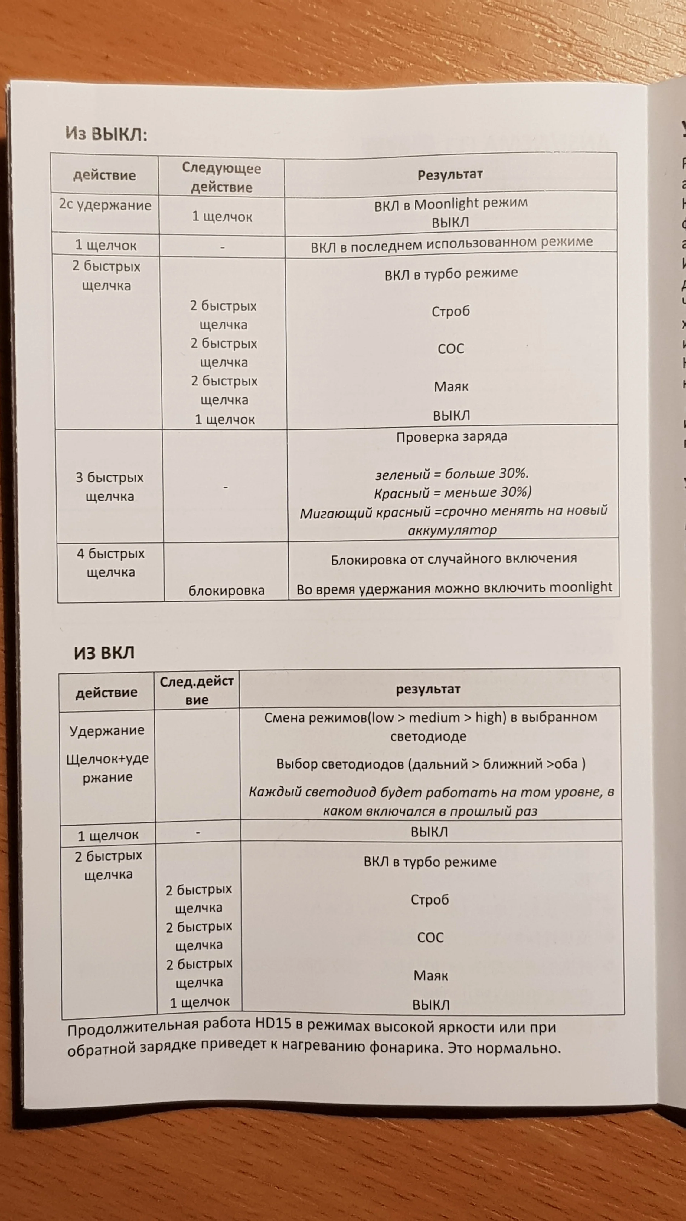 Отличный фонарик, мне очень понравился! К управлению можно привыкнуть. АКБ, конечно, не 3 А•ч, а всего лишь 2 А•ч. Это хорошо видно на тестах зарядником Opus BT-C3100 (см. фото) как при полном разряде, так и при полном заряде. Крепление на лоб неудобное, потому что резинки очень тугие. Я постоянно боюсь порвать резинки. Буду искать крепление другое. Есть русская инструкция. Страничку с режимами показываю на фото. Режим PowerBank у меня толком не заработал. Сначала выдаёт ток около 150-200 мА•ч, а потом вообще перестаёт заряжать.