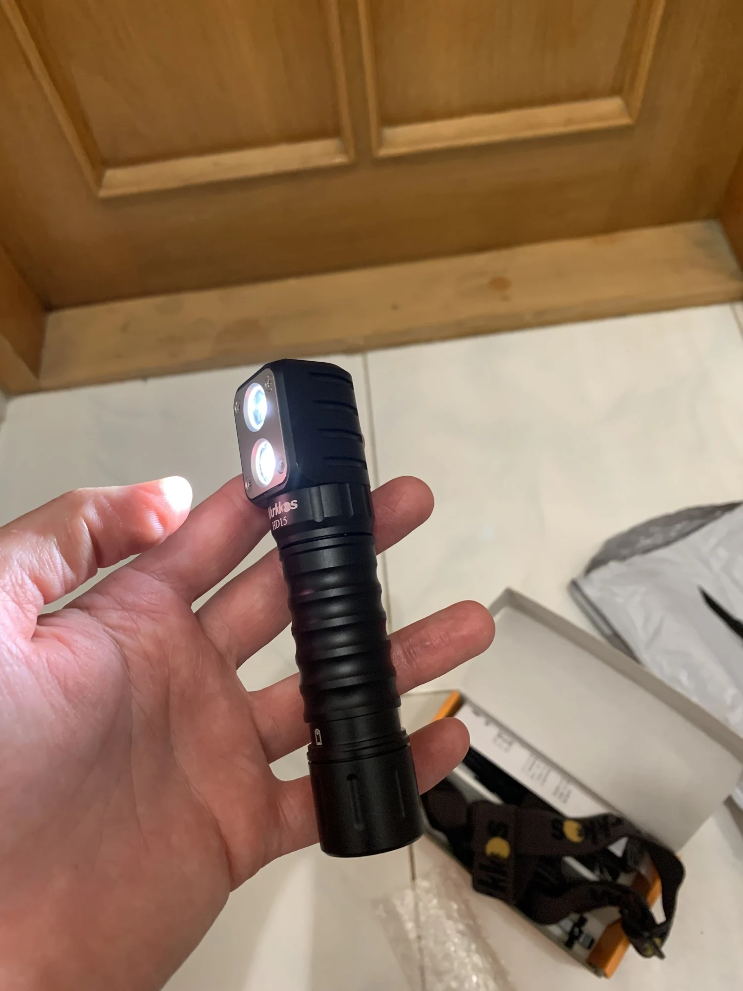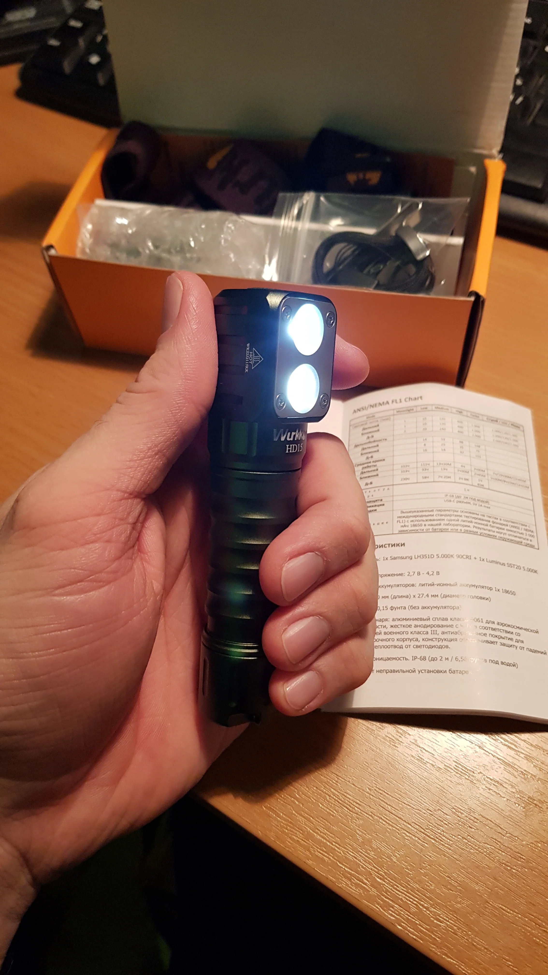 Чертовски быстрая доставка, за 13 дней в Минск, Беларусь. Это второй фонарь этой модели, который я приобретал в качестве подарка тестю на 23 февраля. Доставка через Латвию, трек вида RA...LV отслеживался полностью. В комплекте: сам фонарь, наголовное крепление для фонаря, АКБ(формата 18650 ёмкостью 3000 mAh), съёмная клипса, запасные О-ринги, темляк, сменная трубка под АКБ формата 18350, кабель для зарядки (usb - typeC), мультиязычная инструкция (есть русский). Ёмкость АКБ соответствует заявленной (зарядка xtar vc8plus намеряла 3236 mAh). Фонарь разбирается на три части, резьбы (одинаковые, трубку батотсека можно вкручивать любой стороной) хорошо смазаны, в голове и хвосте пружины. За ближний свет отвечает СД LH351D, за дальний SST20, цветовая температура ~ 5000К. ТИР-оптика (гладкая для дальнего и текстурированная для ближнего света) укреплена в голове с помощью пластины четырьмя винтами torx t6, пластина вероятно из алюминия, не магнитится. В крышке батотсека магнит, фонарь без проблем держится вертикально и горизонтально, есть проушина под темляк. Напротив СД в голове расположен разъем typeC зарядки, закрыт резиновой заглушкой, спрятанной в углублении заподлицо. В торце головы под резиновым колпачком кнопка включения с двухцветным индикатором уровня заряда батареи. Кнопка довольно тугая, нажимается с четким кликом. Свет фонаря приятный, нейтральный белый без цветовых артефактов. Мне крайне понравился, рекомендую как товар, так и продавца.
