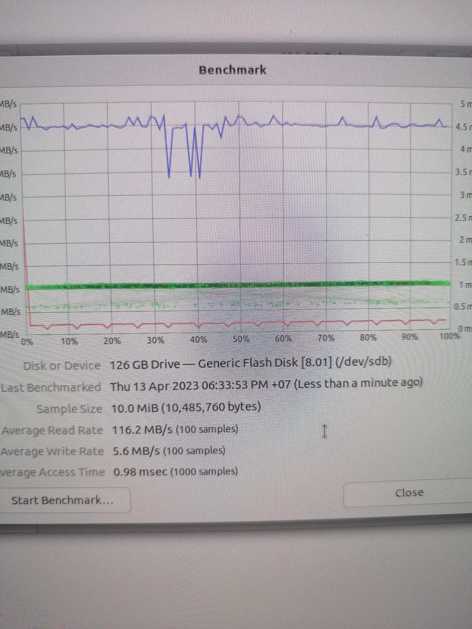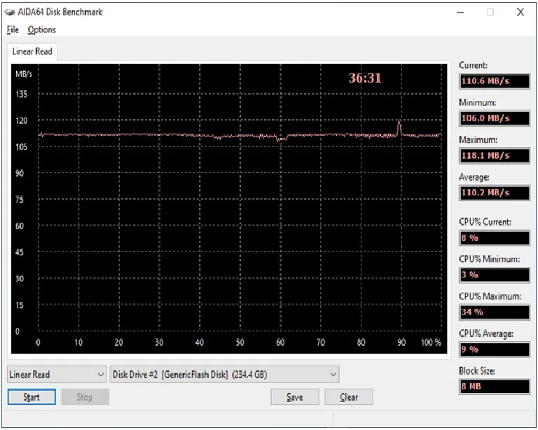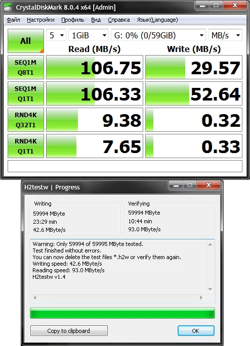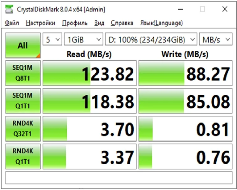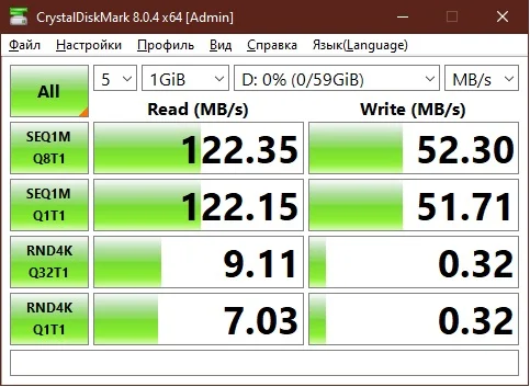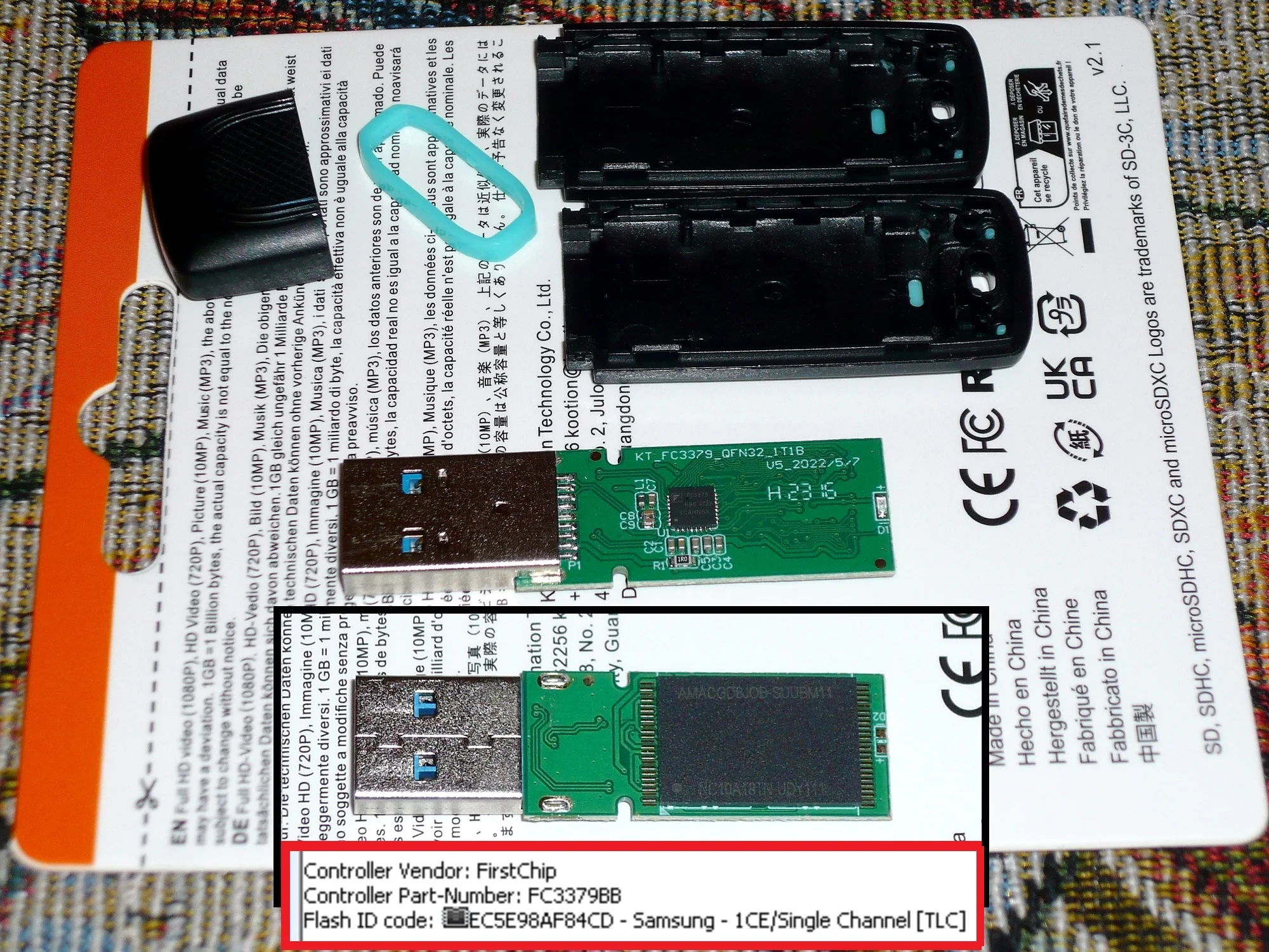 Всё работает, тесты проходит. Скорости хорошие. Скриншоты прикладываю. Имеется индикаторный светодиод (он красный). Утилита для определения начинки ChipGenius говорит, что внутри у моего экземпляра находится контроллер FC3379BB и память EC5E98AF84CD TLC от Samsung. На самой флэш-памяти маркировка состоит из двух строк: AMACGD8JOB-SUUBM11 (или AMACGD8J0B-SUUBM11) в первой строчке и NC10A18TN-UDY111 во второй. Спасибо продавцу за скидку! P.S. микро-SD карточка тоже отличная.Name S. 15 июня 2023