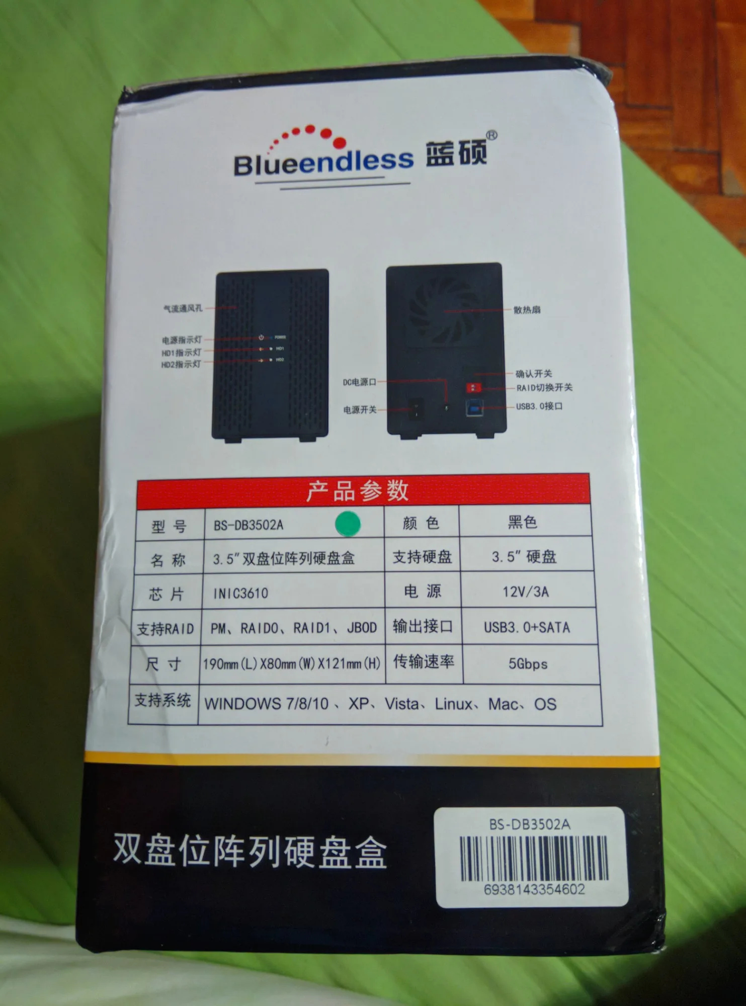 4 дня до Москвы, забрал в почтомате пятёрки. Корпус алюминевый, крепкий, винты с отвёрткой, инструкция на мандарине в наличии. Термодатчик только под одним из винчестеров. И самое обидное - Type C не работает в режиме USB3.0 ни с каким кабелем, перепробовал 4 разных телефонных кабелей. Это очень странно, все контроллеры JMS561 + AMS1543 соответсвуют стандартам, а коробка не работает. Программа для перепрошивки JMS561 контроллер видит и может его шить, но определяет его как USB2.0. Короче, промучившись пару дней, вернул по спору коробку, а продавец вернул деньги. Сейчас жду эту коробочку под USB 3.0 Type B.