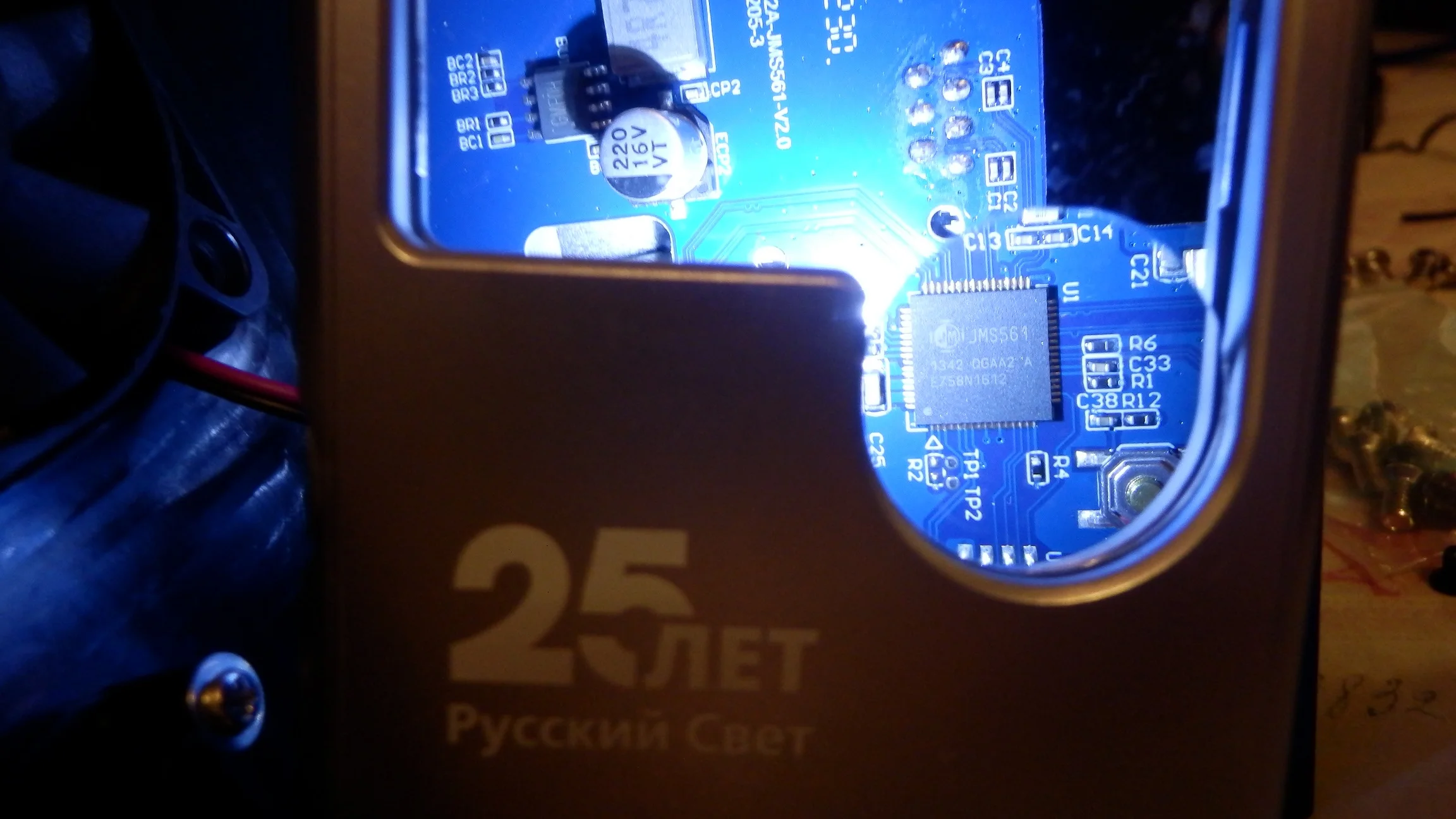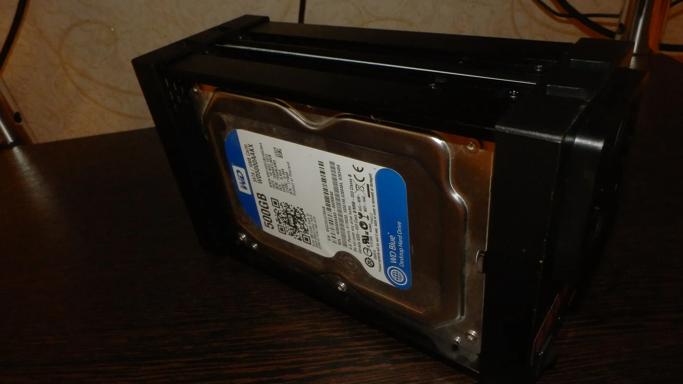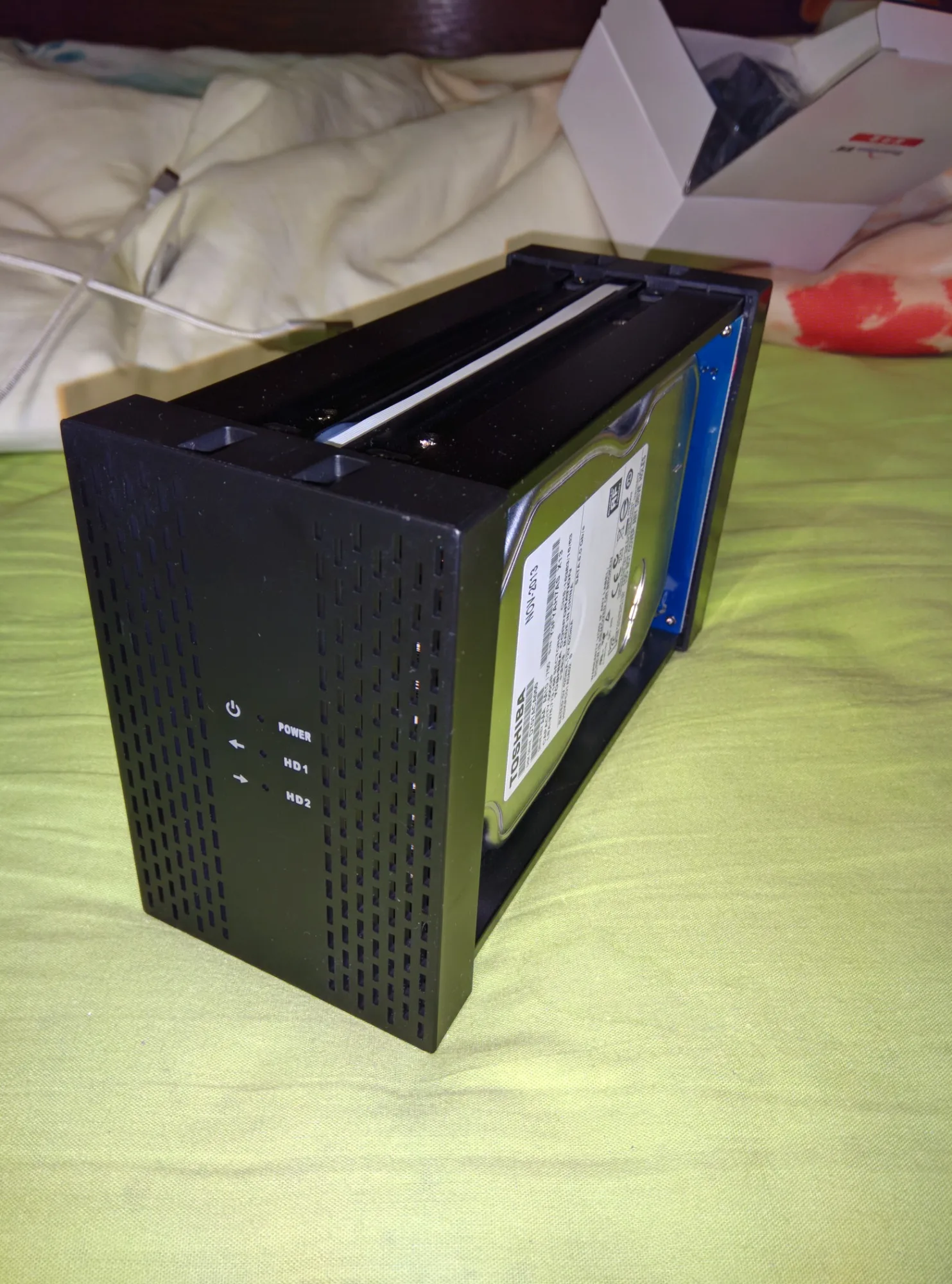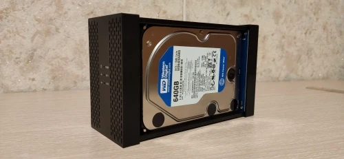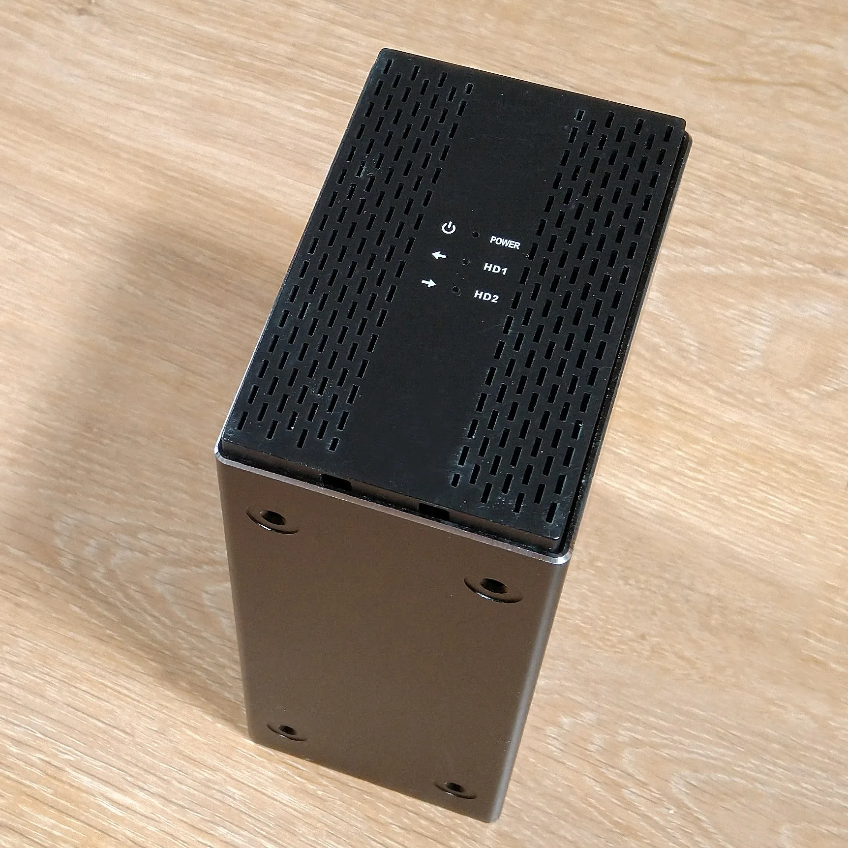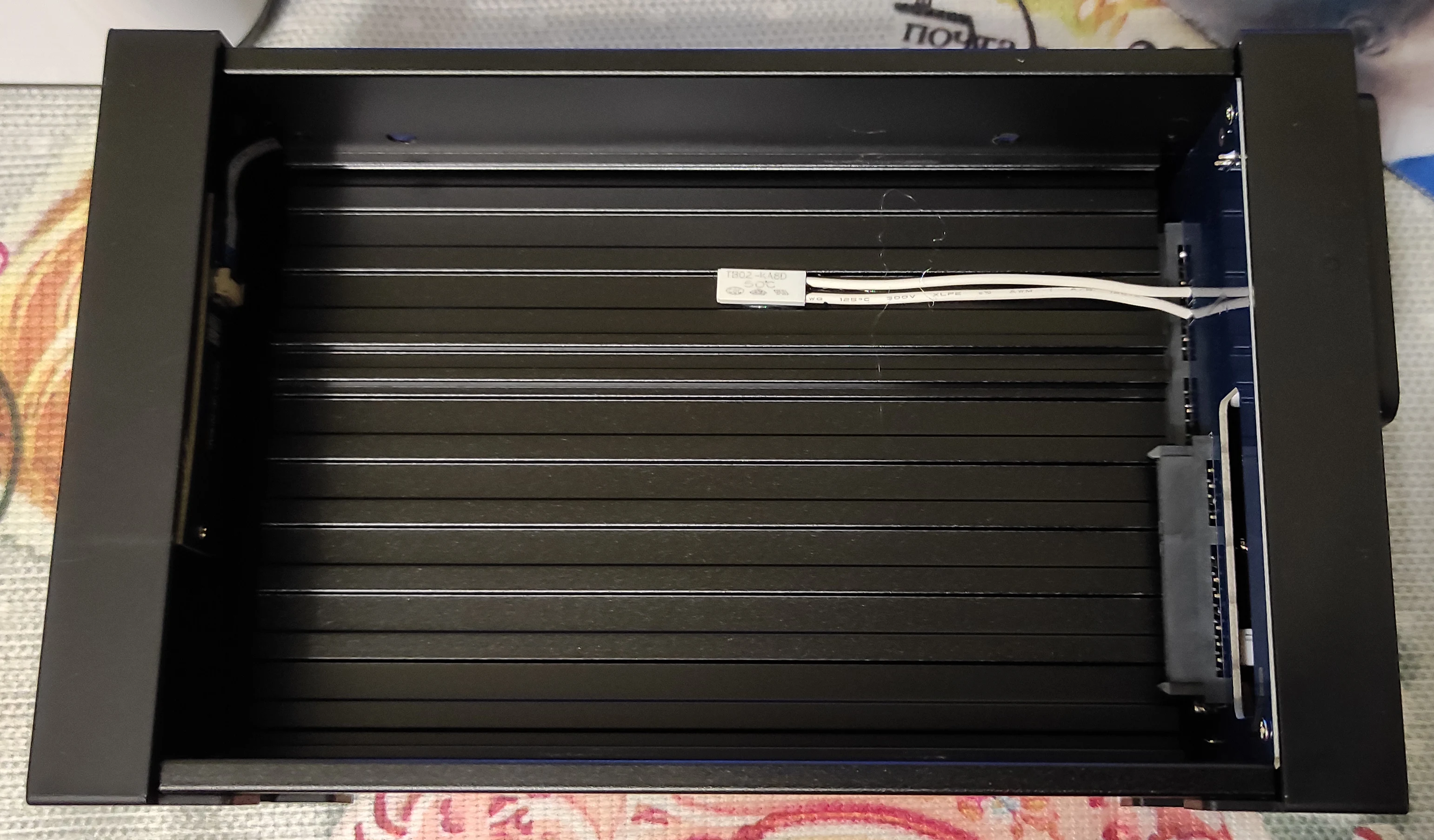 Всё же хороший DAS, за свои-то деньги. В режиме PW видит SMART обоих дисков. В режимах RAID1 и RAID0 не видит вообще SMART ни одного диска. Есть одна термопара на 50 градусов - если диск начнет перегреваться, то включится вентилятор, а пока диски холодные, вентилятор будет молчать. Сам вентилятор в режиме работы довольно тихий - шум сравним с уровнем шума от 3.5" дисков. Внутренняя перегородка между дисками и внешний корпус металлические, что хорошо для отвода тепла от дисков. При физическом отключении одного из дисков прямо во время работы, копирование файла прерывается и совсем останавливается. Происходит отключение всех дисков от компьютера. Работает на чипе JMS561. Можно немного модифицировать коробку, чтобы было крепление для 2.5" дисков, для этого надо просверлить хотя бы по одному отверстию в металлическом корпусе, аналогично тому, как это сделано для 3.5" дисков. Скорость записи на SSD диски больших файлов 320МБайт/с.