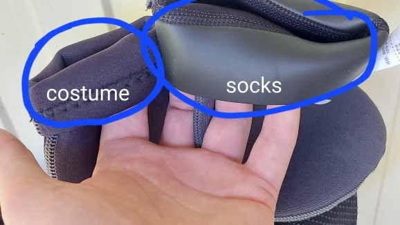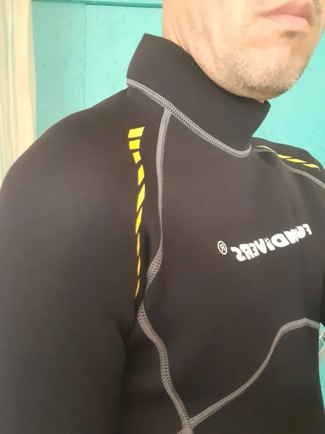 на рукавах нет полосы из чистого неопрена(видно на фото в сравнении с неопреновыми носками), из-за этого много попадает воды под костюм. желательно использовать с носками, капюшоном и перчатками. по размеру все подошло на рост 180 и вес 85 заказывал XXL.