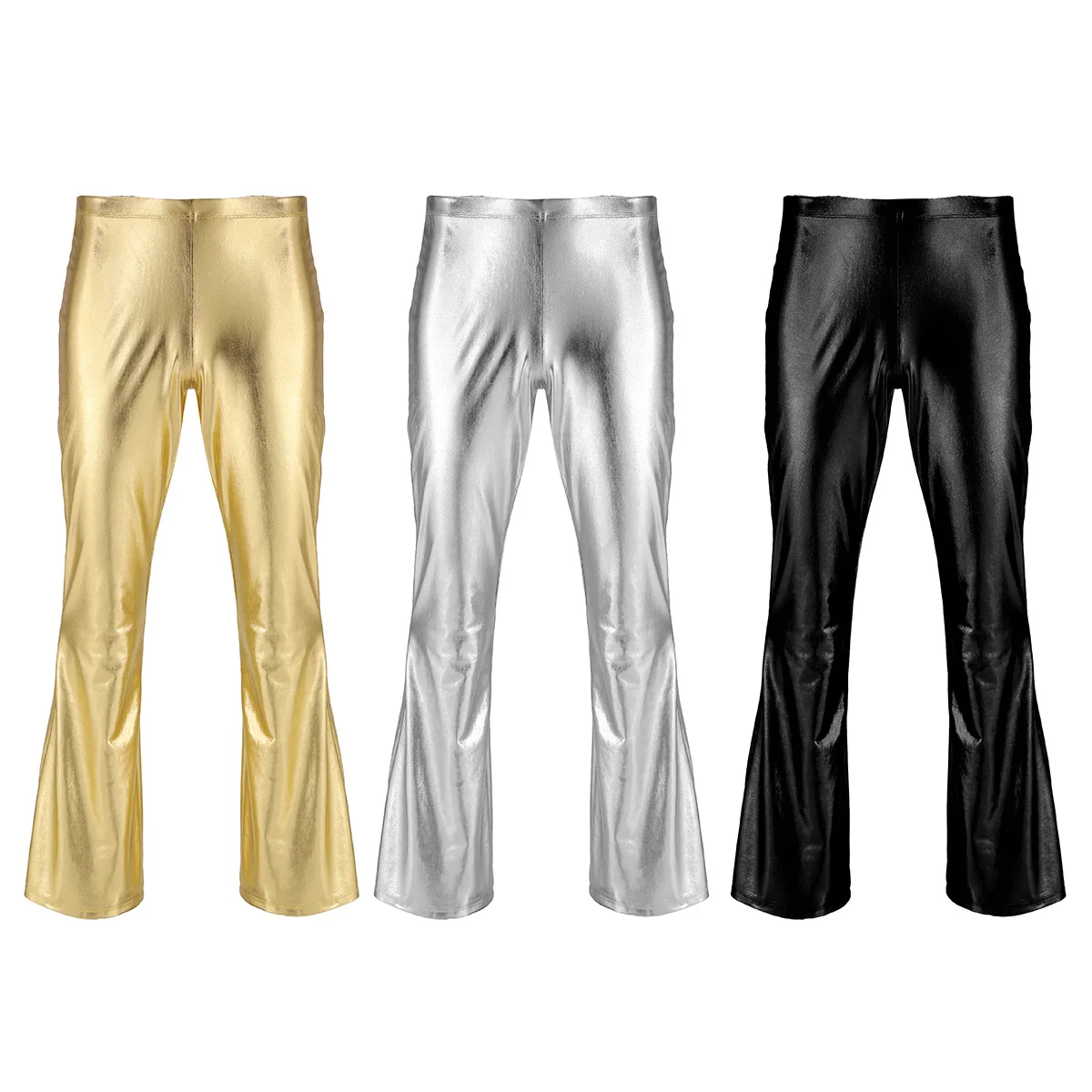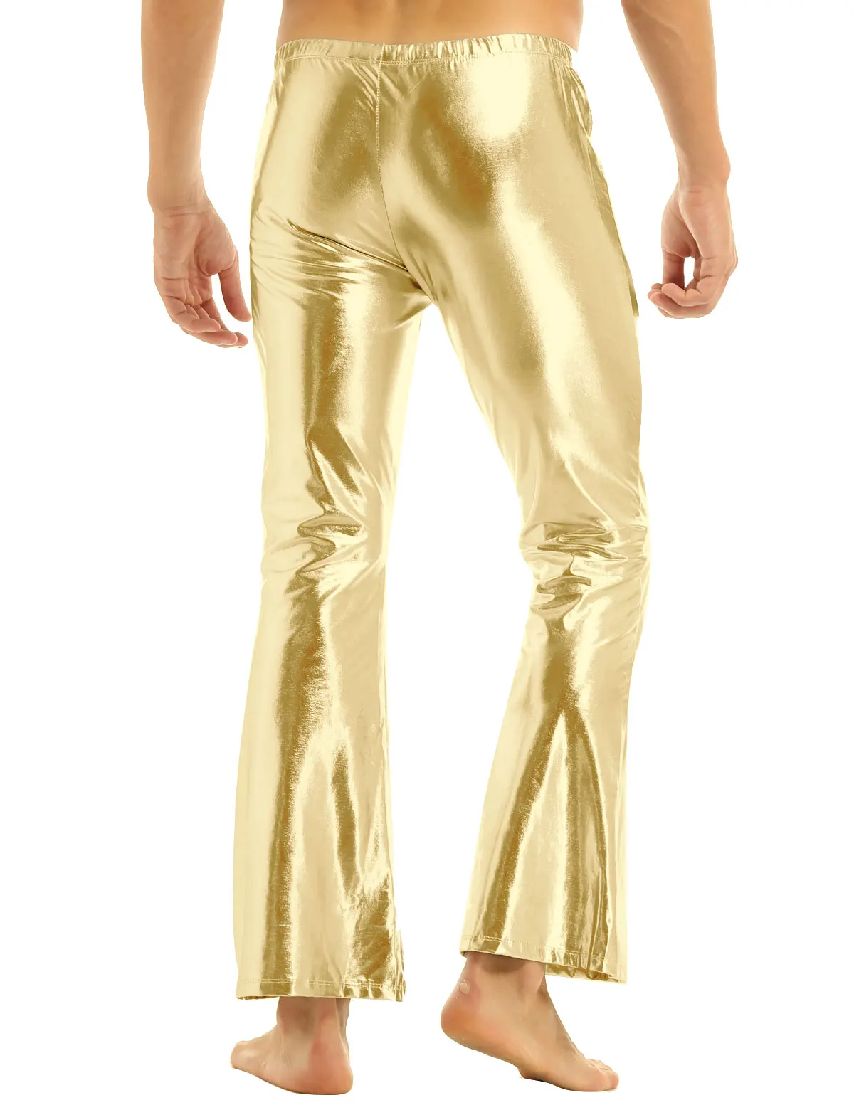 Для взрослых мужские мото Клубная одежда стиля панк вечерние Брюки Блестящий металлический брюки в стиле диско с расклешенных расклешенные длинные штаны Dude» костюм с брюками