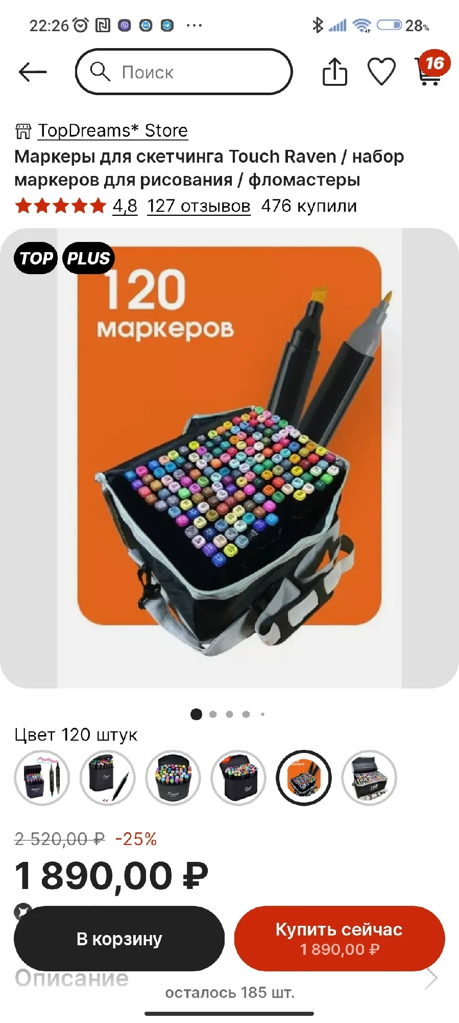 Доставка очень быстрая. Товаром довольна, все хорошо пишут. Но 3 маркера не открывались из-за налипшей краски в колпачке. По большей части колпачки соответствуют цвету, но один совсем розовый цвет, а подписан как серо-голубой. Я выкраску делала на обычном альбомном листе - маркеры сильно просвечивают, бумагу для них надо плотную и пористую. Они очень сильно растекаются, края не четкие. Только 2 маркера были с четким написанием и тонкой четкой линией, на фото их сразу видно. Но в целом для ребенка я думаю подойдет. Для более профиссиональных целей, я бы выбирала другие.katarinawm k. 21 ноября 2021