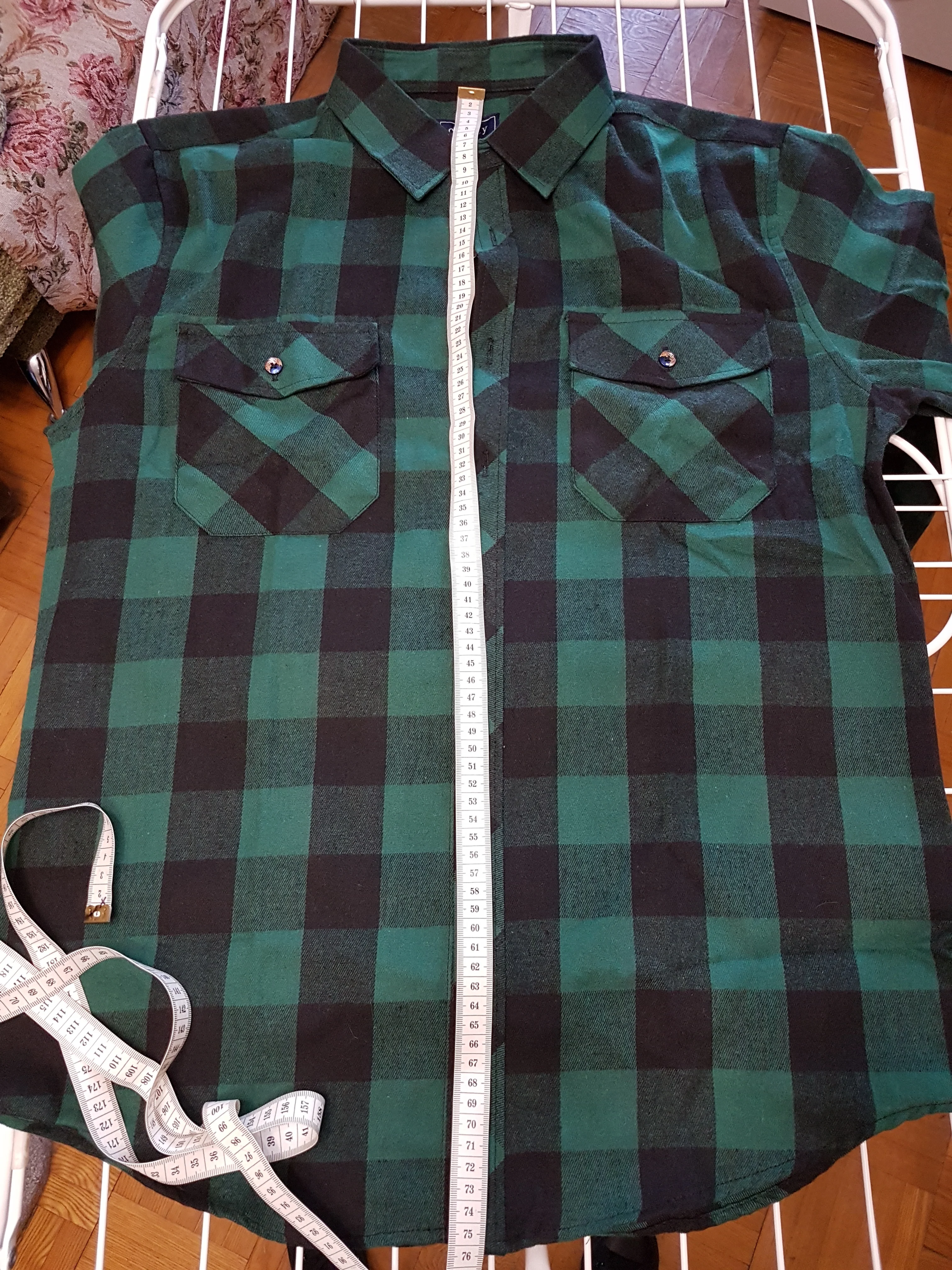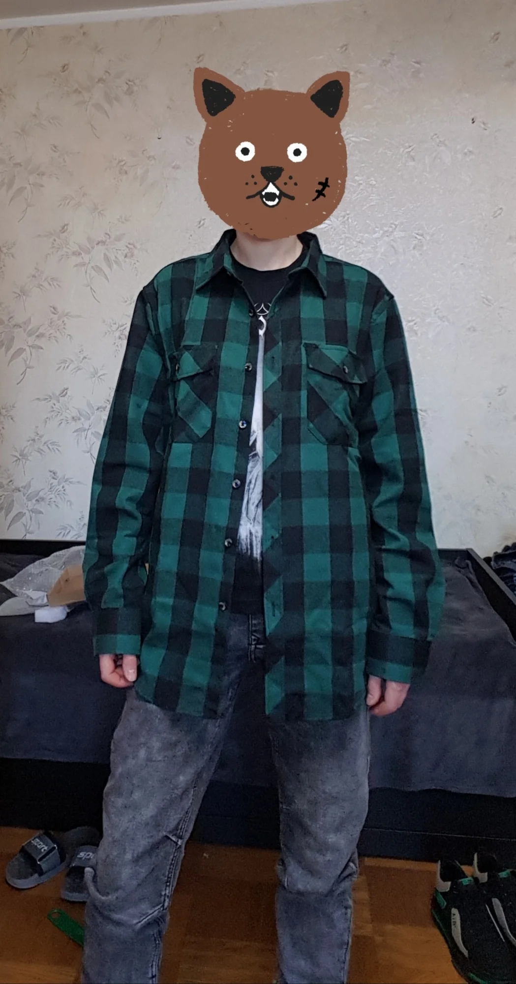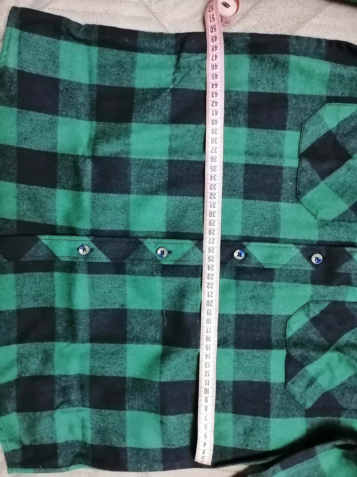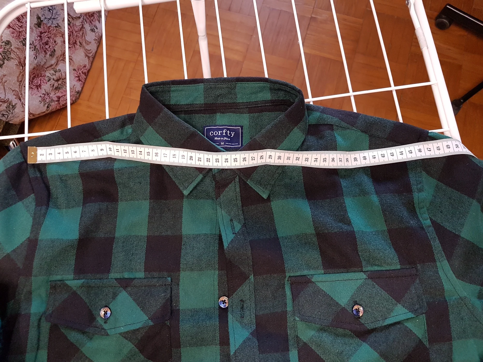Мне нравится качество. Ткань плотная, немного жестковатая, отлично носить как верхнюю рубашку поверх футболок. Мне нравится полусинтетика за то, что не мнется и не садится. Красивый холодный оттенок зеленого. Мне нравятся свободные рубашки. Обычно беру S, взял М из опасения, что будет мала. В итоге немного большевата, особенно в воротнике. Перезакажу S. Измерения размера М на фото. Длина воротника 44 см.