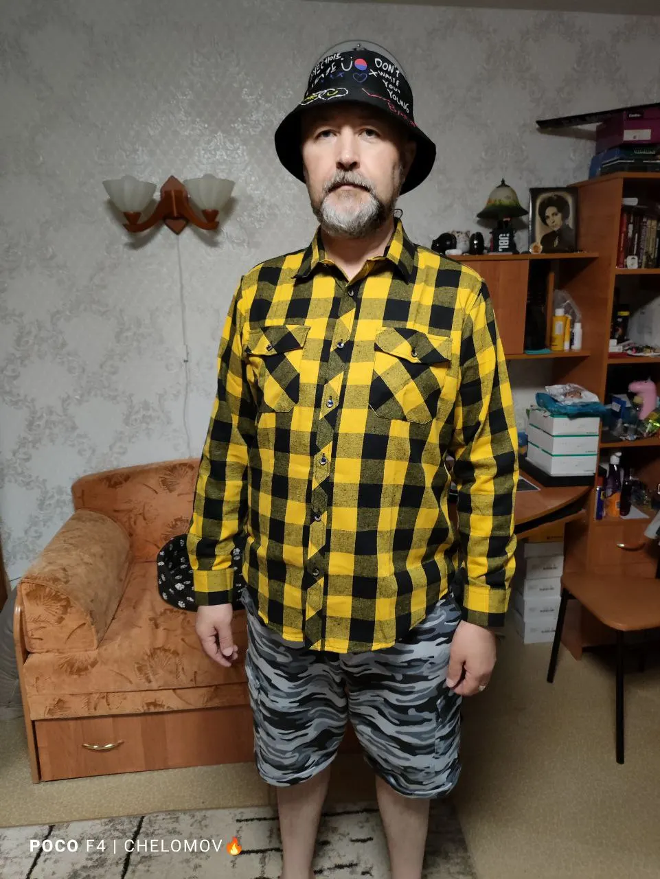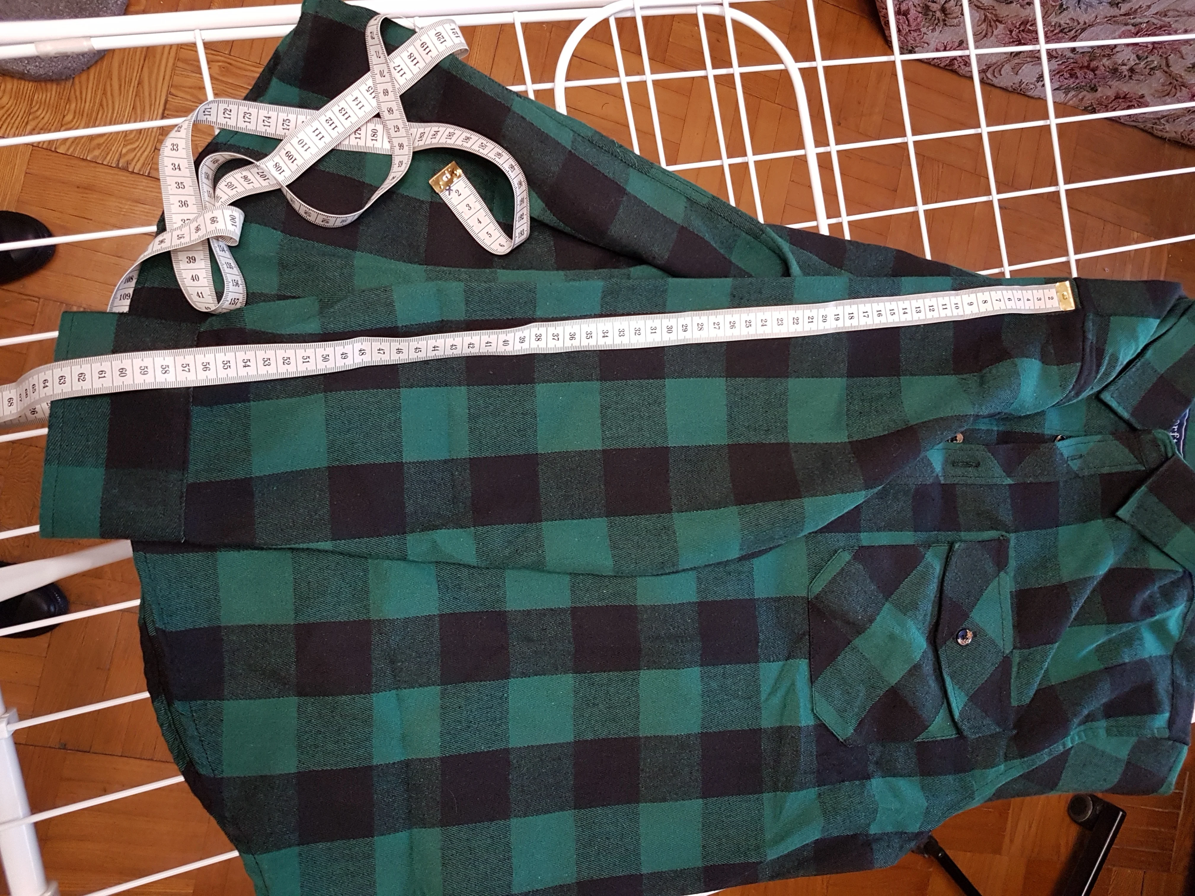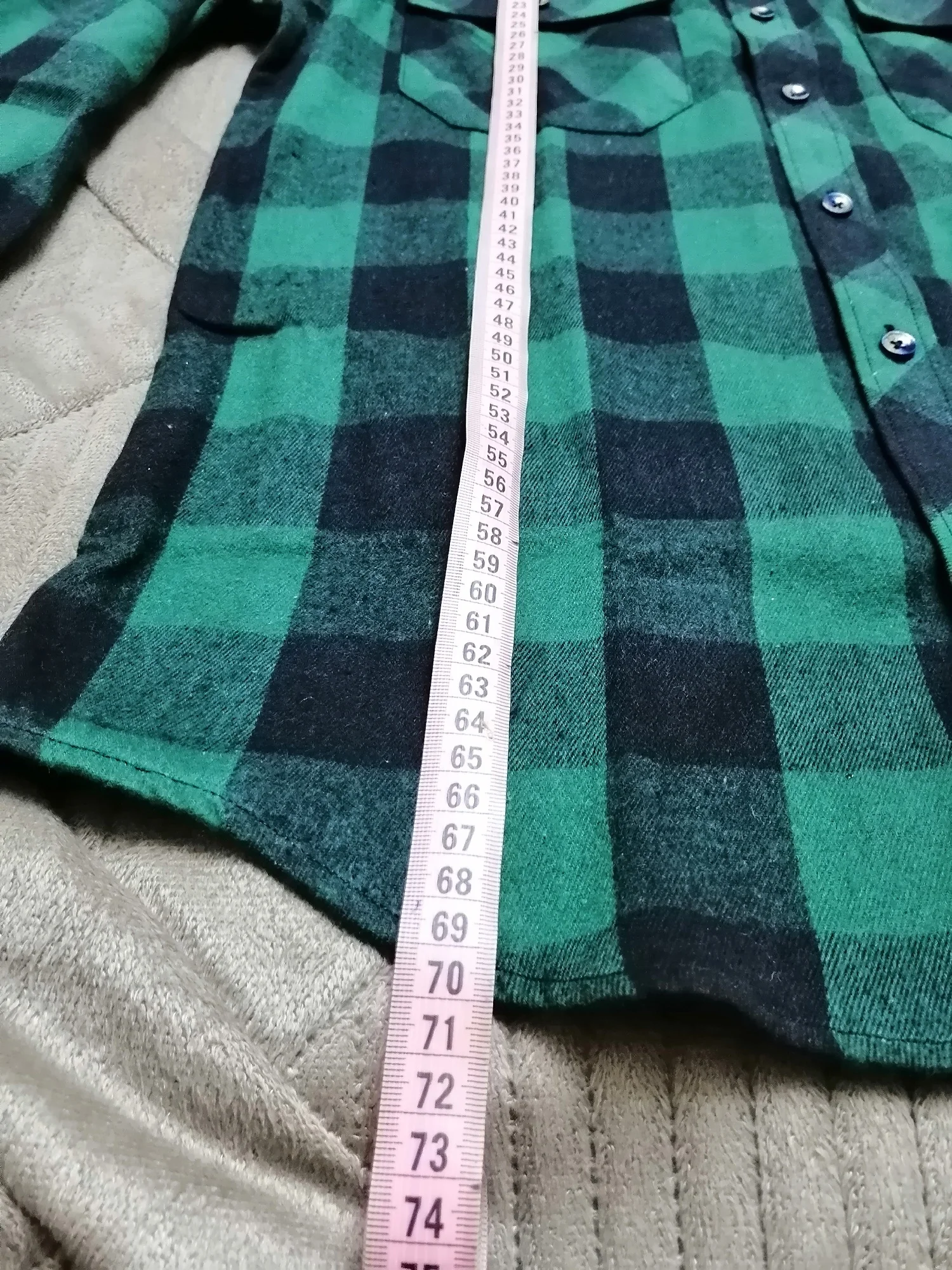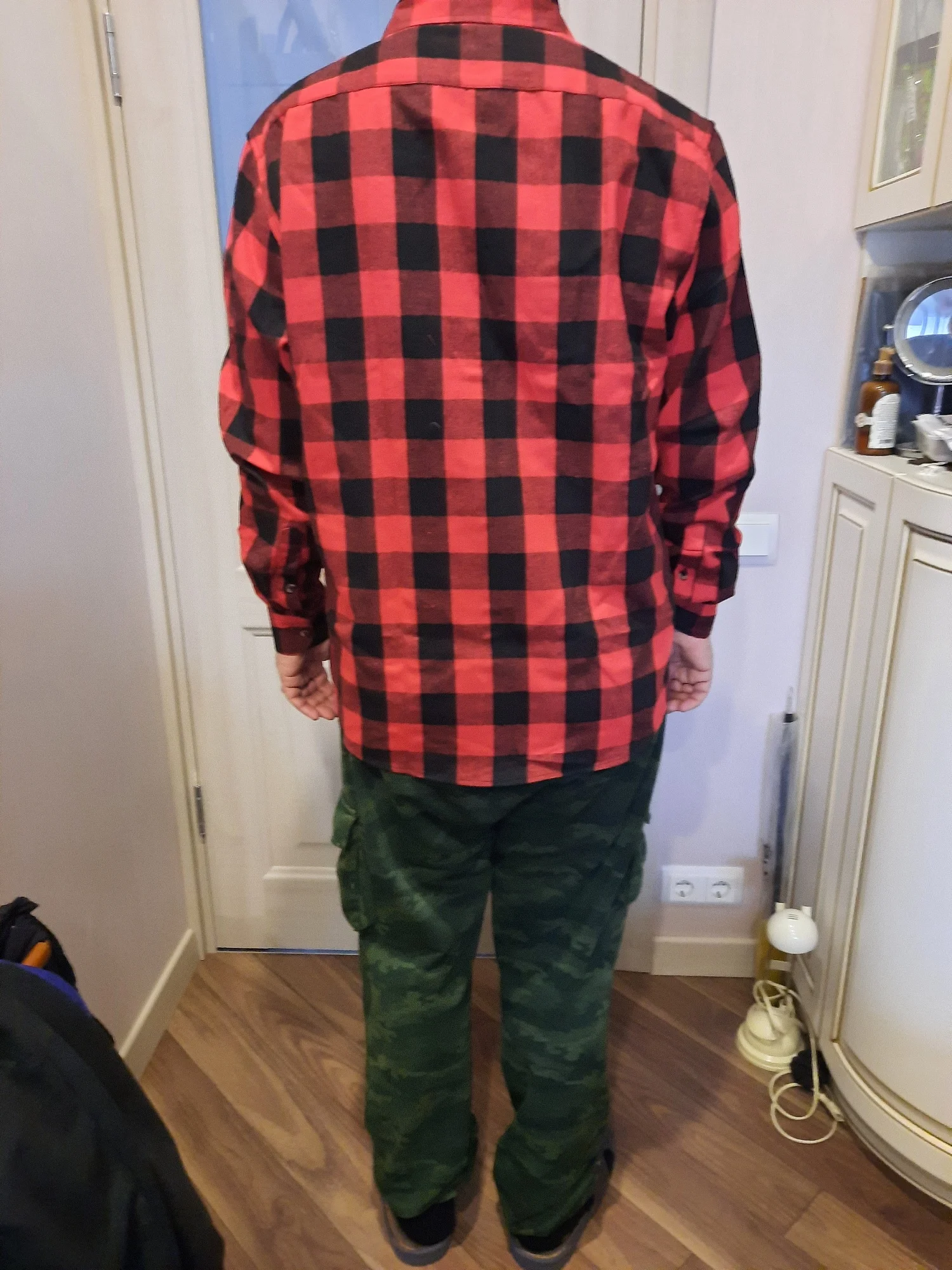 Мне нравится качество. Ткань плотная, немного жестковатая, отлично носить как верхнюю рубашку поверх футболок. Мне нравится полусинтетика за то, что не мнется и не садится. Красивый холодный оттенок зеленого. Мне нравятся свободные рубашки. Обычно беру S, взял М из опасения, что будет мала. В итоге немного большевата, особенно в воротнике. Перезакажу S. Измерения размера М на фото. Длина воротника 44 см.