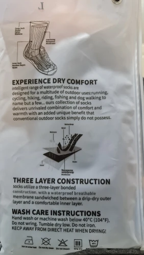 Товар соответствует описанию. Носки действительно не промокают, на 43 размер сели хорошо, сшиты аккуратно, нитки не торчат. Посылка пришла быстро за две недели до почтомата в Приволжье. Товар рекомендую.