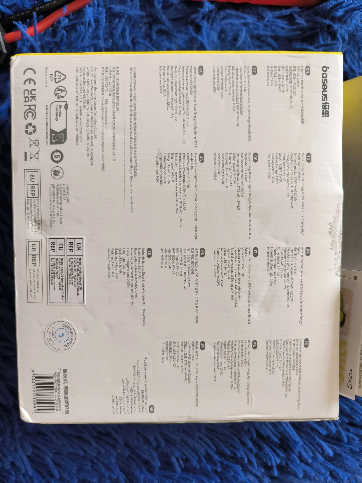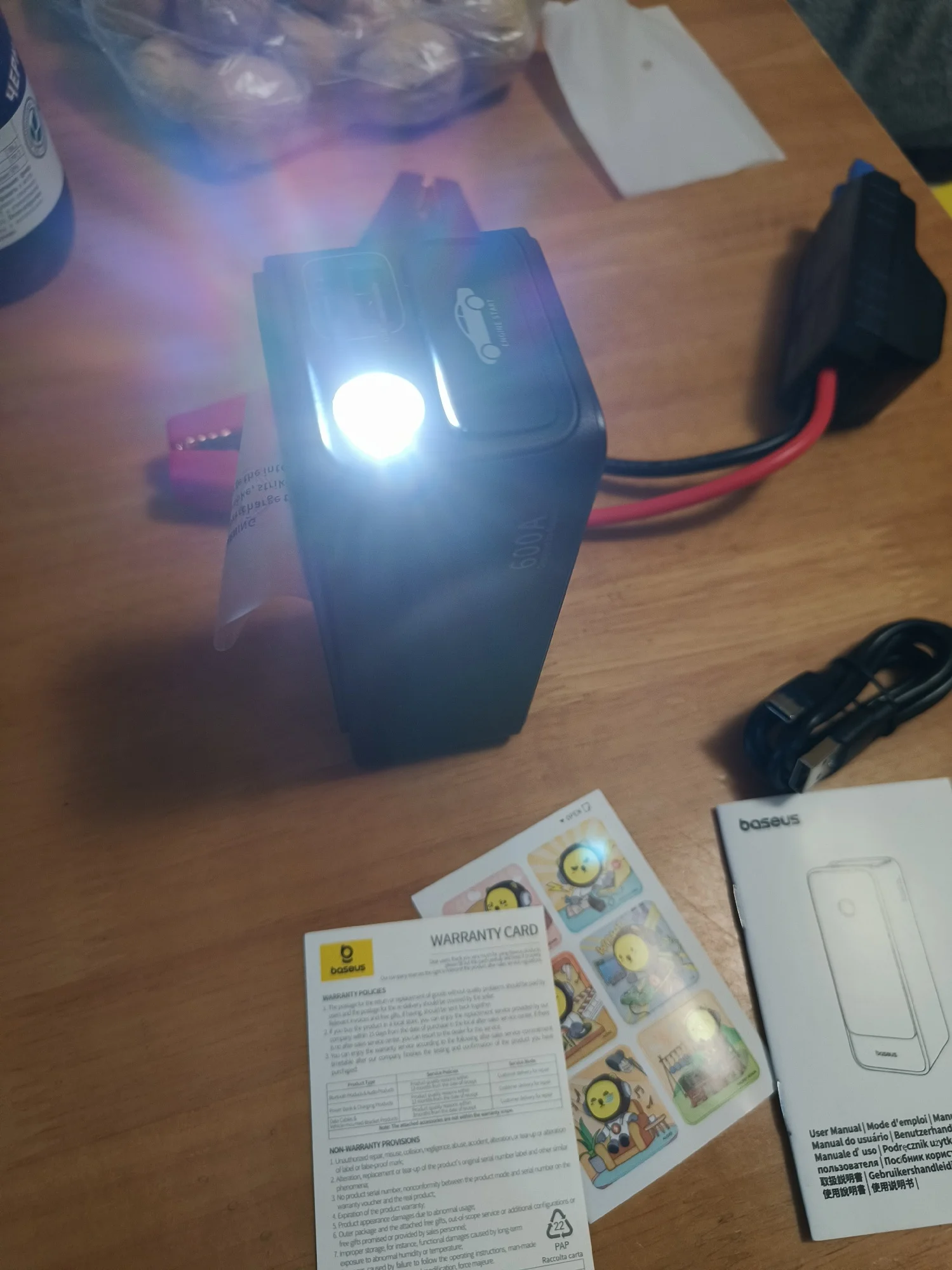 Быстрая доставка в пункт выдачи. Соответствует описанию. пришел заряженным на 3/4. Очень компактное пусковое устройство. при этом достаточно мощное. Проверил устройство в деле, дизель 2.2 литра с отключённой батареей, Baseus смог без проблем стартануть, были сделанны две попытки и естественно обе удачные. После испытаний индикатор показал остаток заряда пускового в 1/2, но перед испытаниями от него записывалась колонка около 2 часов. Думаю устройства должно хватить на минимум 4 уверенных старта, сполностью севшим аккумулятором в машине с дизельным 2.2л мотором. Из минусов, наверно, это отсутствие чехла. Хотелось хоть какой нибудь мешочек в комплекте. Да и встроенный фонарик, довольно слабый. Со всеми скидками я заплатил за товар 2613 рублей, 27.30$, думаю это отличная покупка, а с учётом что за эти деньги это Baseus с его качеством и репутацией. Я полностью доволен.Oleg S. 26 августа 2023