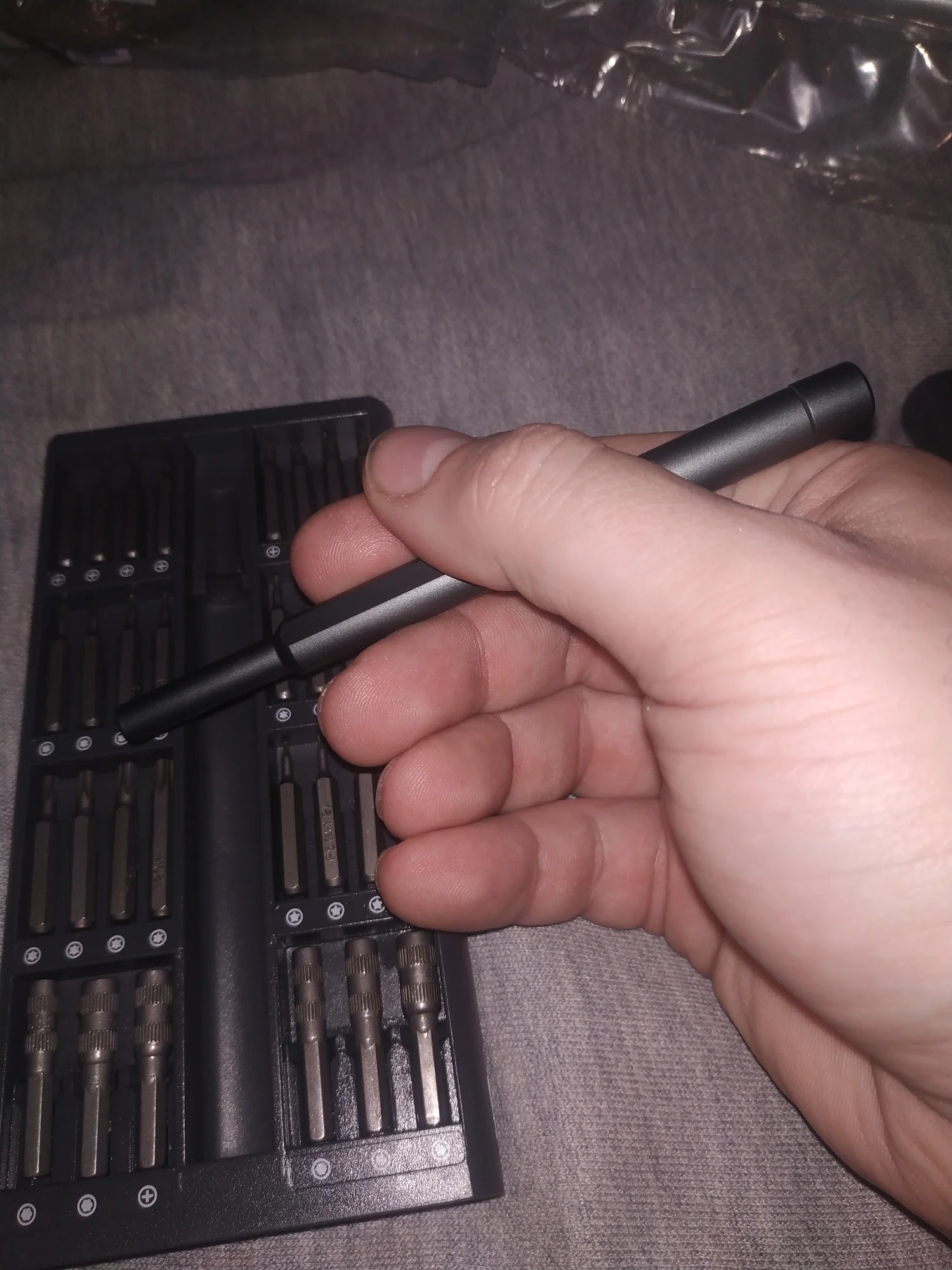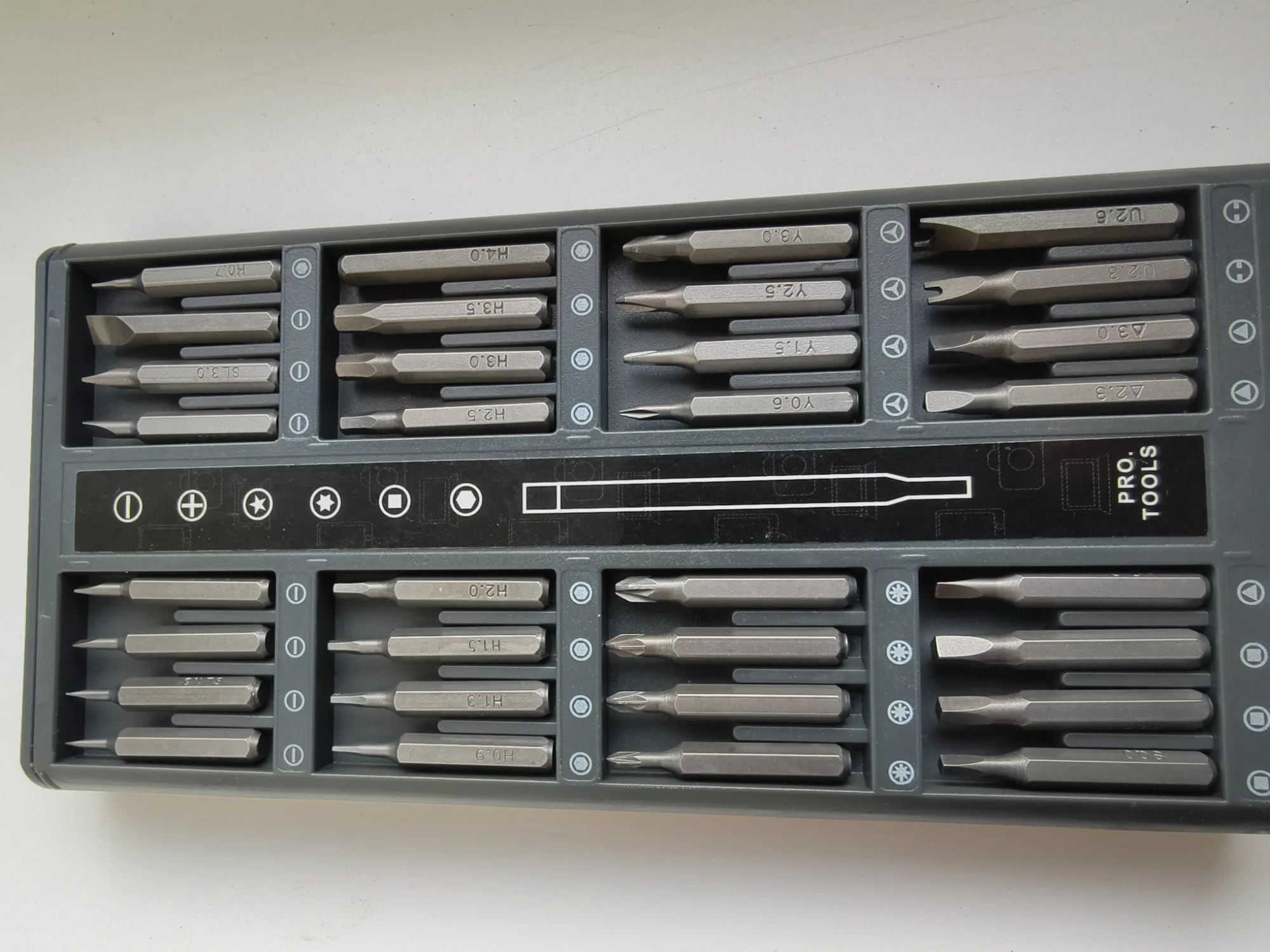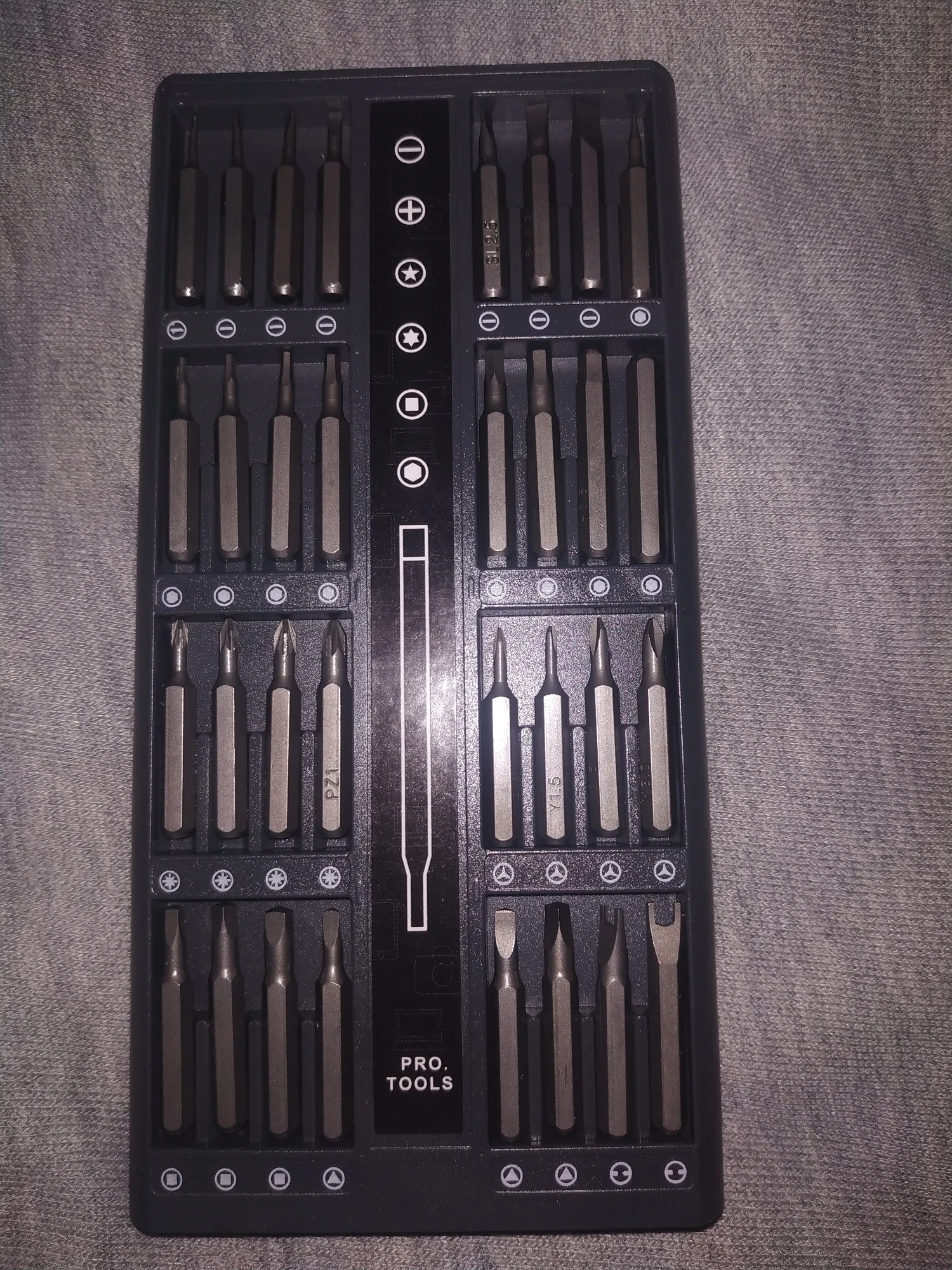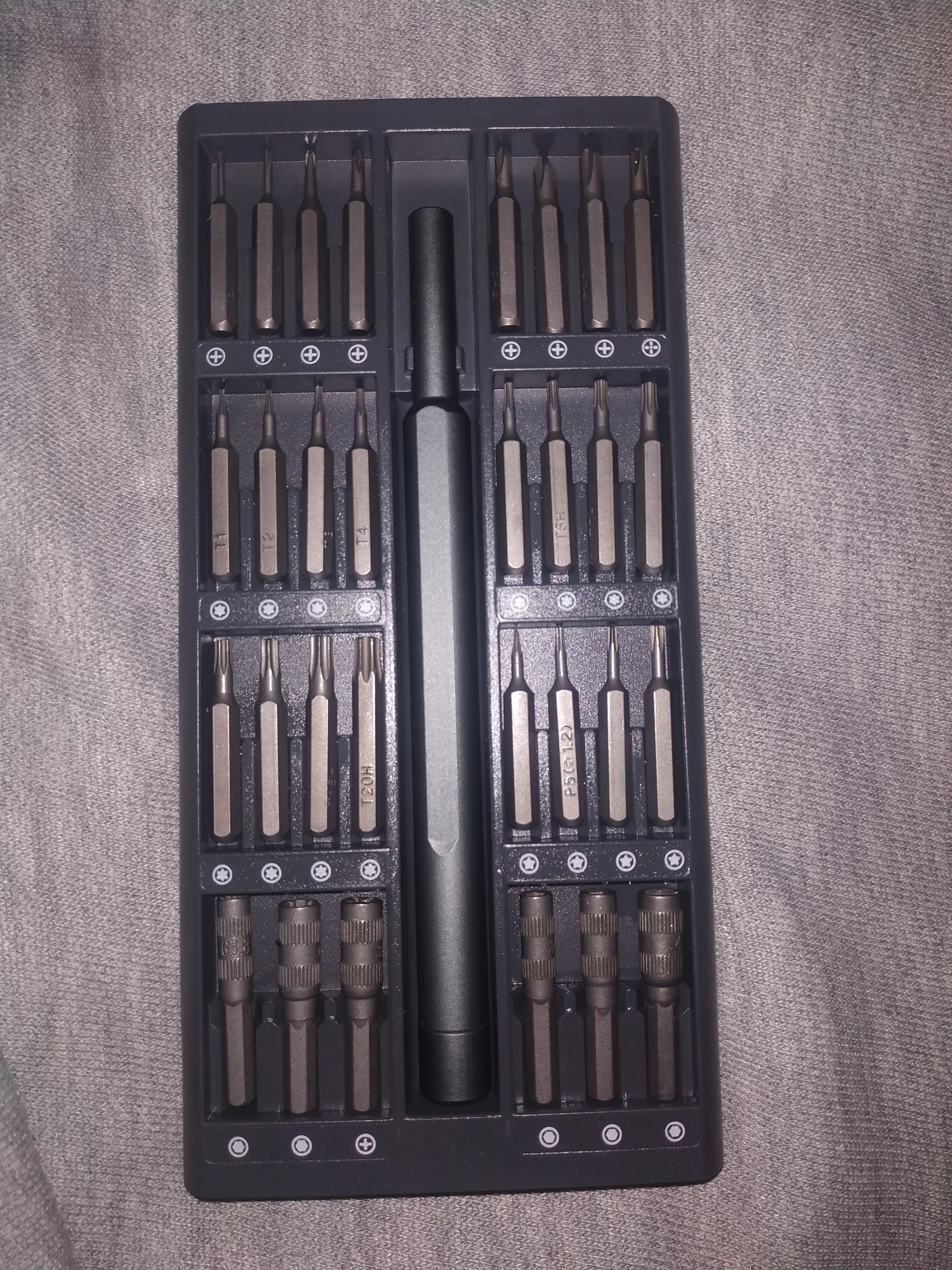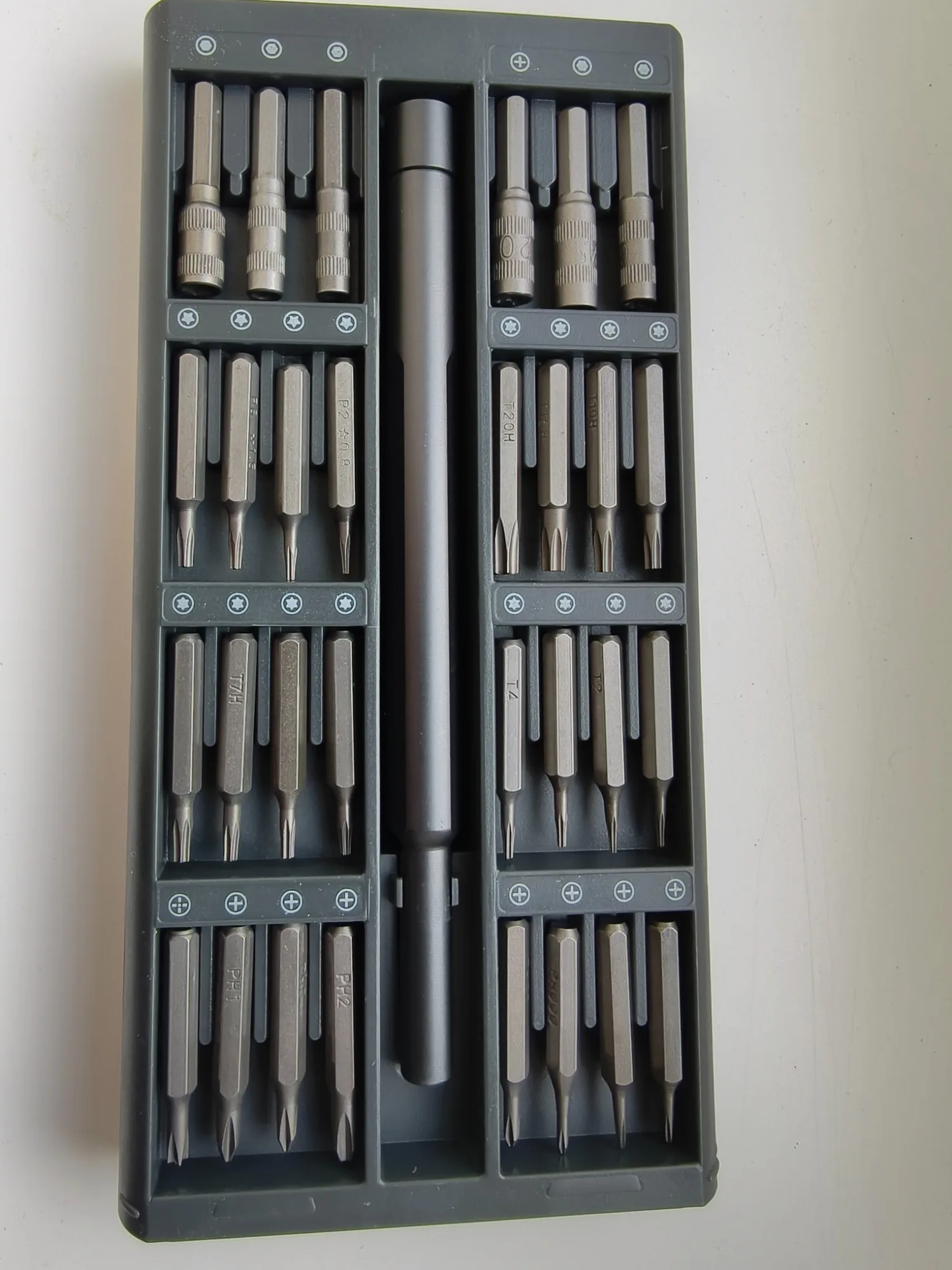 Набор пришел быстро, в живую выглядит проще чем на фото. Внешний корпус, а также внутренний где лежат биты, сделан из пластика. Внутренняя часть корпуса из двух половин и кривовато склеена. Сама отвертка из какого-то сплава, битки возможно металл. Битки обильно смазаны прозрачной смазкой, лежат далеко не все размерами вверх, пришлось переворачивать. Держатся за счет магнитного основания в каждой ячейке. Шрифт местами разной четкости на разных битках. В целом пока приемлимо. По качеству бит будет видно дальше.