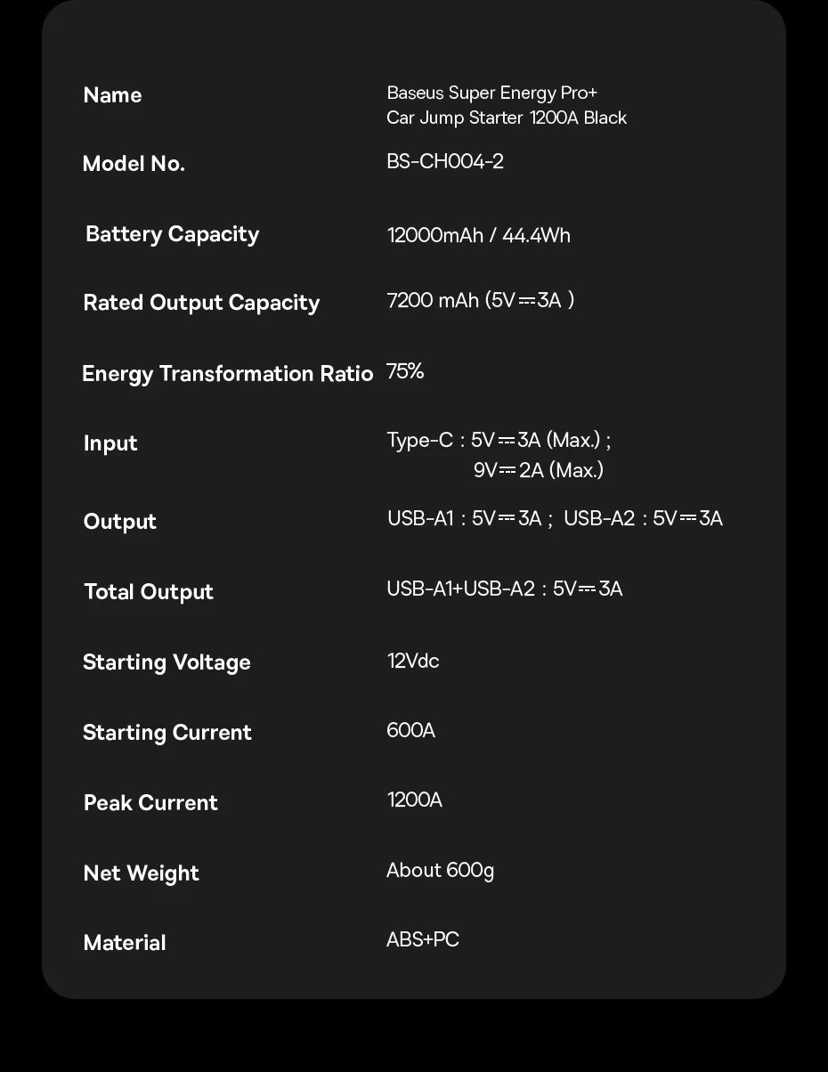 Пусковое устройство Baseus для автомобиля, 12000 А, мАч