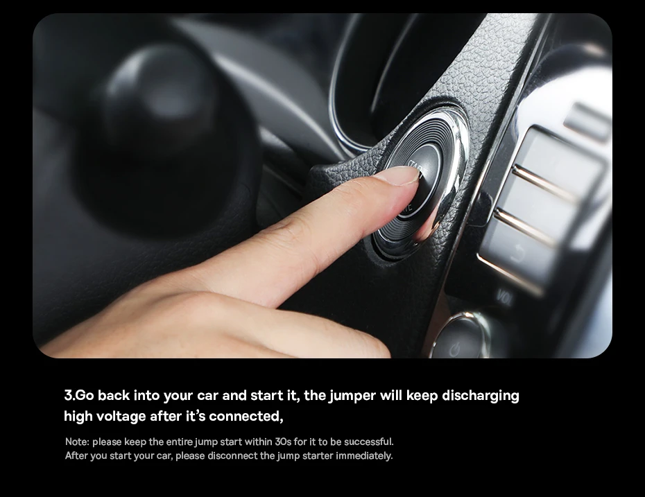 3.Go back into your car and start it, the jumper will keep discharging high voltage after it s connected, please keep the entire jump start within 30s for it to be successful. After you start your car, please disconnect the jump starter immediately.