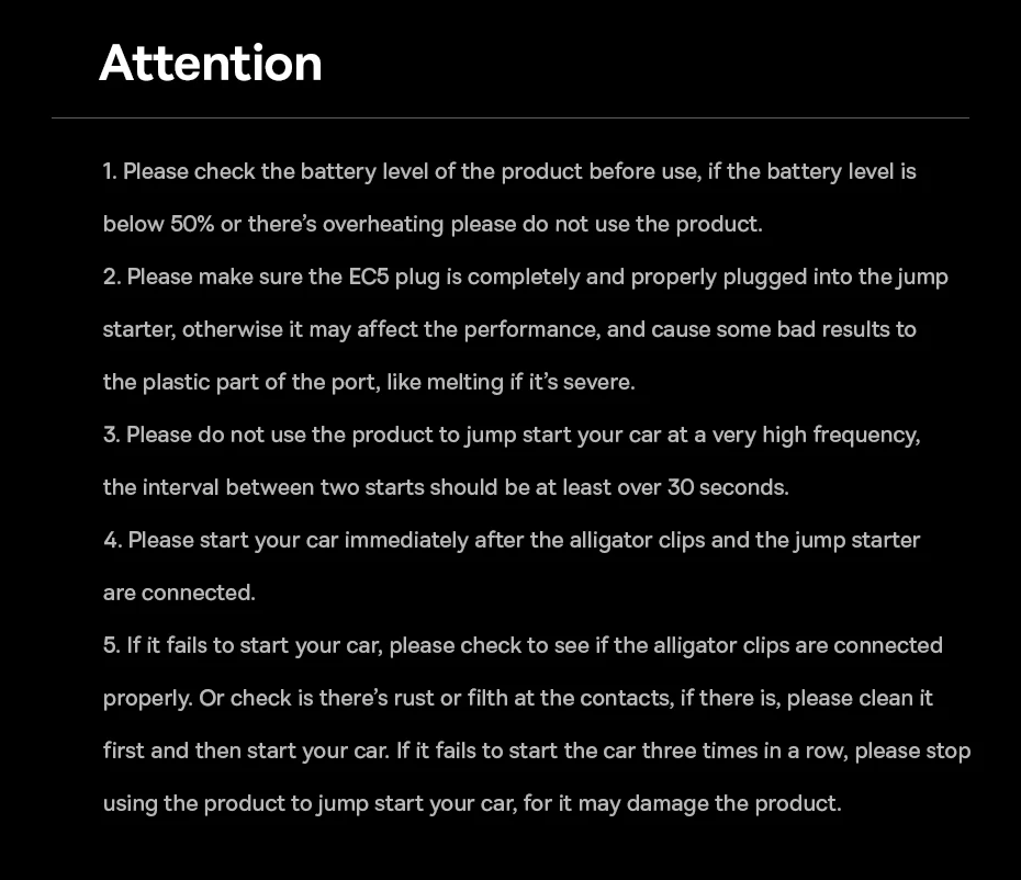 Note: For better effect, please make sure the battery level of the jump starter is above 50%; and for zero-voltage start, please make sure the battery level is above 75%.