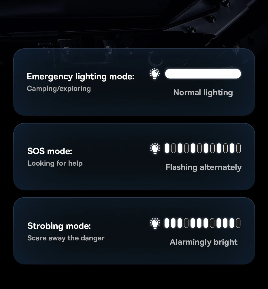 Equipped with an emergency LED light, which can be used as warning signals to keep yourself safe when you are in the middle of nowhere.