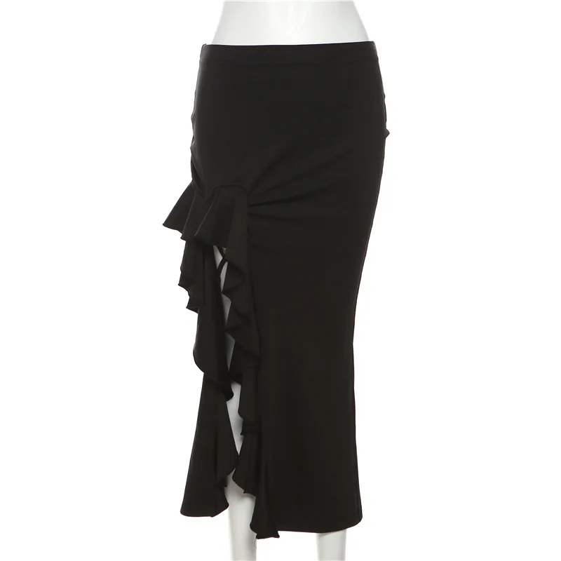 Юбка-миди женская черная трапециевидная с высокой талией и оборками