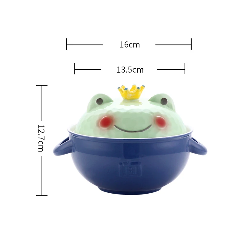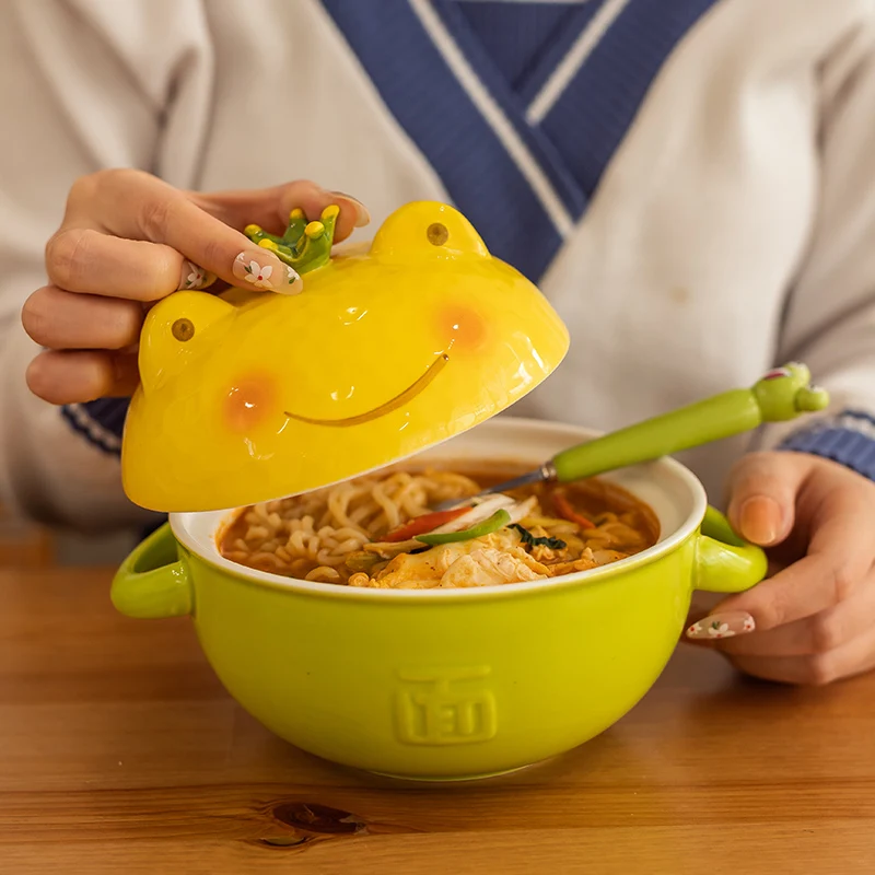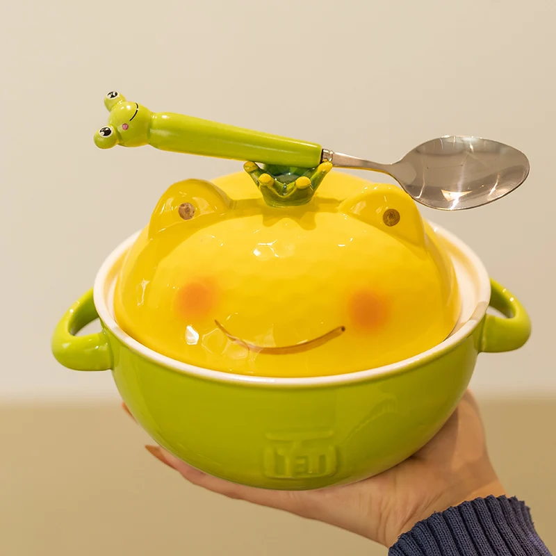700 мл керамическая чаша в форме лягушки для рамен, лапши, милая мультяшная посуда, Детская бинауральная чаша для еды, супа с крышкой и ручкой