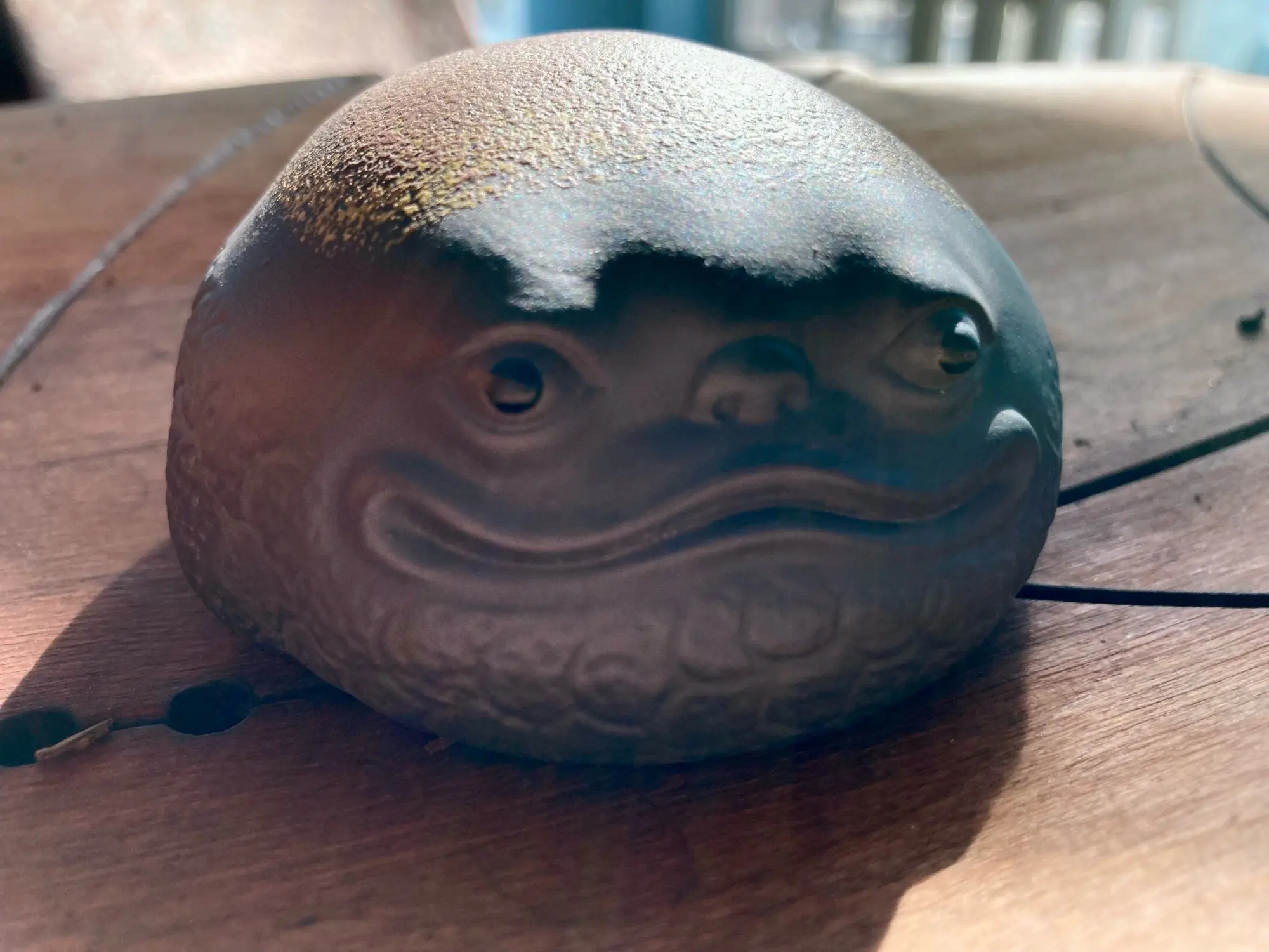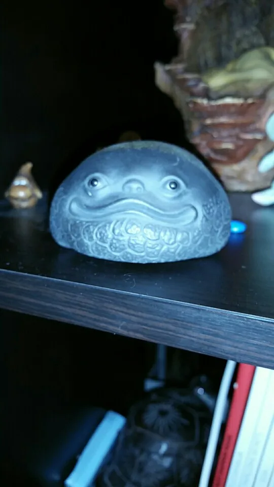 Жаба просто офигенная! Сзади есть какое-то отверстие, внутри что-то очень тихо звенит, если потрясти. Приятный вес, не очень лёгкая. Пришла быстро, упакована супер надёжно. Покупкой очень доволен.