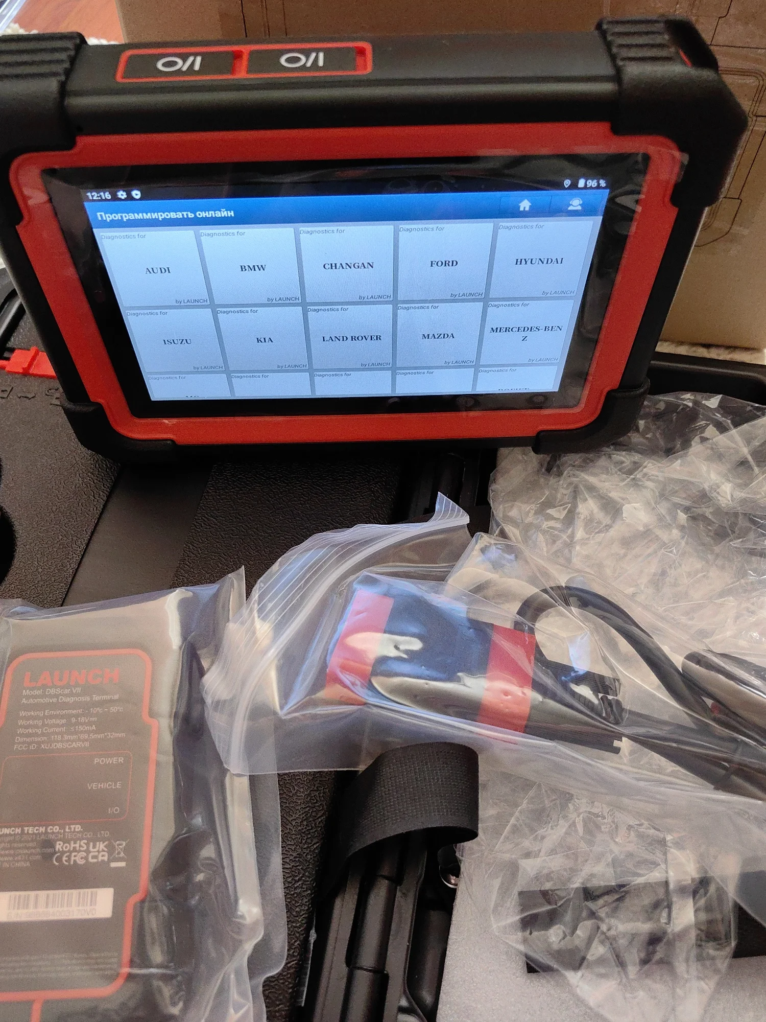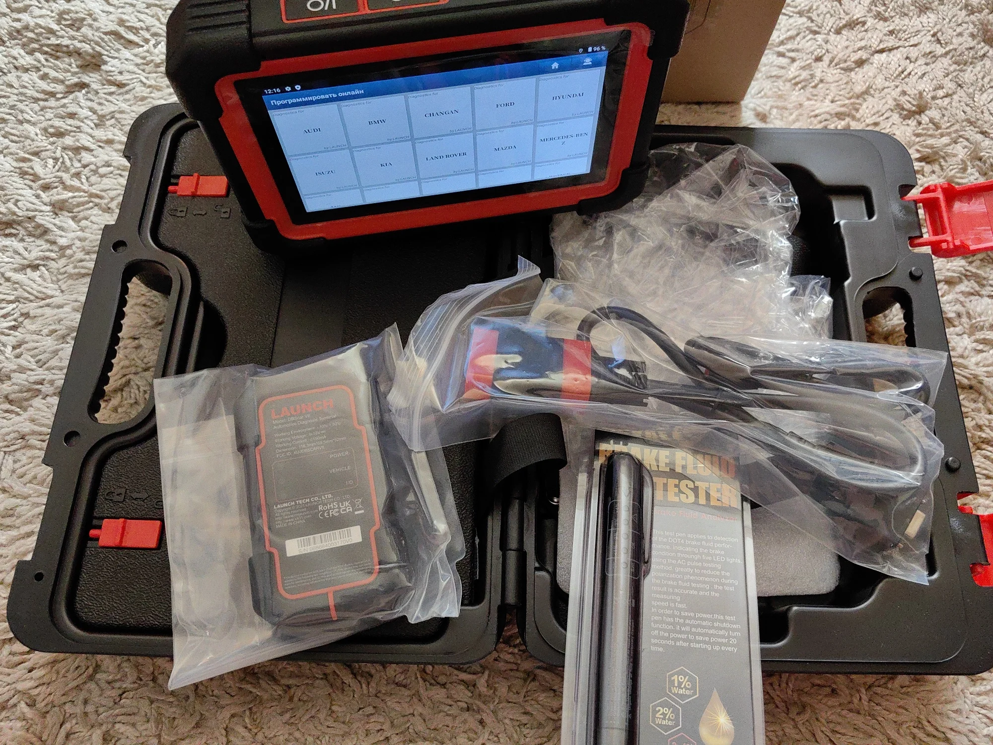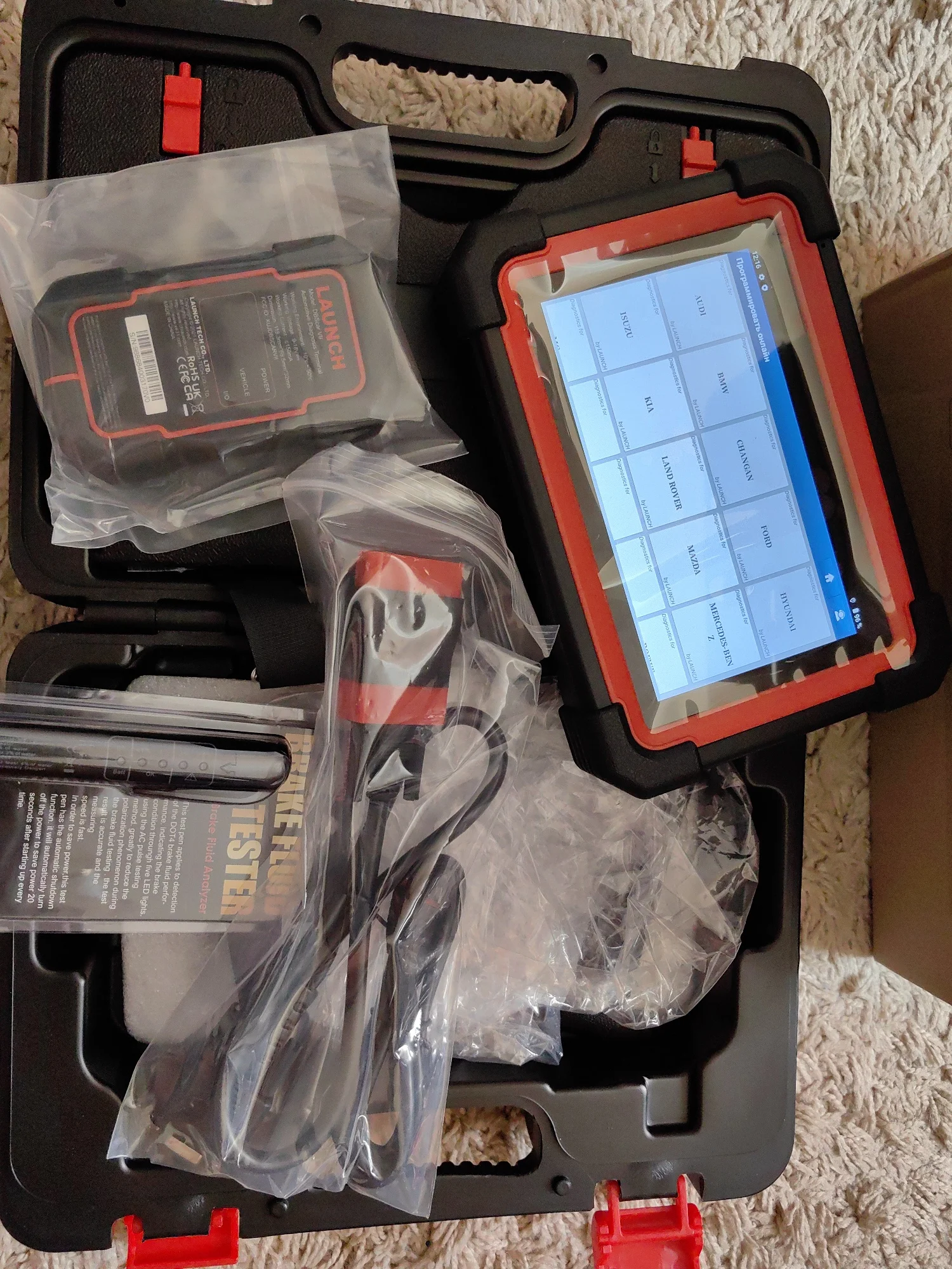 Первое впечатление «вау». Интересный прибор. Не сказать что быстрый, но и не медленный. Планшет тяжелее чем ожидал, это и оправдывает заявленная емкость аккумулятора. При первом включении показал заряд в 98%. Пока перевел язык, пока подключил и обновил и проверил уже 96%. Первый прибор такого рода в личном пользовании. До этого пользовался более дешовыми и «старухой». Заинтересовал племянника на диагностику(нужно ведь толком прибор узнать). Вычитал и вин и пробег и много интересного о машине в виде адаптаций и тестов исполнительных механизмов. Часа 2,5-3 «игрались» и посадили батарею планшета всего до 90%(активного использования). Из приятных моментов - при наличии интернета переводит меню и ошибки, а также можно найти информацию по ошибке в сети интернета. Пластик на ощупь приятный. Продавец в подарок положил тестер тормозной жидкости. Как ни крути, а приятно. Дошло за 11 дней(с момента заказа). Отправлено со склада в России(Подмосковье)