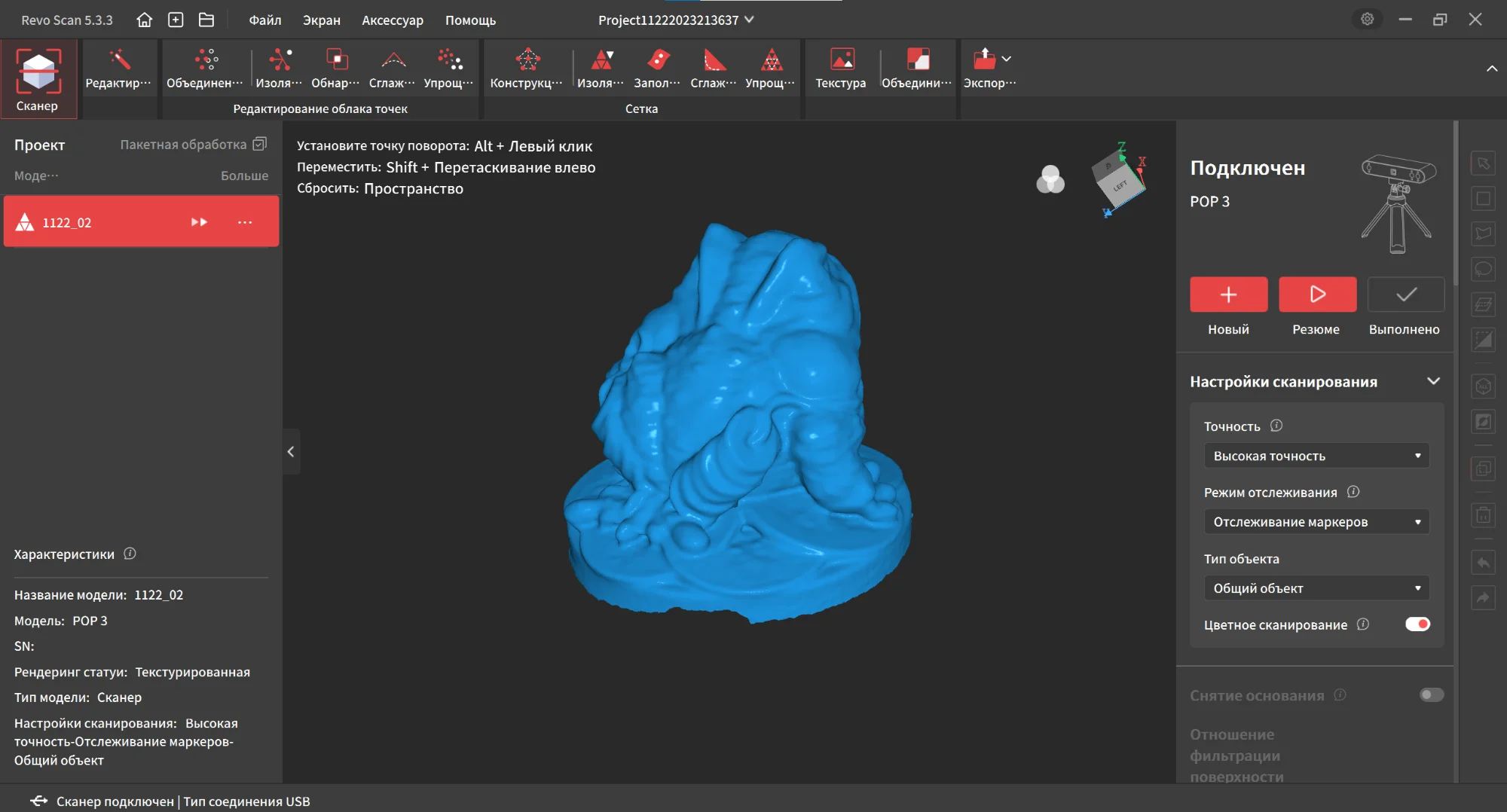 Мой первый сканер. Пять с минусом. Минус - быстро теряет трек, запаситесь маркерами. Ни плюс, ни минус - сканер очень плохо распознает черные и блестящие поверхности, с одной стороны - их придется сильнее матировать, с другой стороны - можно черными поверхностями отгородить предмет и затратить меньшее время на редактирование. Плюсы - на борту имеется Wi-fi 5 и 6(можно подключить как к ПК, так и к смартфону), детализация средняя, но для сканера за 50-60К - норм. Нормальное ПО для ПК(особых огрехов не заметил), для андроида ПО норм, но перевод на русский - машинный, у приложения на смартфоне количество кадров ограничено 3000, и сам смартфон должен быть мощным и иметь на борту WI-FI 5(а лучше 6). По маркерам сканирует нормально, без маркеров нормально сканировать не смог, может оно и к лучшему. Для реверса и дальнейшей печати сложной по форме технички - очень хороший инструмент за свои деньги. Для продажи сканов - лучше взять что-то подороже.Dmitry R. 26 сентября 2023