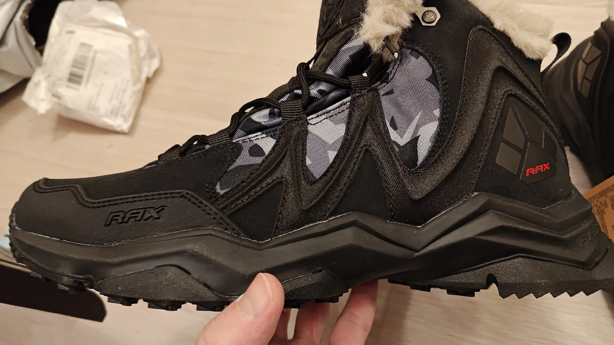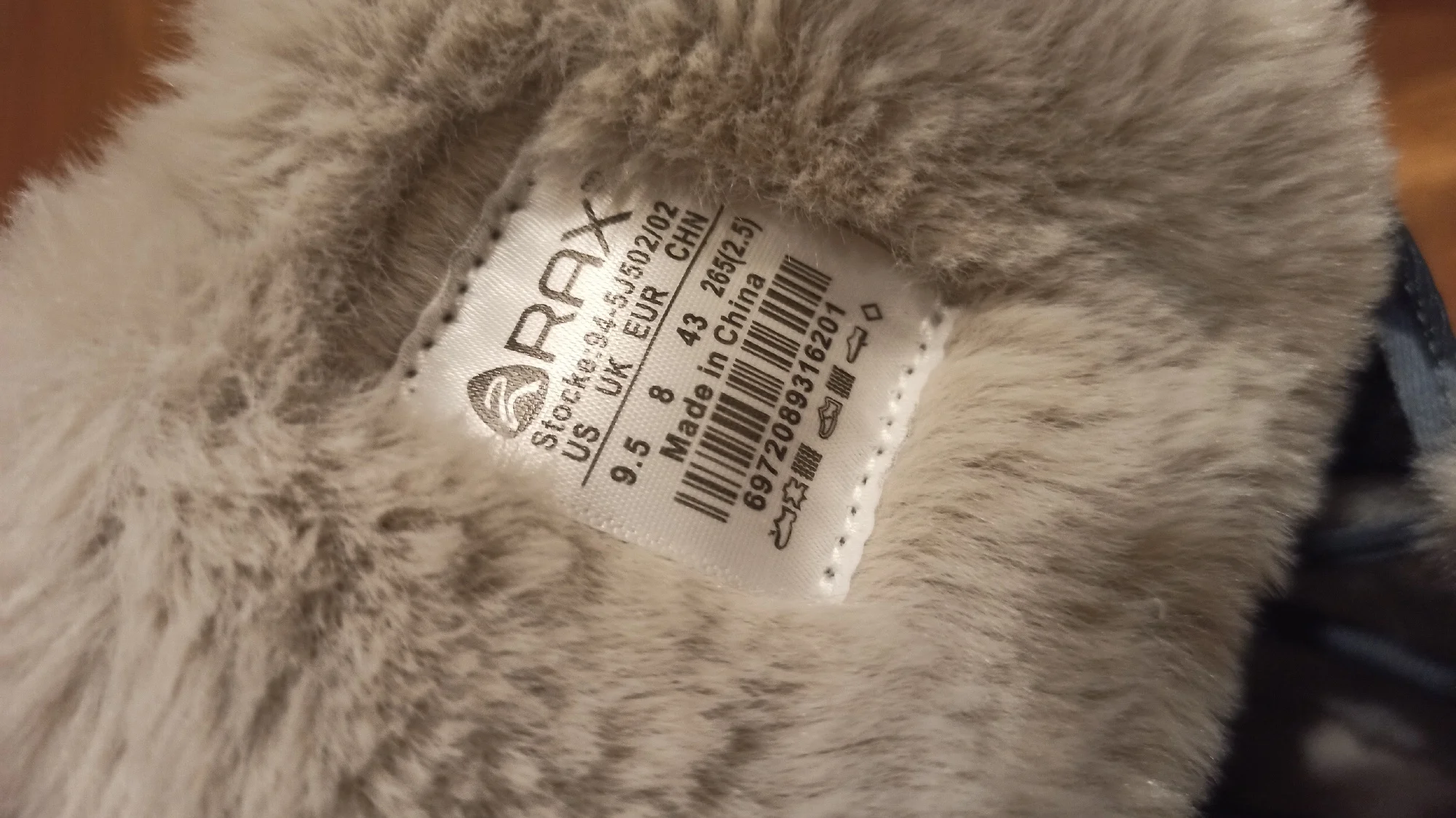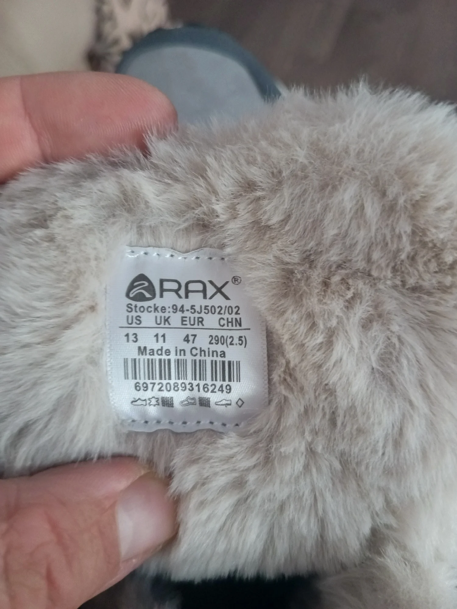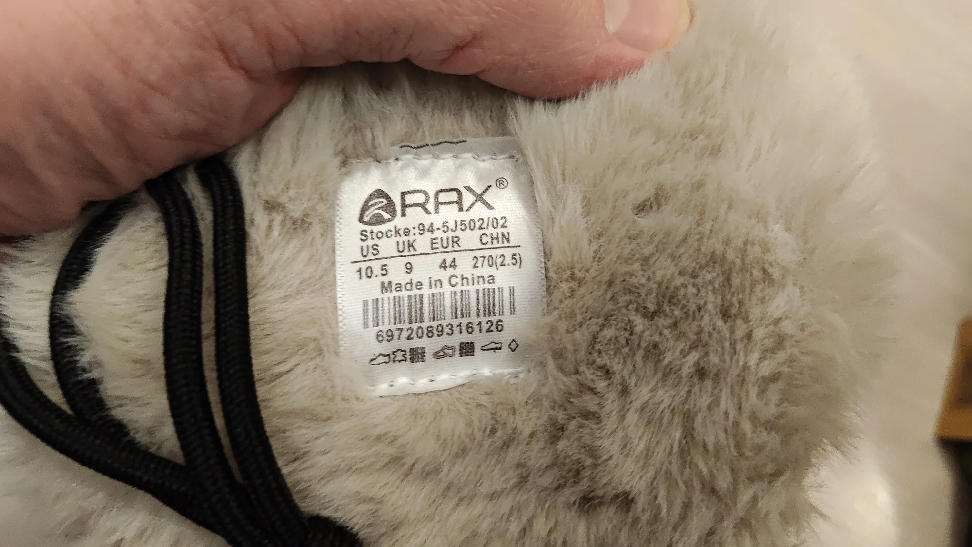 Признаться честно, я первый раз покупаю для себя RAX но много наслышан об этом бренде. И у друга есть летние кросовки RAX он очень доволен. Вот и я захотел стать доволным, и заказал себе обувь на зиму. 18 ноября заказал 25 получил, просто прекрасно. Когда распокавал два фирминых пакета и увидел обувь, сразу же промелькнуло в голове что они классные, и я не ошибся, мех очень мягкий, нежный такой, сами кросовки очень лёгкие, и ноге в них приятно. По квартире походил всё нравится, на улице ходить ещё жарко, думаю тепые будут. Нога у меня 27 см брал 43, и не прогодал, но я ношу зимнию обувь на летний носок, и мне кросовки почти в притык, но не жмут. Для тех кто на шерстяной носок носит, лучше взять на размер болше.