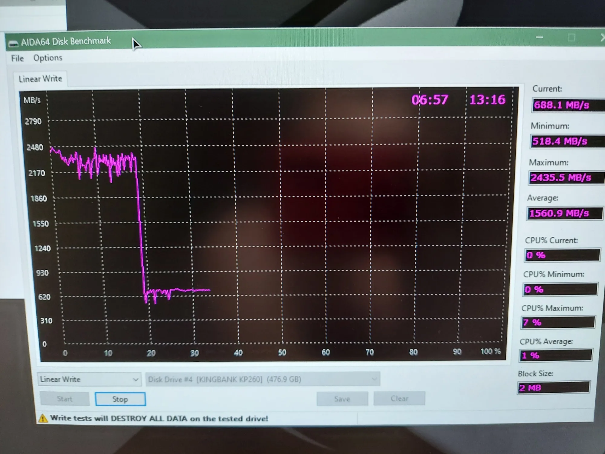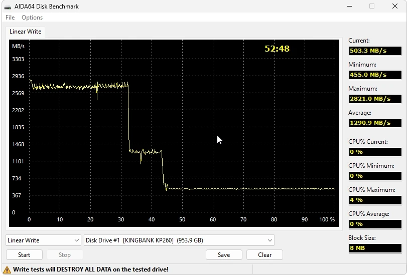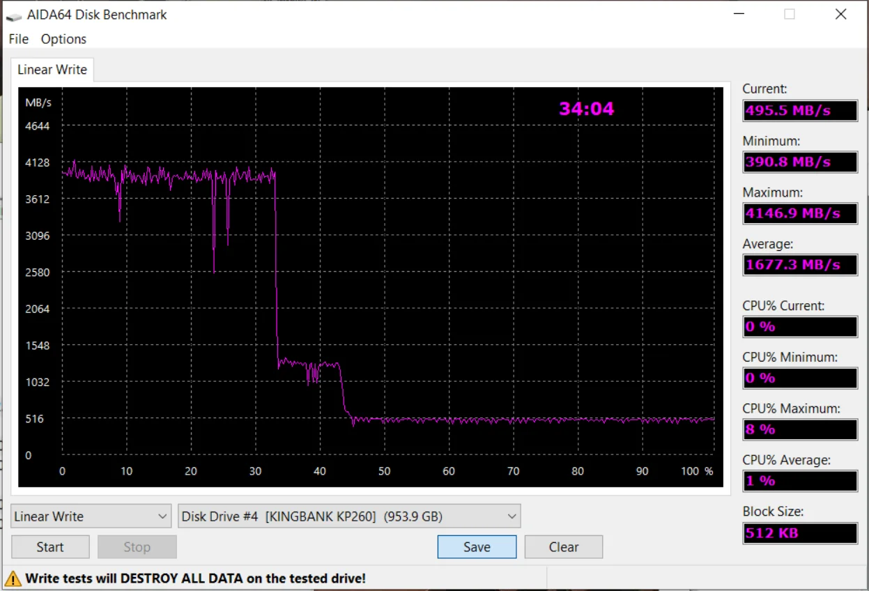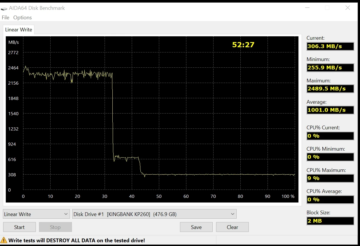 Все как заявлено. SLC кеш 33%, далее 310 мб/сек запись, см график. При реальном использовании мне этого хватает. У диска было 1 включение и следы соответственно от него на дорожках. За свои 1700 р на распродаже это топ. Рекомендую!