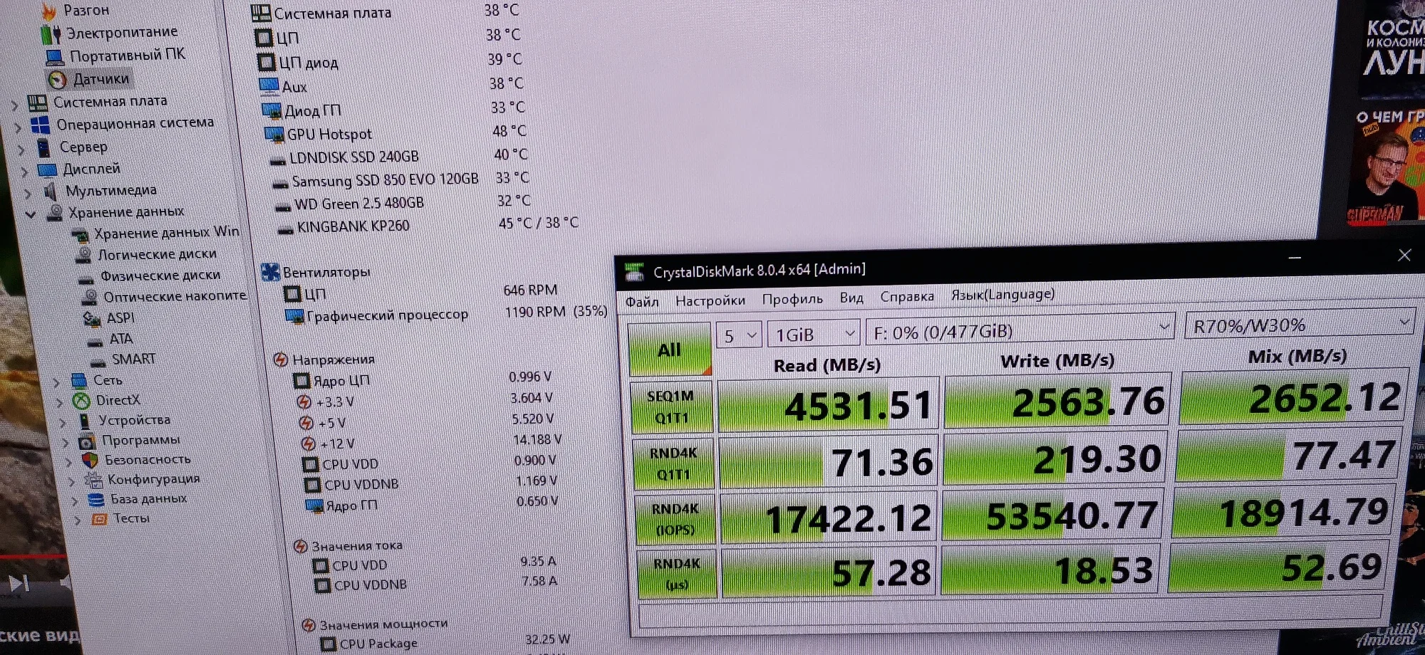 доставка приемлемая 19 дней думал больше,упаковка просто пакет но на удивление все целое хоть в подарок. пломбы на упаковке товара целые. читал комментарии мол показывает температуру в реальном времени???? вероятно где 4 чипа памяти,но на этом температура заблокирована на 40 градусов Цельсию Тестировал на материнской плате с поддержкой PCIe 4.0x4 реальный результат на фото☝️ Память TLC Короче пока подвоха не обнаружил, возможно в дальнейшем при эксплуатации обнаружиться время покажет Всем огромной удачи