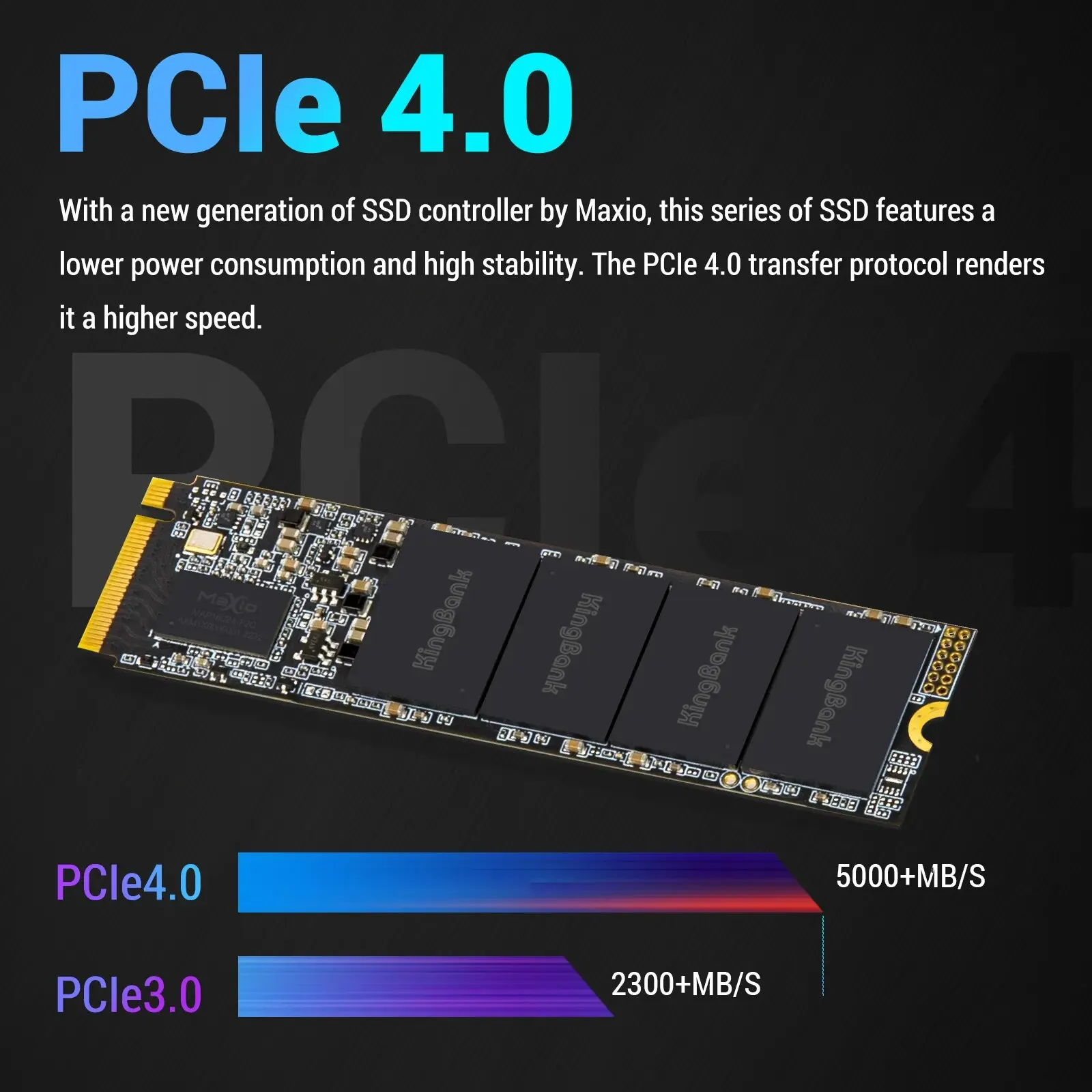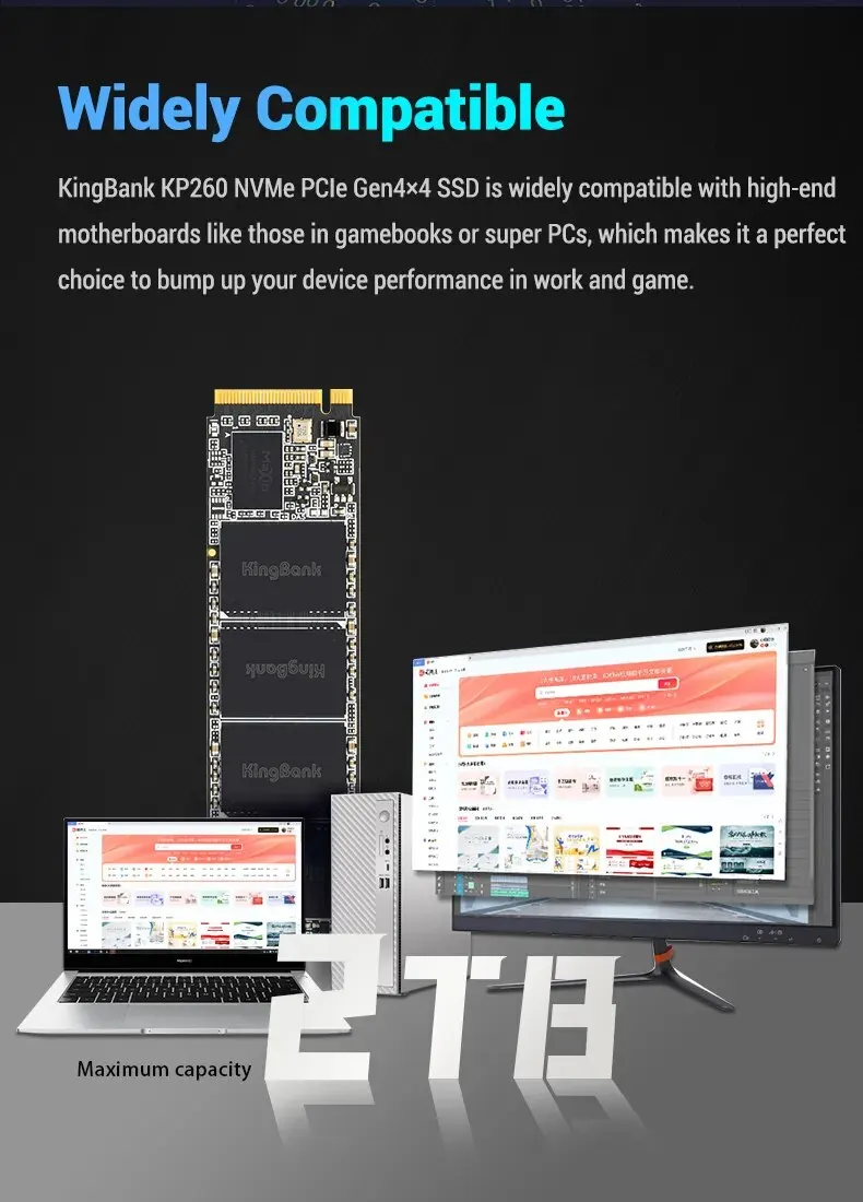 • Тип шины PCIe 4,0x4 :Твердотельный накопитель Kingbank, оснащенный шиной PCIe 4,0x4, гарантирует высокоскоростную передачу данных и превосходную стабильность.