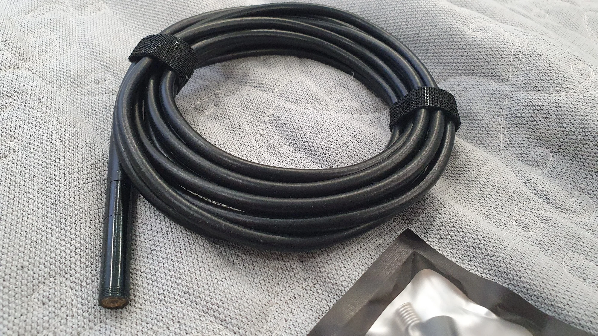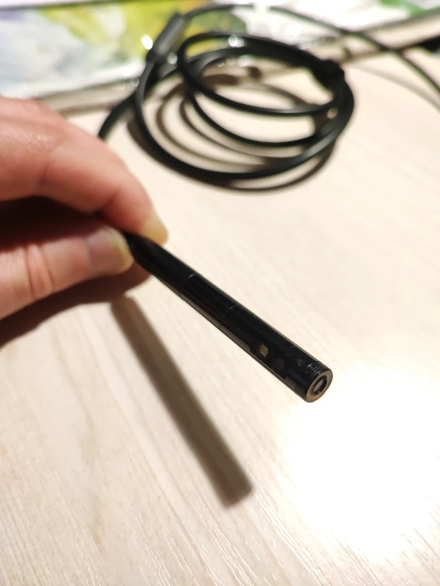 Реализация интересная, но из-за большого объёма потока подтормаживает (фото 1). Запись видео 11-15 кадров/сек. Светочувствительность камер ниже среднего, при ярком освещении количество шумов на изображении меньше. Жесткость кабеля приемлемая, при полностью выпрямленном кабеле в вертикальном положении составляет примерно 100-120 см с отклонением 7-10 см. Тяжелее "протяжки" и не такой упругий. Разрешение камеры как и заявляет продавец. Размеры и разрешение файлов на фото