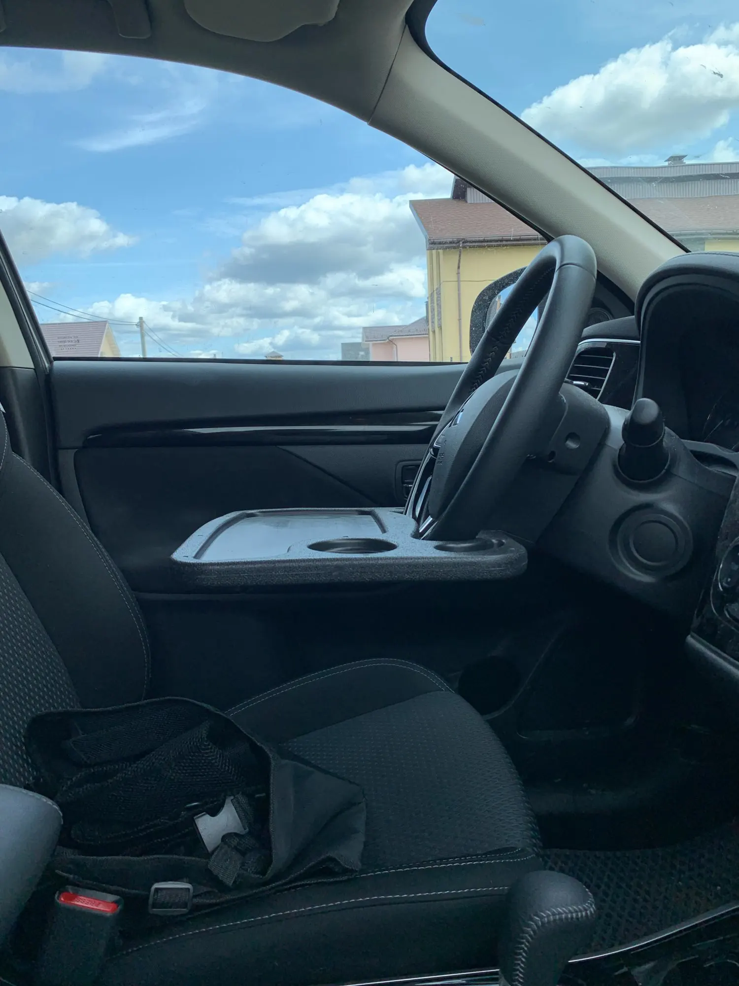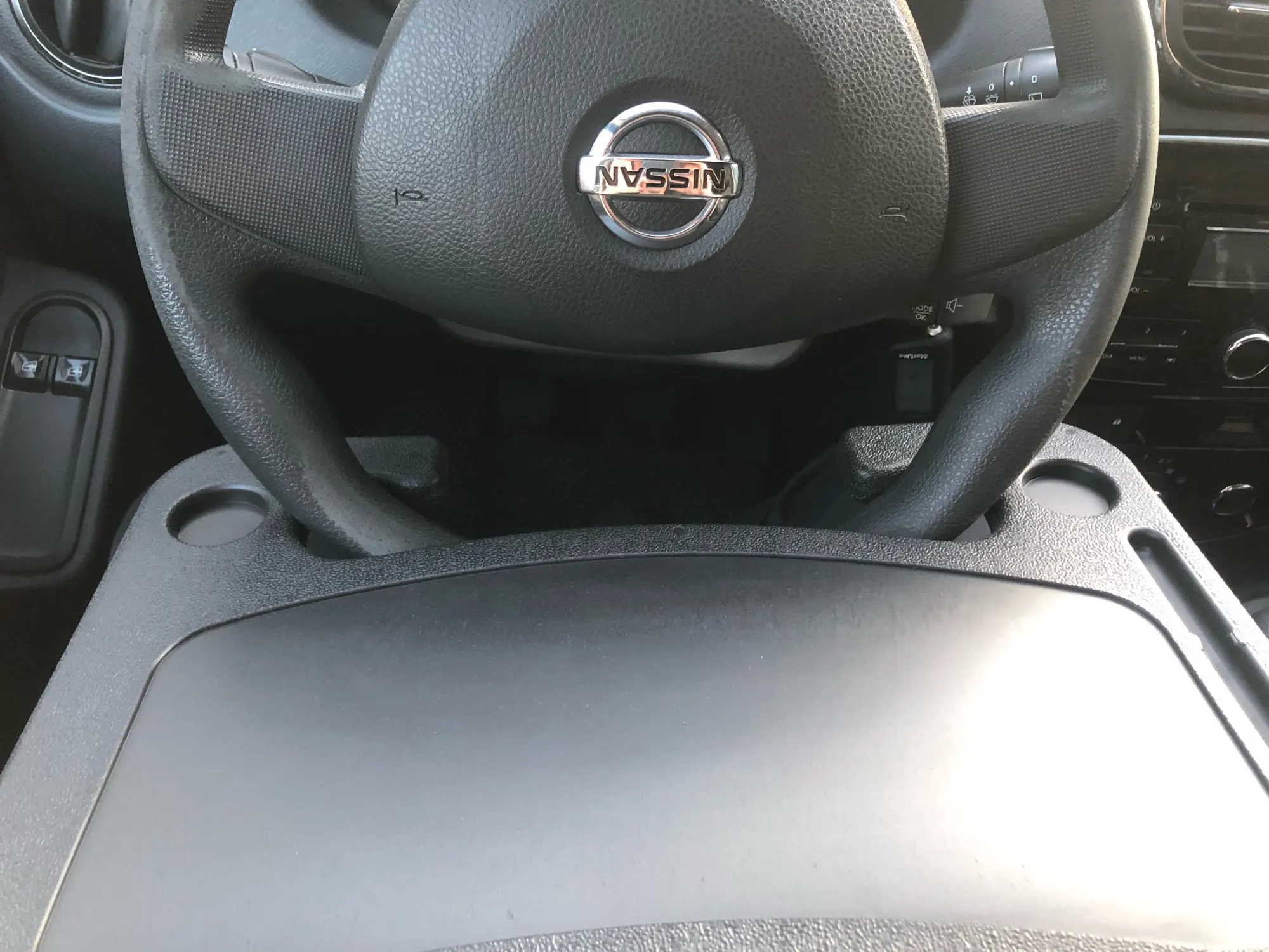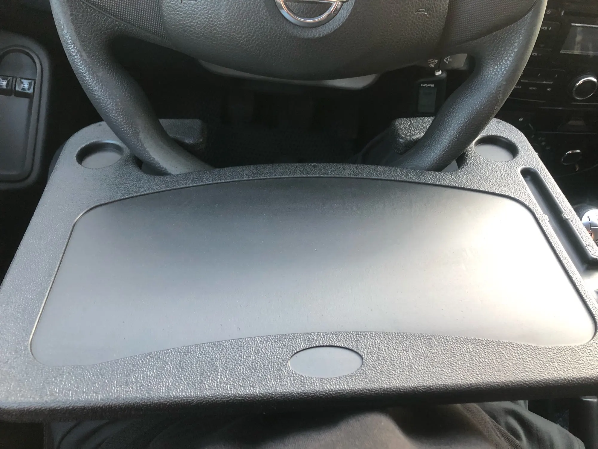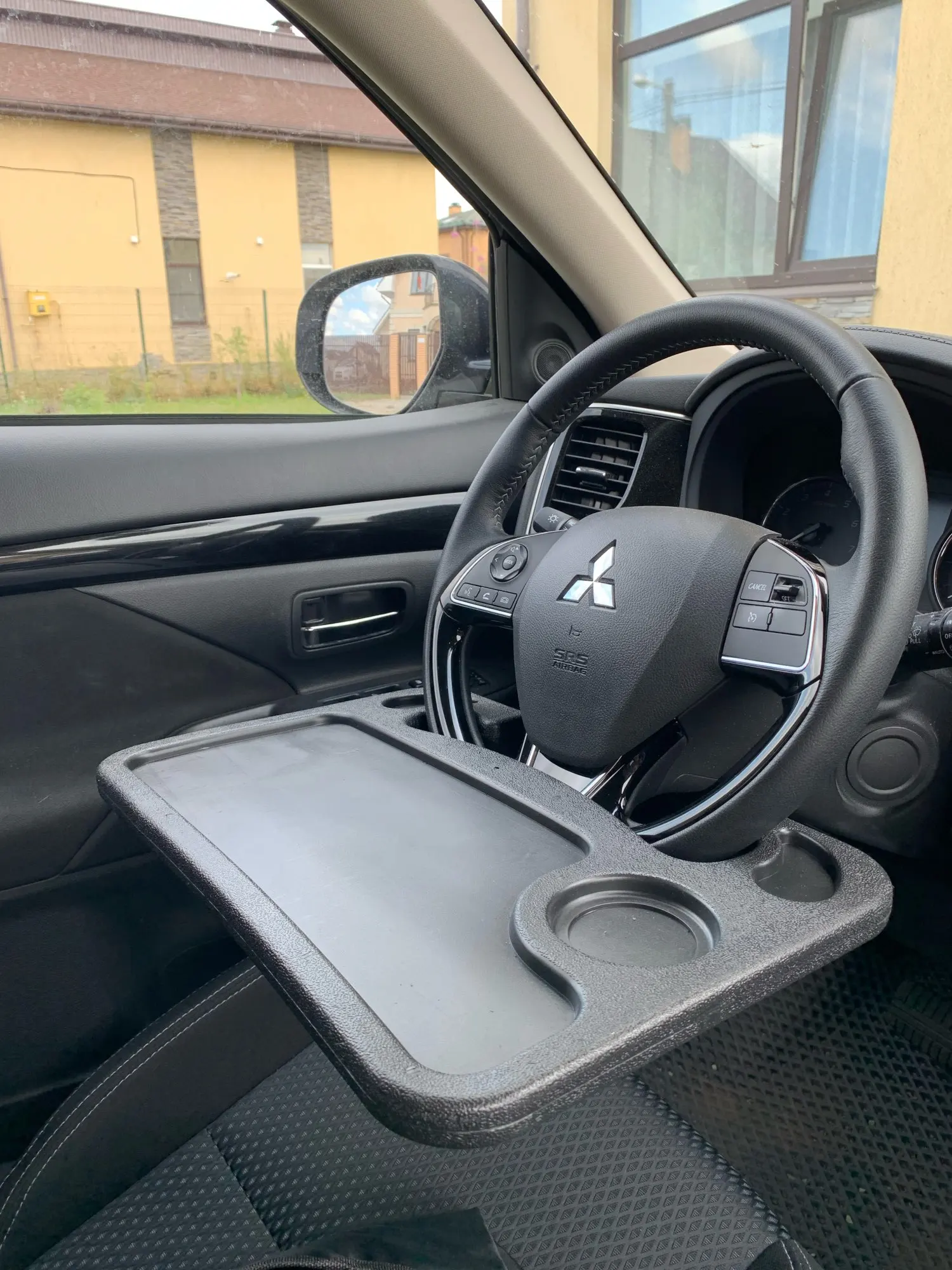 Столик на руль Mitsubishi Outlander встал хорошо. Но есть ощущение что он может царапать обтяжку руля. Лучше проклеить изнутри чем-то мягким.