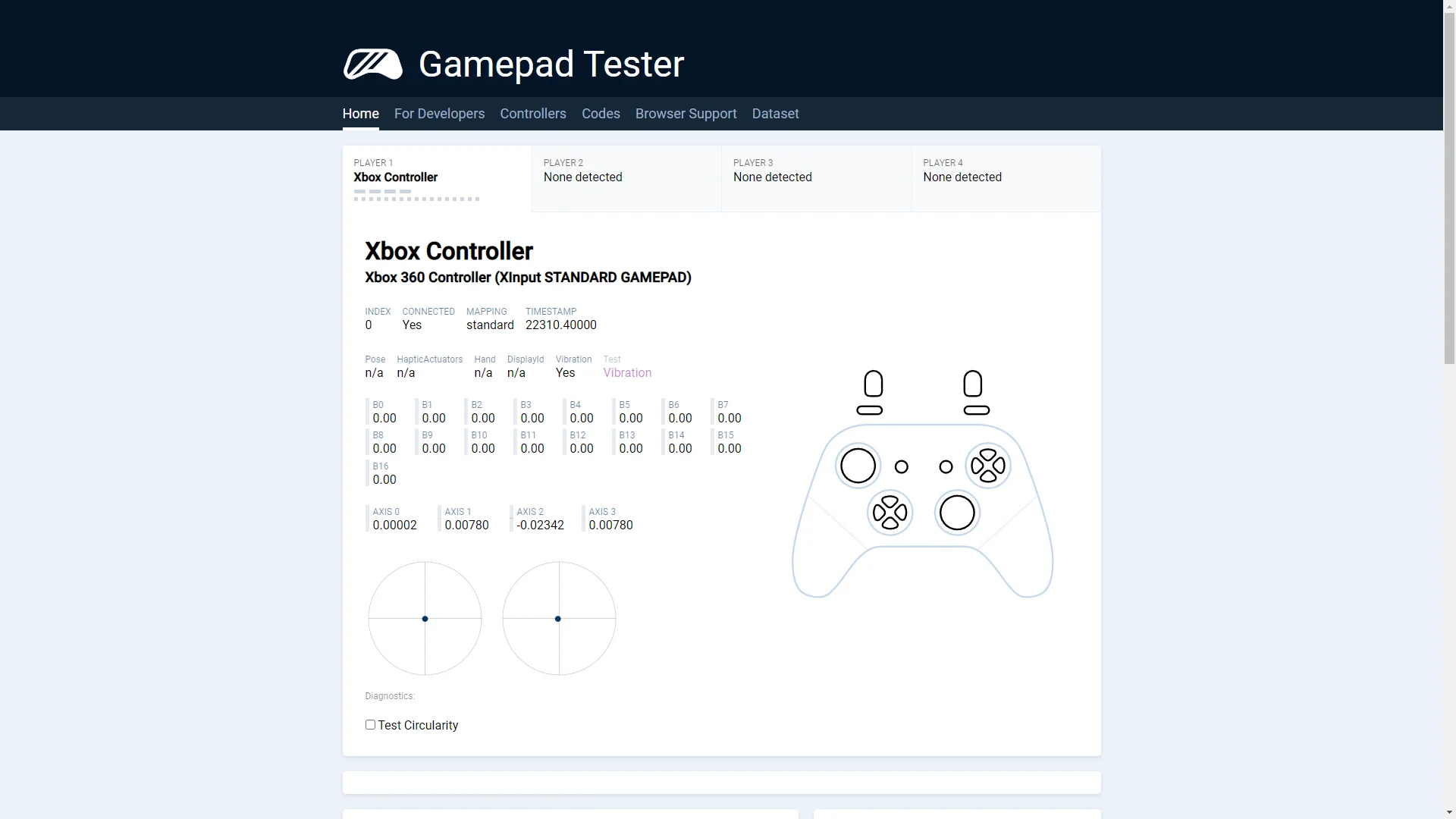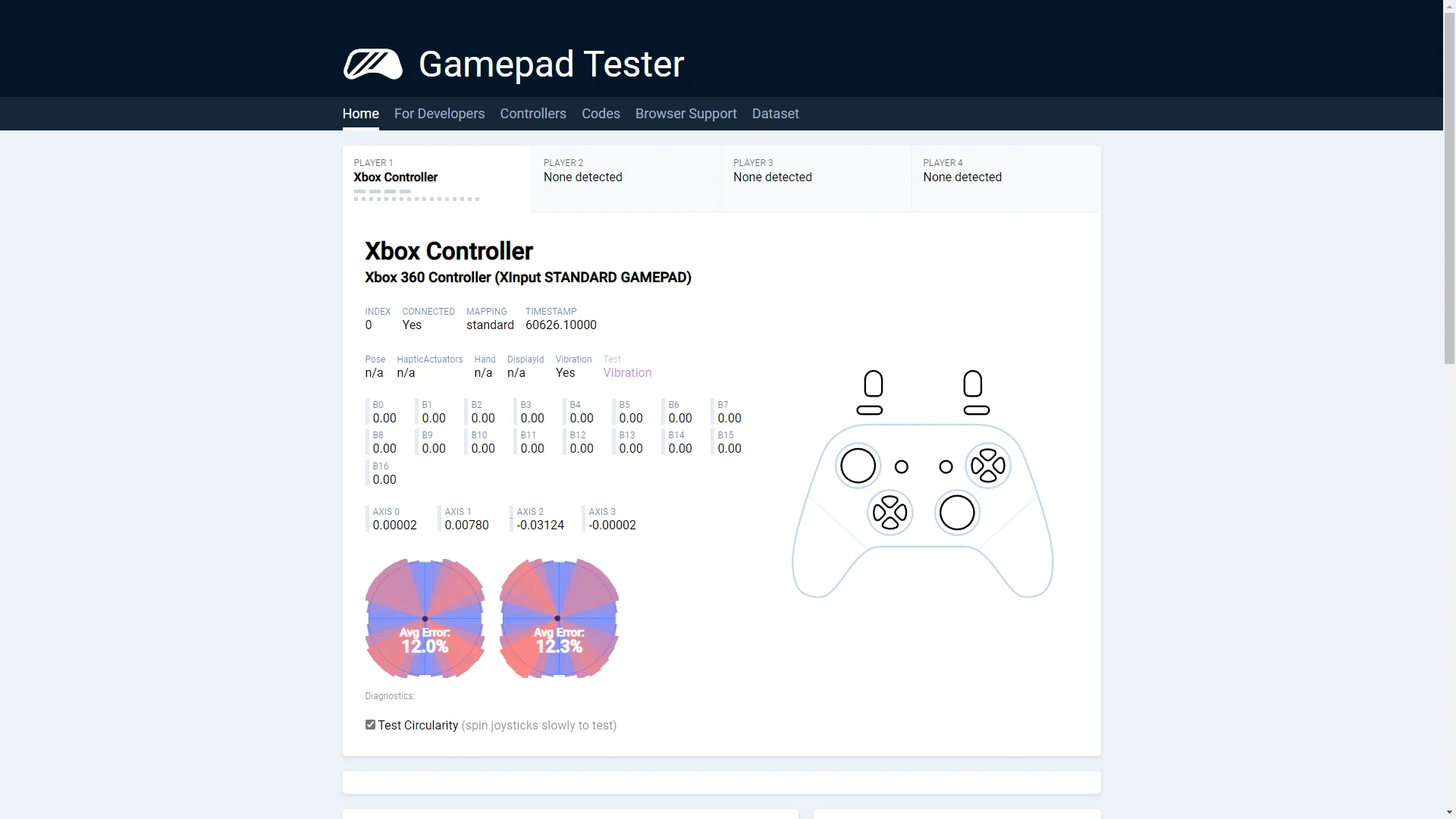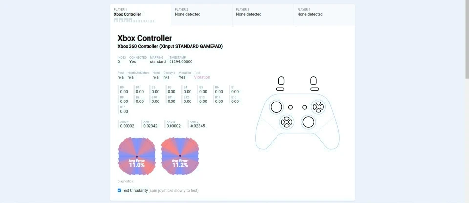 Хороший геймпад, который портит программная часть. Сборка хорошая, но при тряске слегка звенят кнопки. Крестовина имеет короткий ход, нажимается чётко, требует привыкания. Бамперы и основные кнопки нажимаются немного громковато. Триггеры упругие, нажимаются приятно, степень нажатия чувствуется хорошо. Стики. Вот тут и начинаются проблемы. Сам ход стиков при отклонении отличный, мягкий, приятный, по окружности возить легко, благодаря металлическому кольцу, но есть привязка к осям, причём только в крайних положениях, в играх не чувствуется, окружность не очень точная, есть смещение от центра у правого и совсем чуть-чуть у левого, но дрейфа при этом нет (пример на скринах). Причём после калибровки стиков, стало хуже, а её рекомендовали делать, как для PRO версии, так и для этой. Еще заметил странность, в тестах мёртвых зон нет, но в играх небольшая есть, причём только у левого при отклонении влево. Тестировал в Dark Souls, там и заметил. Остальное дополню отзывом, так как сюда не влазит.