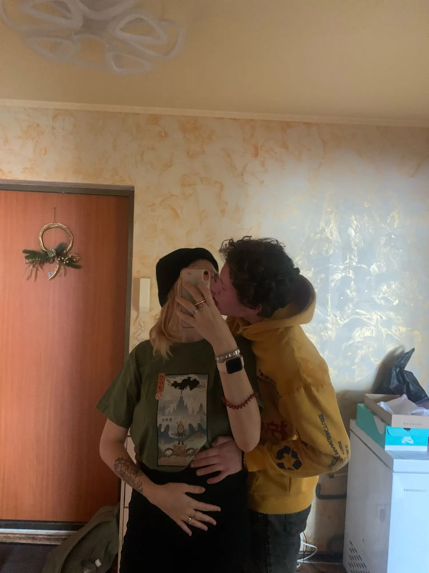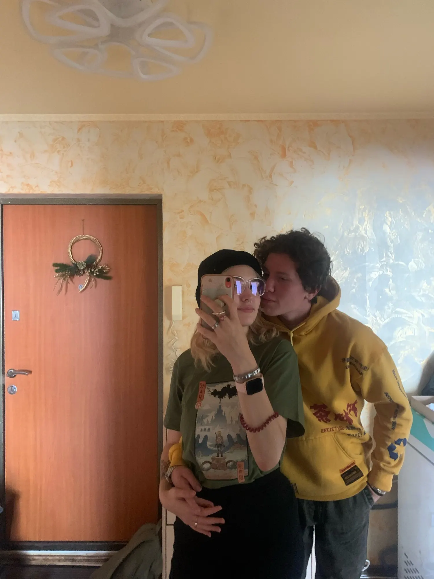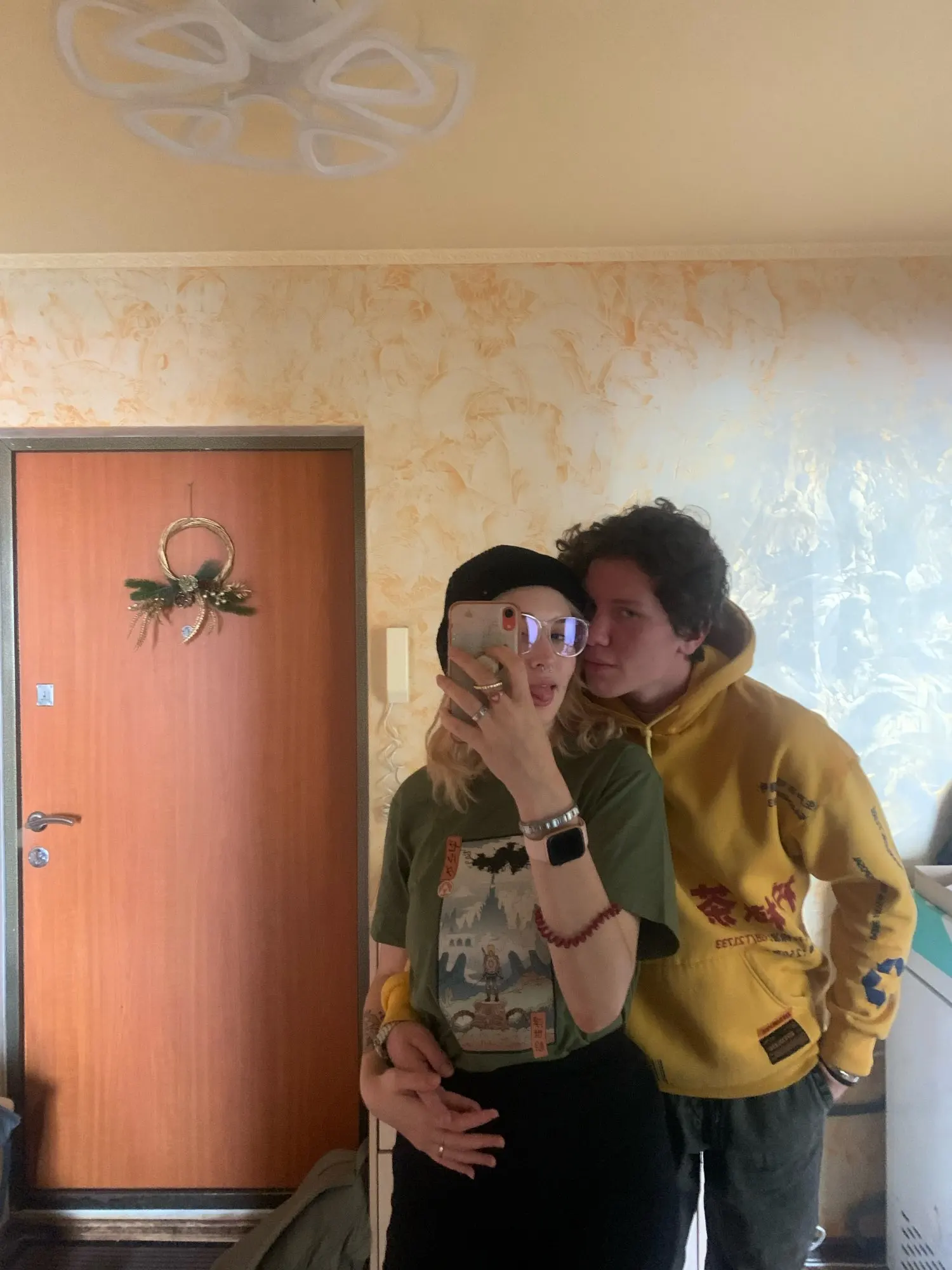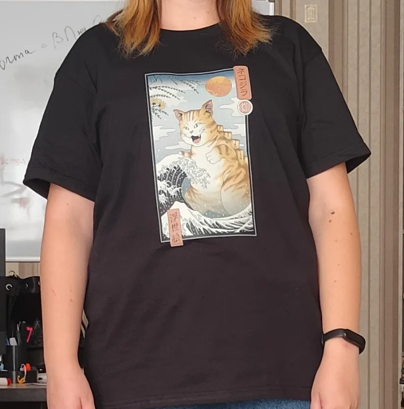 Пришла немного позже назначенного. Футболка примерно 50% хлопка, длинная. Наклейка полное разочарование: качество картинки ужасное, наклейка приклеена полностью и по материалу как клеёнка и ощущается так же . Размер М на ог 84 свободно.
