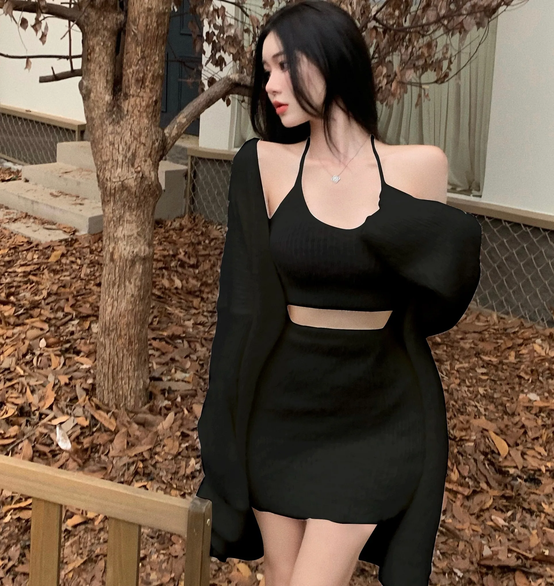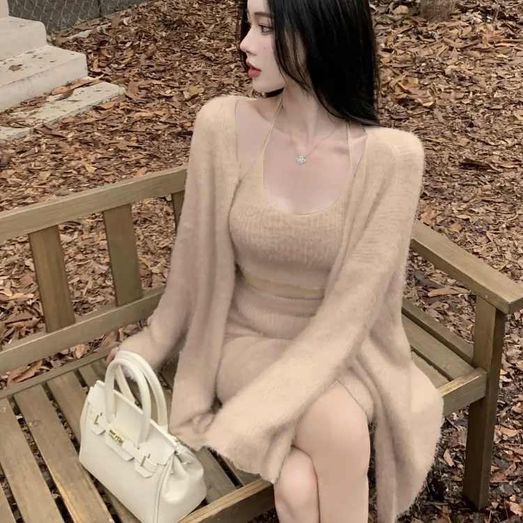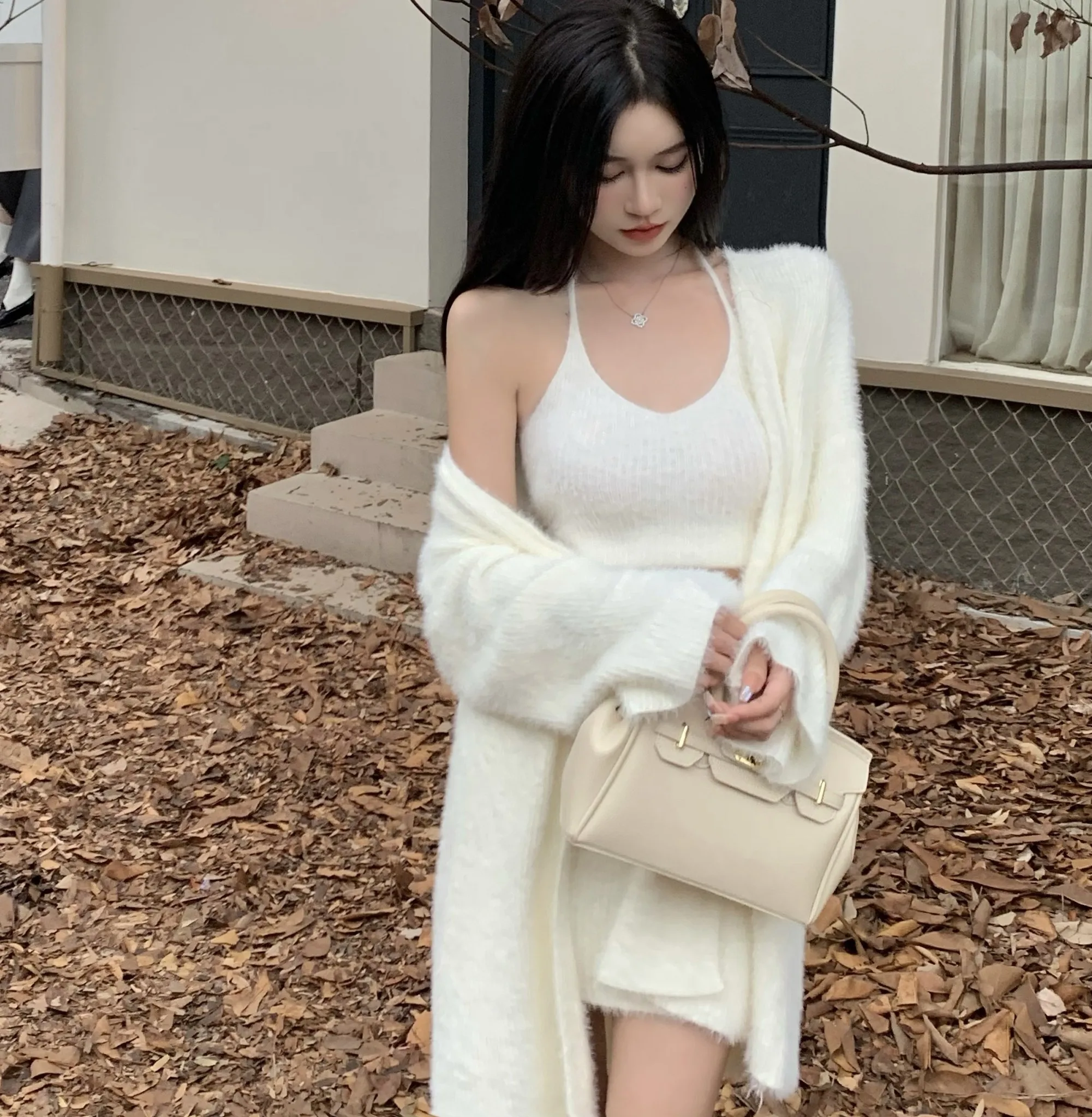 Женский трикотажный комплект из 3 предметов, корейский кашемировый кардиган с V-образным вырезом и длинным рукавом, пикантный жилет и мини-юбка, Осень-зима 2022