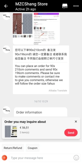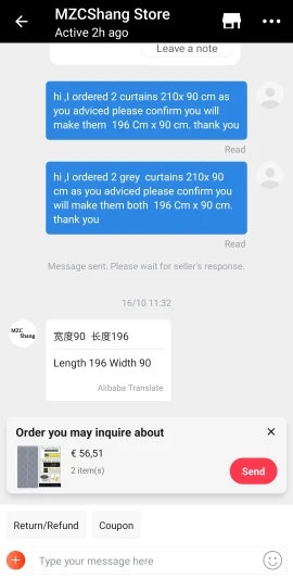 Я попросил продавца сделать шторы 196 см, что она подтвердила дважды. По прибытии мне было ясно, что ничего не было сделано. Я пошел к местному портному и спросил у него цитату. Он сказал € 20 для обоих. Поэтому я попросил скидку на эту сумму. Продавец отказался. AliExpress помог мне принять решение вернуть мне 20 евро. В целом, доставка быстрая, хорошее качество, AliExpress очень хороший, продавец, плохой????