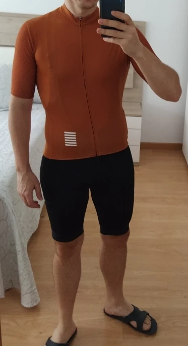 Доставка менее чем за две недели. Печать без даже тестирования на пути. 174 см, 70 кг, 90 см грудь. Maillot color ochre/gold/коричневый Размер M, мне они не очень плотные, я думаю, что получил правильный размер. Выглядит хорошо и свежо. Карманы, нормальные 3 и маленький на молнии, без тестирования на пути, находятся далеко сзади (вы можете увидеть это на фото с помощью рулетки)