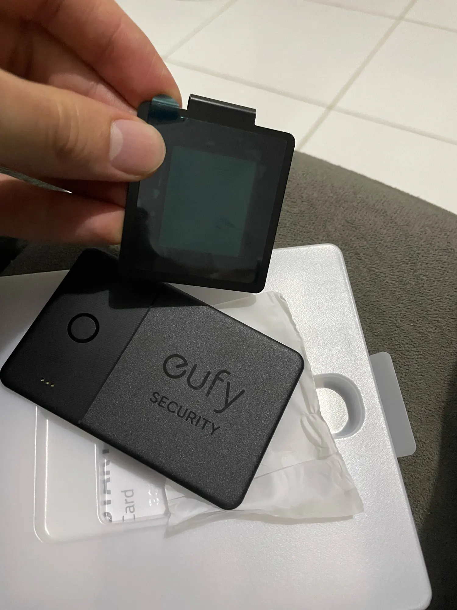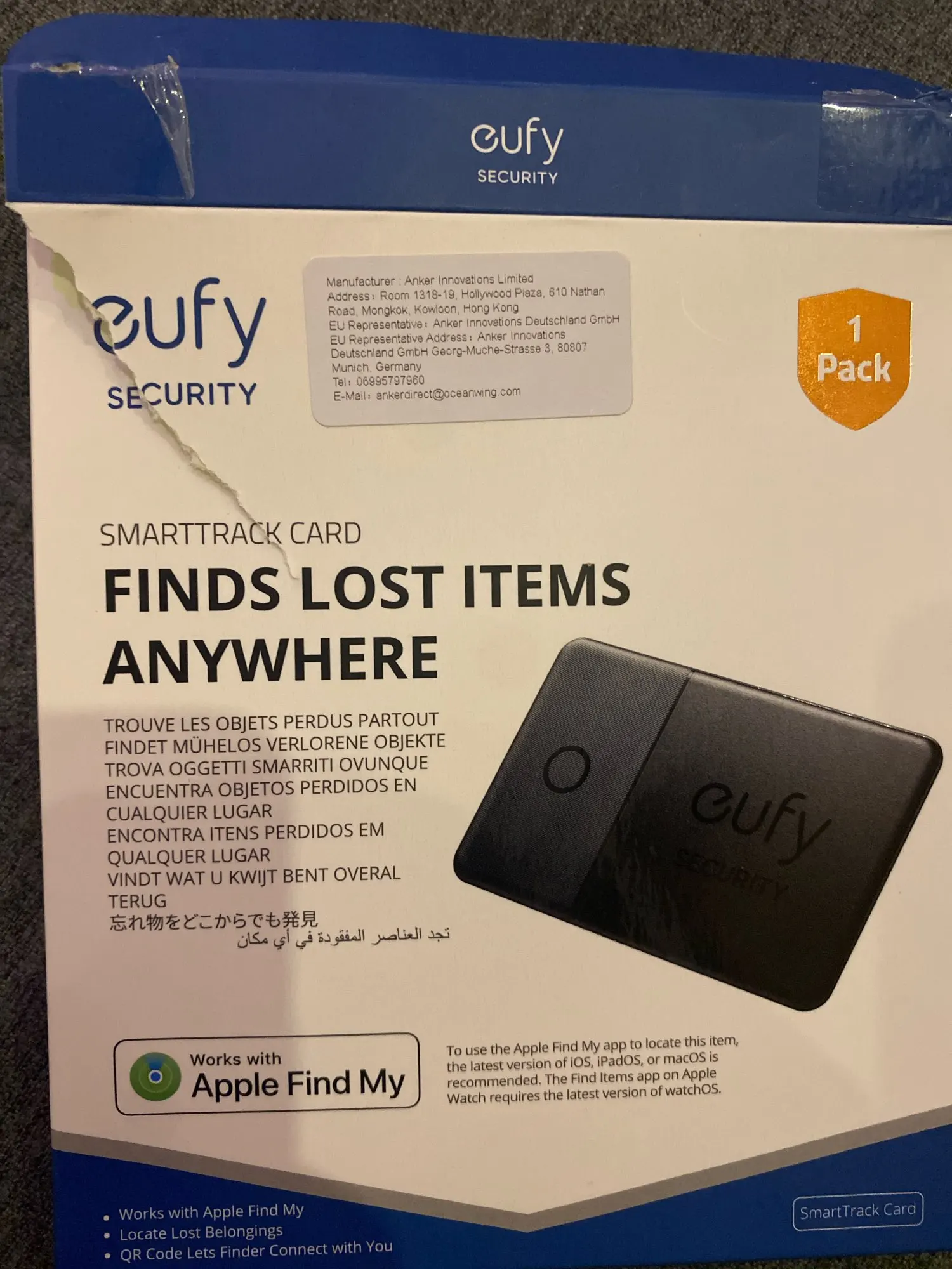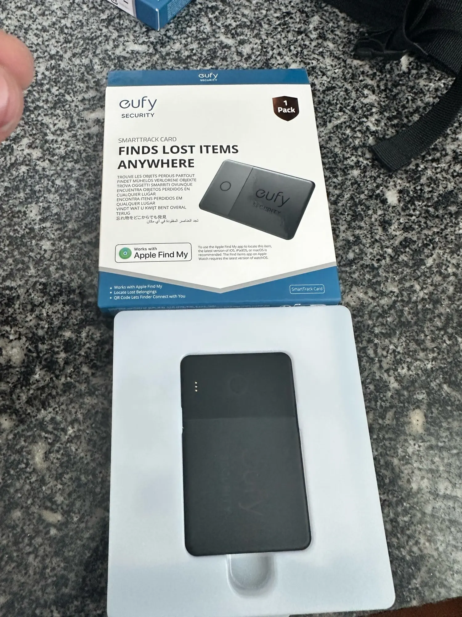 Карта поставляется в конверте с воздушными пузырьками с хорошей подкладкой. Действительно профессиональная упаковка. Приложение Eufy не нужно для отслеживания (только для нажатия кнопки на карте, чтобы позвонить на телефон). Настройка карты с помощью fin My очень проста, все, что вам нужно сделать, это удерживать кнопку в течение 3 секунд и нажать кнопку add new device в приложении fide My. Толщина карты составляет всего 3/4 мм, размер кредитной карты. Единственным недостатком является то, что аккумулятор не заменяется, поэтому, когда он разрядился, его нужно выбросить.