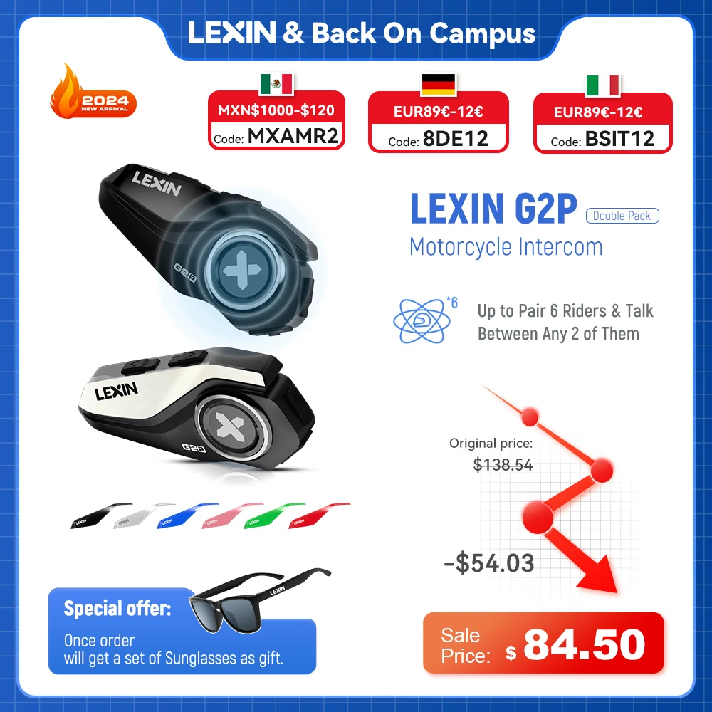 2023 Lexin-G2P Мотоциклетный шлем Bluetooth-домофон До пары 6 гонщиков и дизайн с большой кнопкой Сменный узор Корпус 120 км/ч