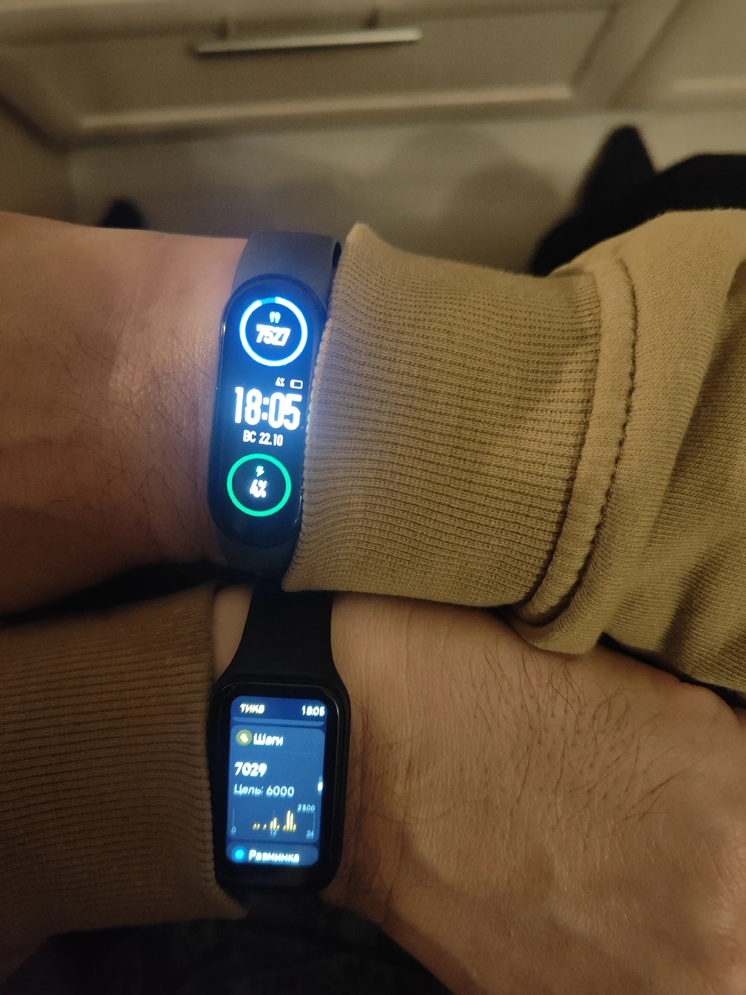 Посылка дошла до М.О. за 3 недели. Трэк отслеживался, но почта России сделала всё чтобы не доставить за обещанные 2недели. Часы хорошо показывают время, боюсь на этом все прелести заканчиваются. Запустив часы вы должны установить приложение, на это ушло больше суток. То почта не нравилась, то регистрировать не хотела. Подключив решил сравнить с показаниями Mi Band 6. На фото видно что браслет насчитал на 500 шагов больше. Пробовал одеть наоборот, разница за день составила 450 шагов. Используя знакомую тропу могу уверенно сказать что шаги часы не досчитывает. Пульс вроде мерит точно, сообщения телефона выводятся все. К сожалению нет возможности отключить как на браслете не важные, и сделать значки покрупнее. Не нашёл настройки автояркости, по этому на ночь приходится снимать. Зачем-то в приложении есть кровяное давление, но замерить часы его не могут. Как и не могут измерить уровень стресса, или это я такой стресоустойчивый))). За 3 дня так и не показало ничего. За три дня аккумулятор разрядился с 65% до 20%. Но поскольку зарядка ещё заводская судить о чем-то ещё рано. Вобщем как часы с возможностью смотреть сообщения с телефона вполне не плохи, если у вас 100% зрение.